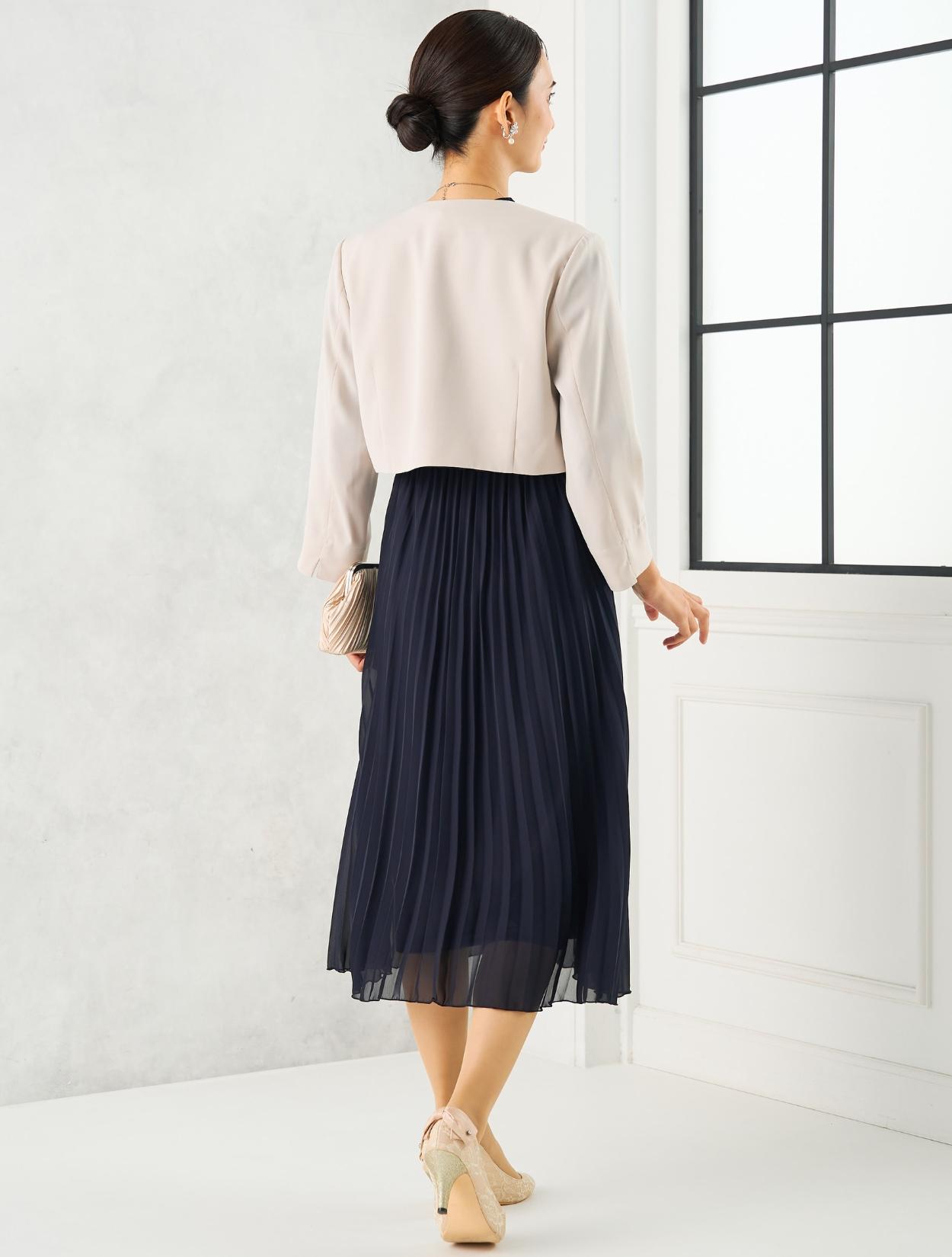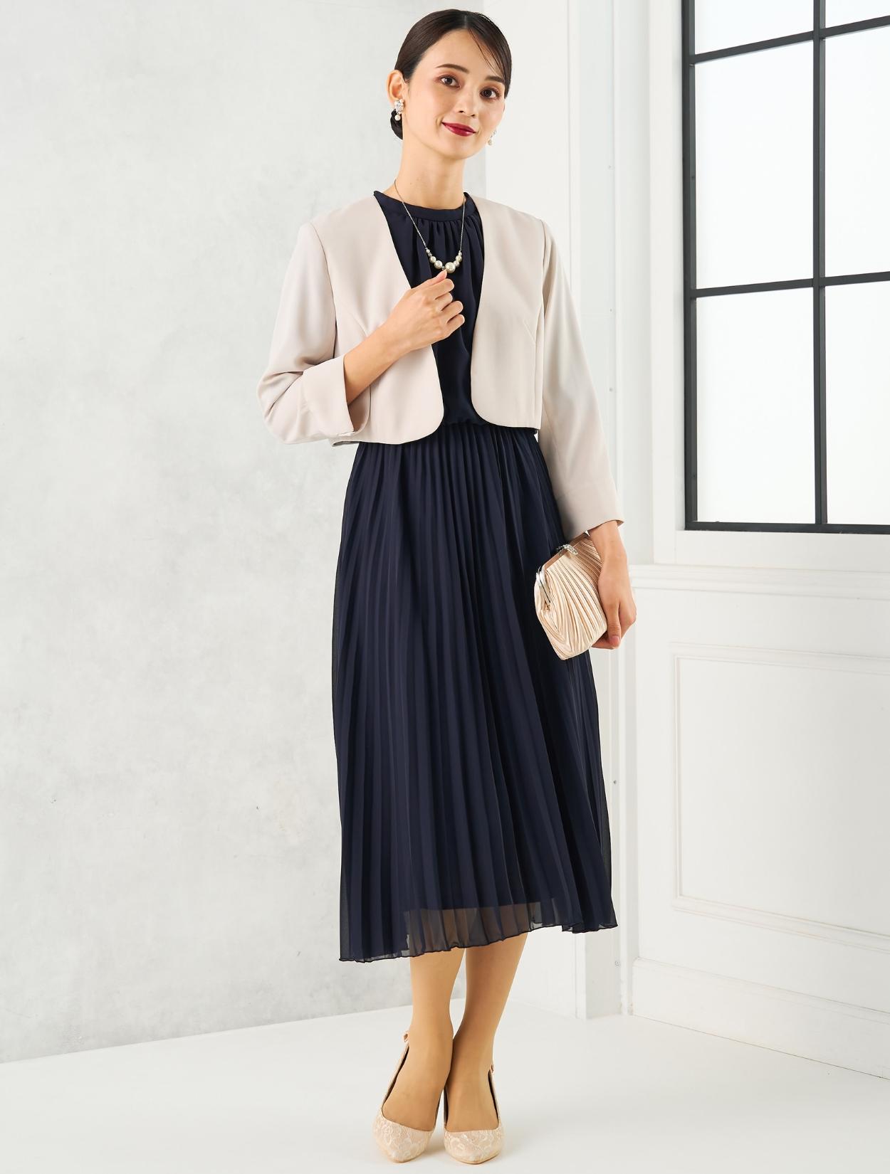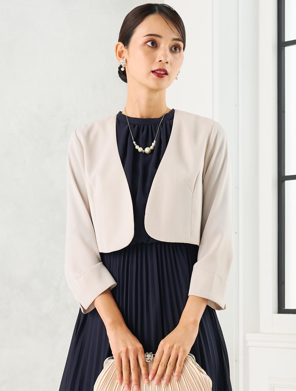 ベージュのジャケットを合わせたきちんと感のあるコーディネート。ベージュのジャケットは、落ち着いたネイビードレスにきちんと感と女性らしい明るさをプラスしてくれます。30代40代の親族向きのコーディネートです。