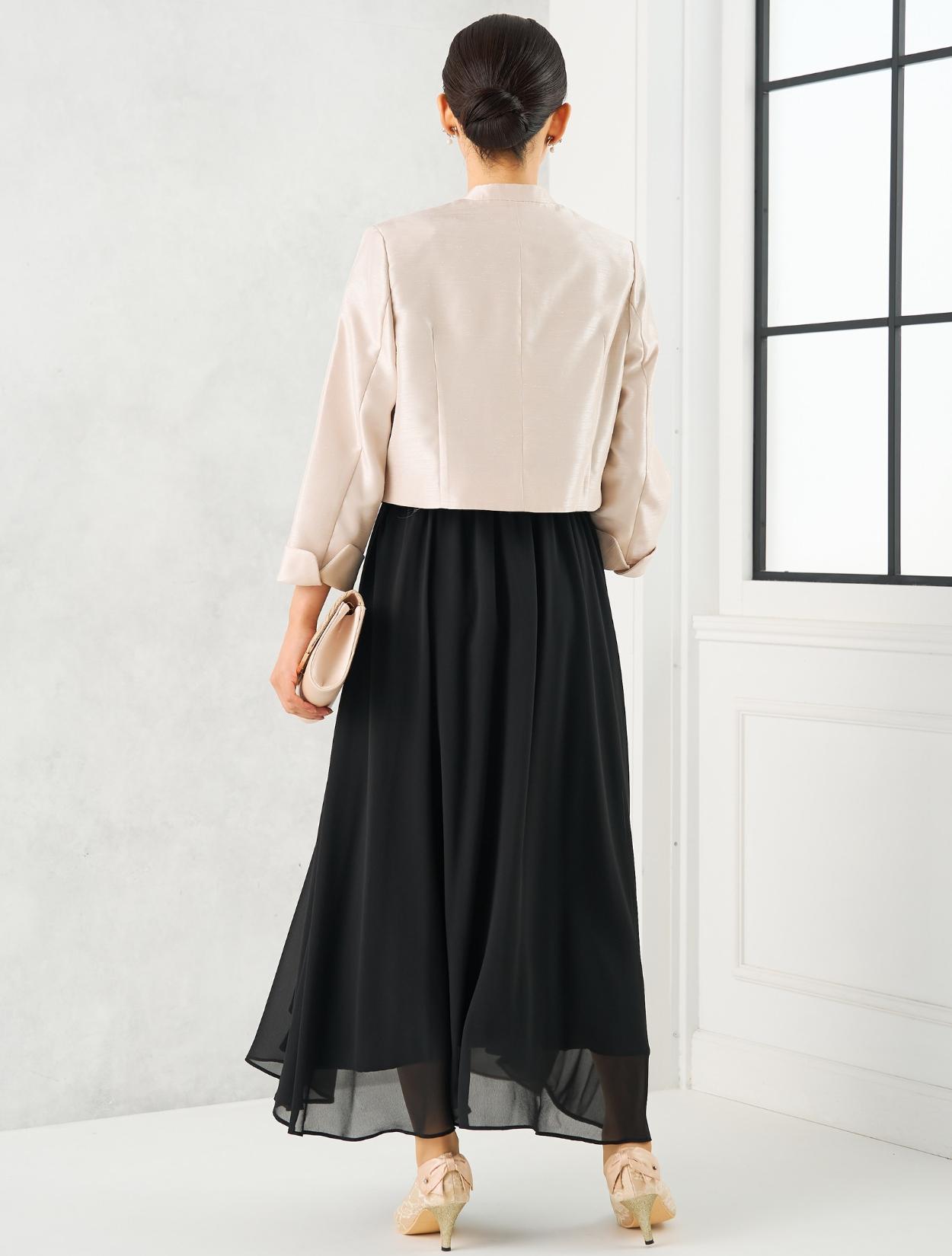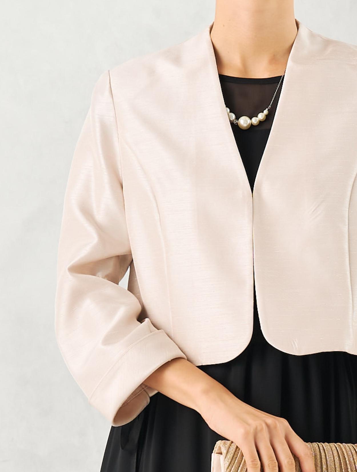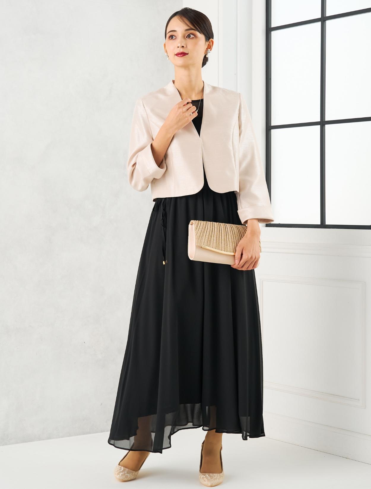 丈が長めのブラックのドレスにグレーのシャンタンジャケットを合わせた親族向きのコーディネート。シャンタン生地は、高級感ときちんと感があり親族にぴったりのアイテム。シックで落ち着いた雰囲気ですが、シャンタンの光沢や華やかなラメのバッグで地味になり過ぎないのもポイント。