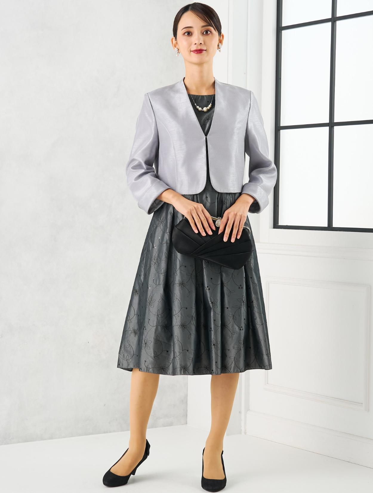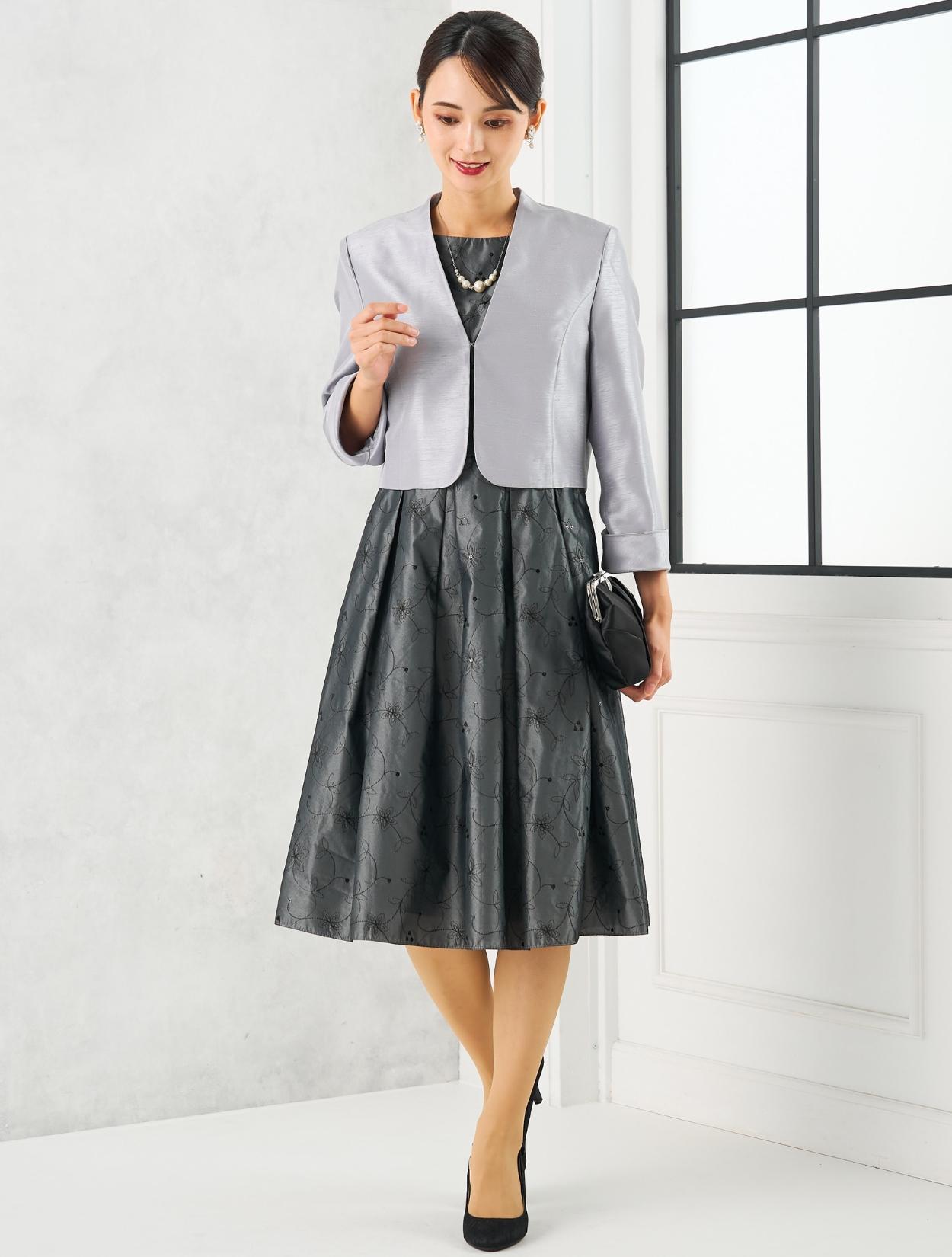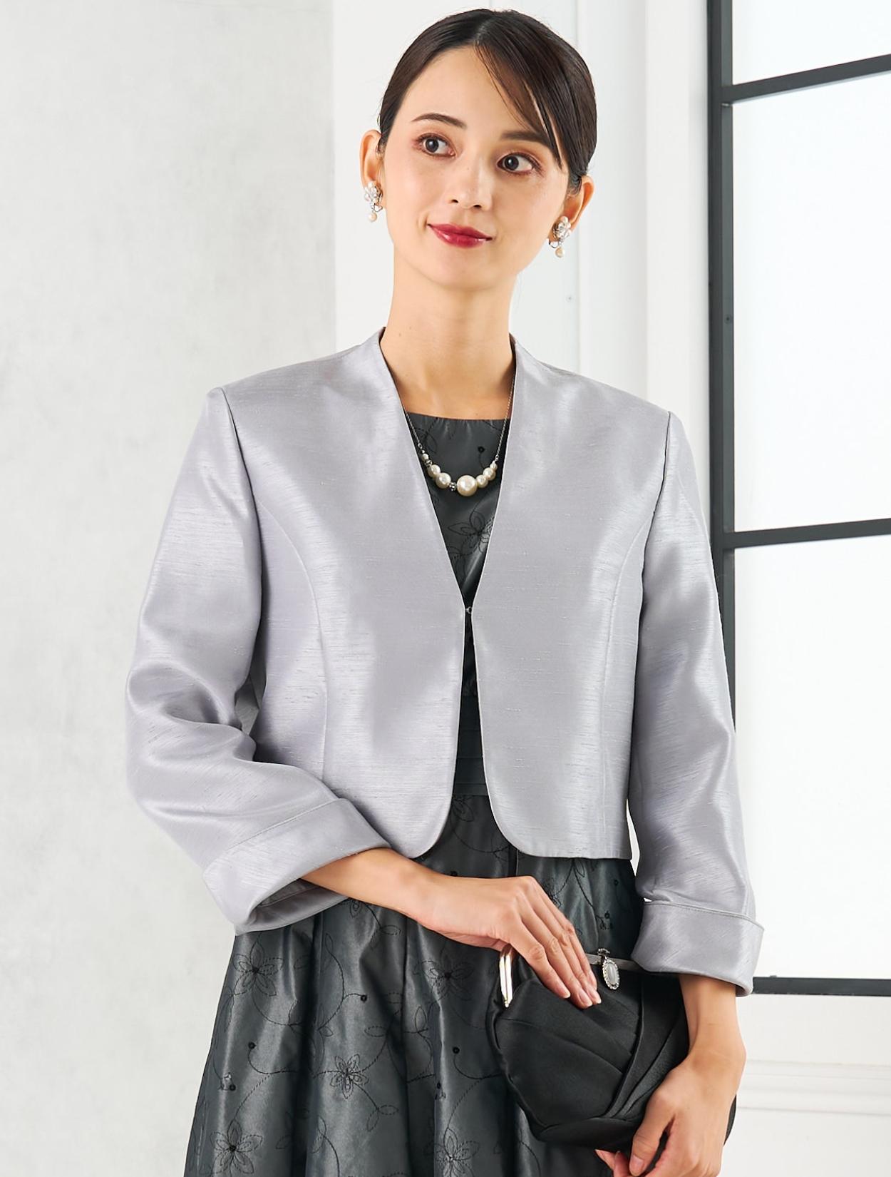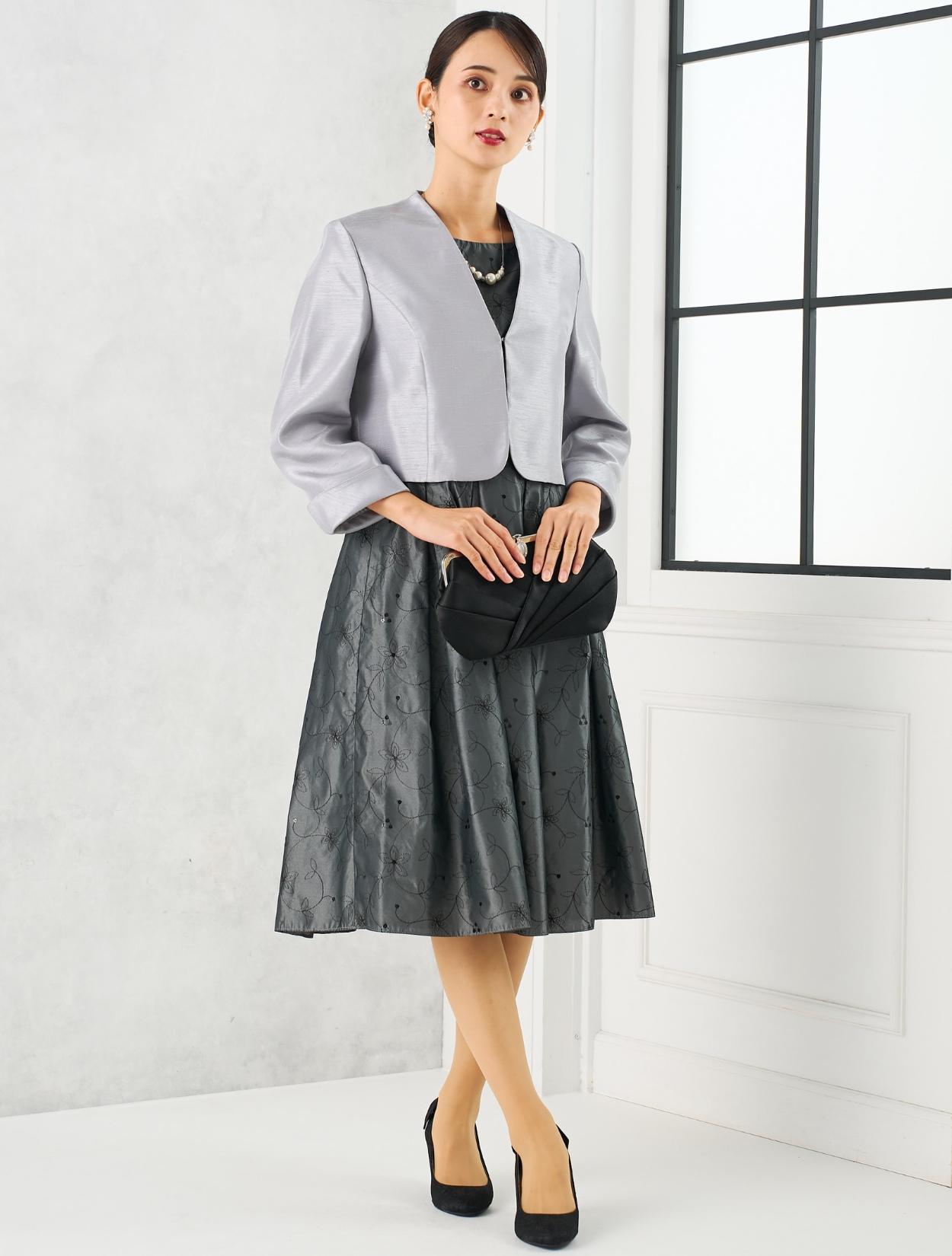 グレーのドレスにグレーのジャケットを合わせた親族向きのコーディネート。単色コーデはフォーマル度もアップするので親族におすすめです。ドレスの生地もジャケットの生地も、程よく光沢があり高級感もあります。格式ある結婚式にもおすすめです。