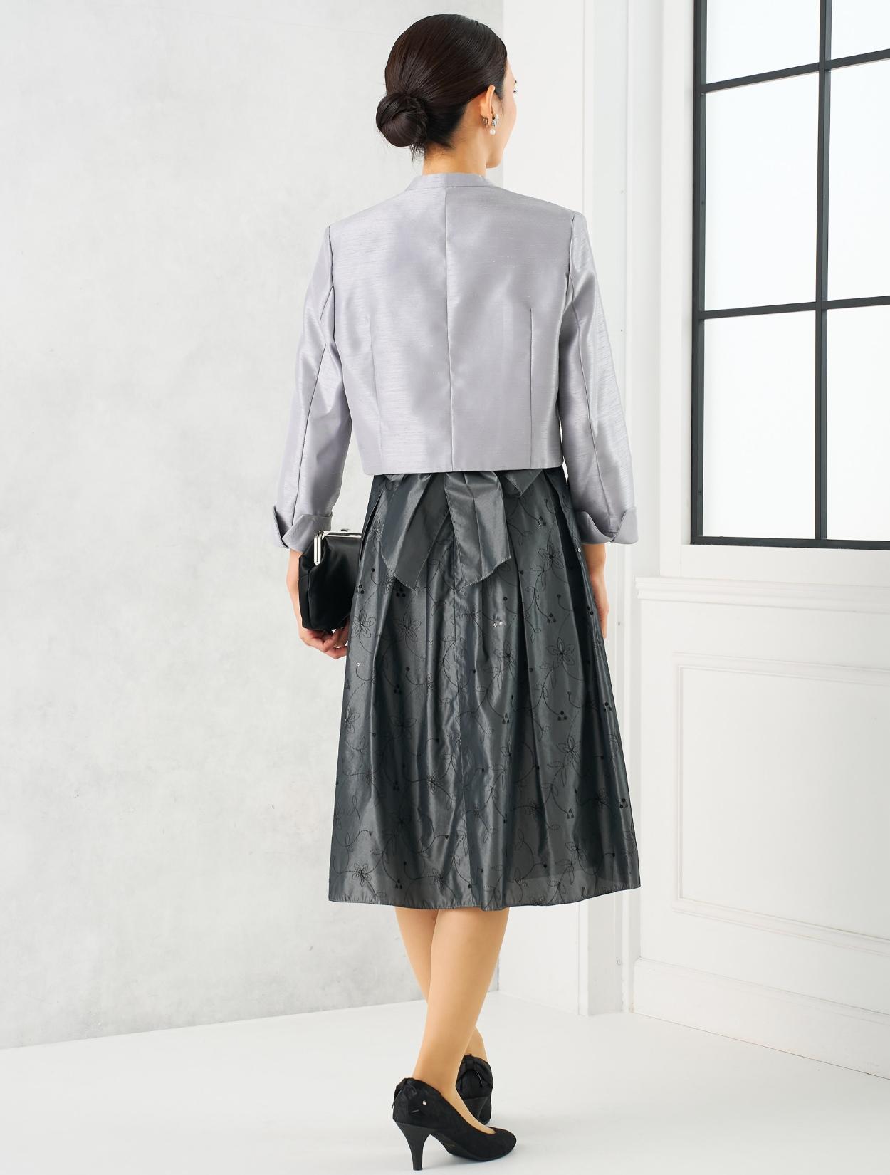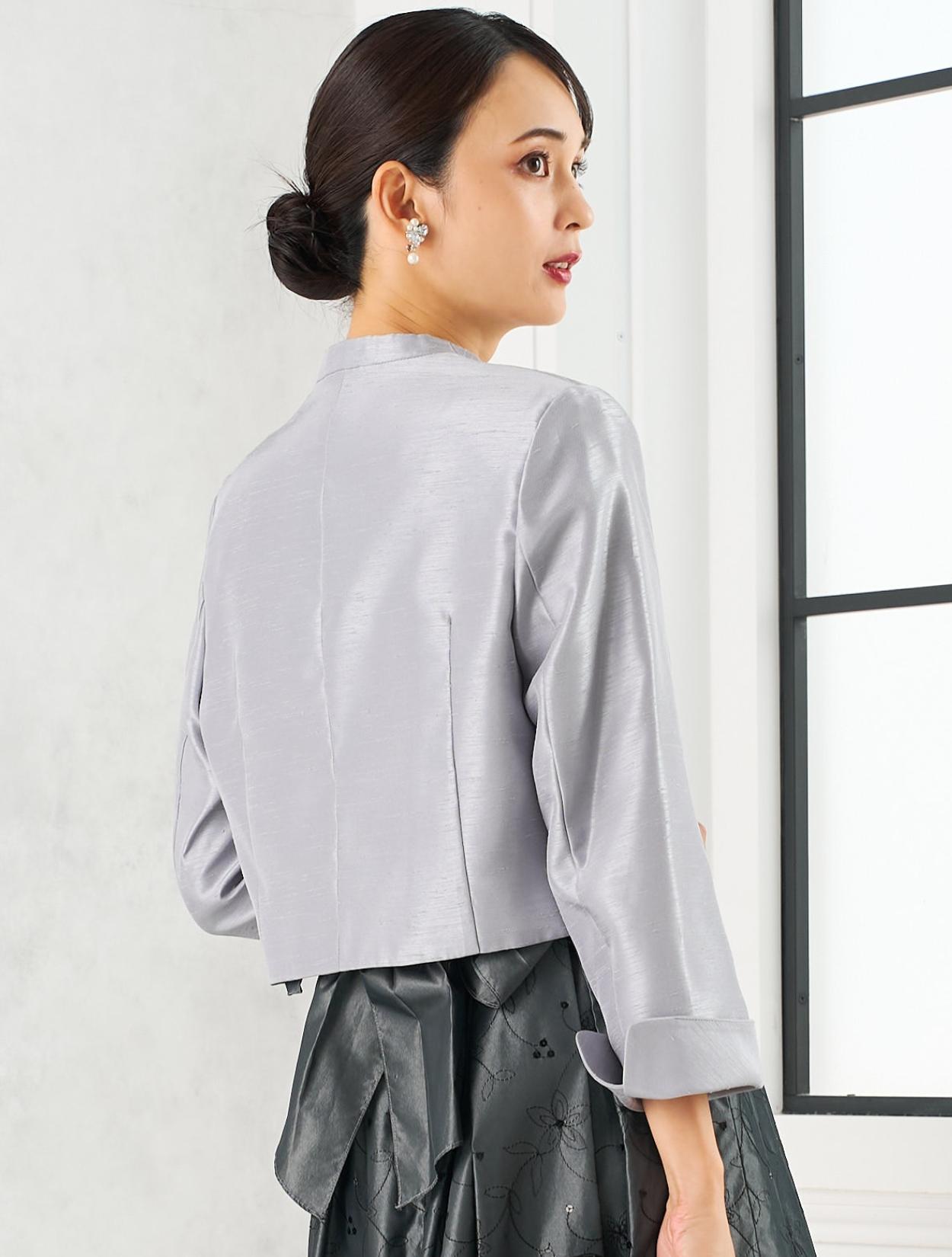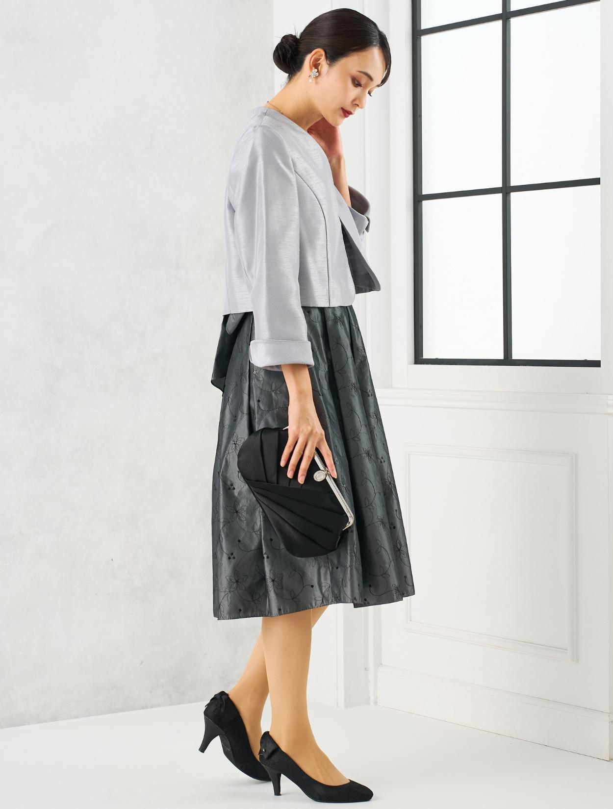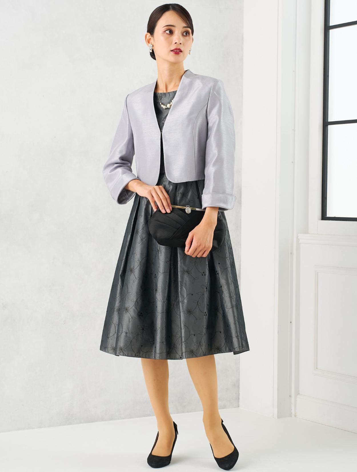 グレーのドレスにグレーのジャケットを合わせた親族向きのコーディネート。単色コーデはフォーマル度もアップするので親族におすすめです。ドレスの生地もジャケットの生地も、程よく光沢があり高級感もあります。格式ある結婚式にもおすすめです。