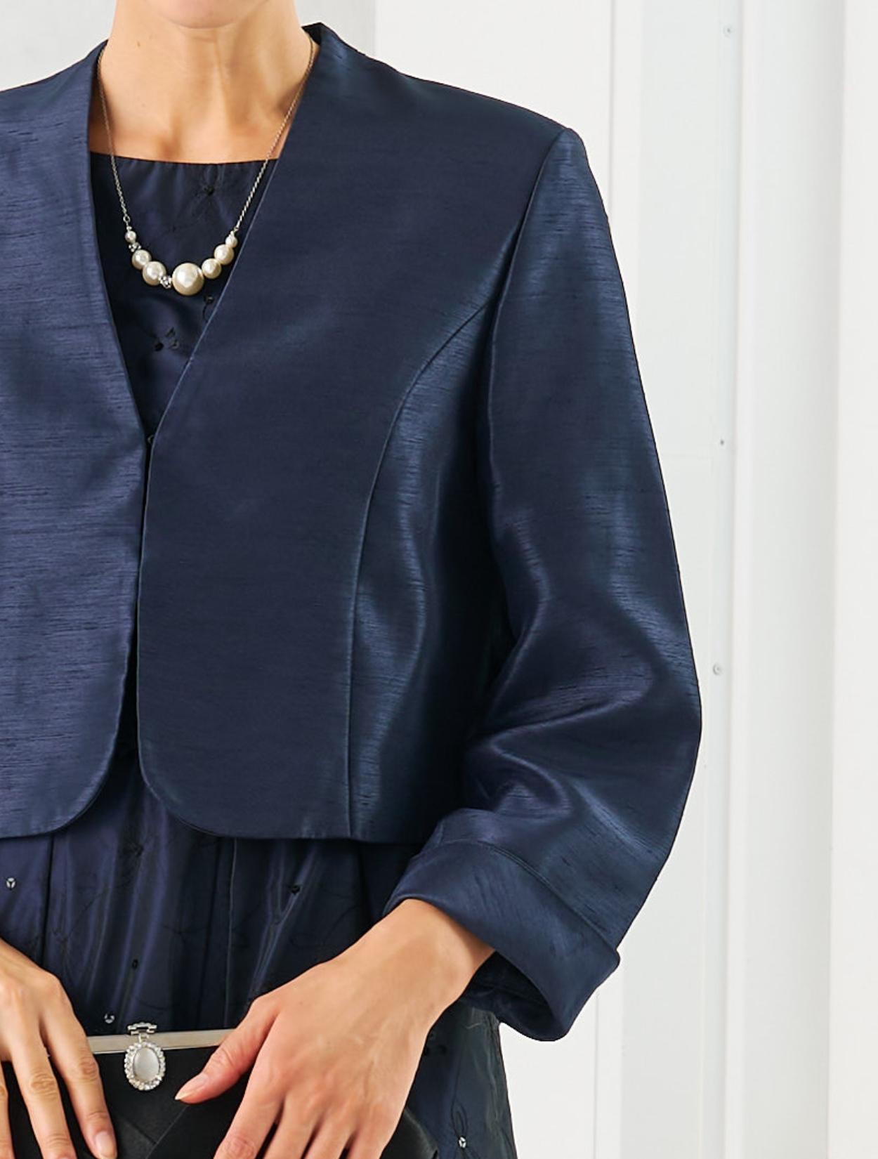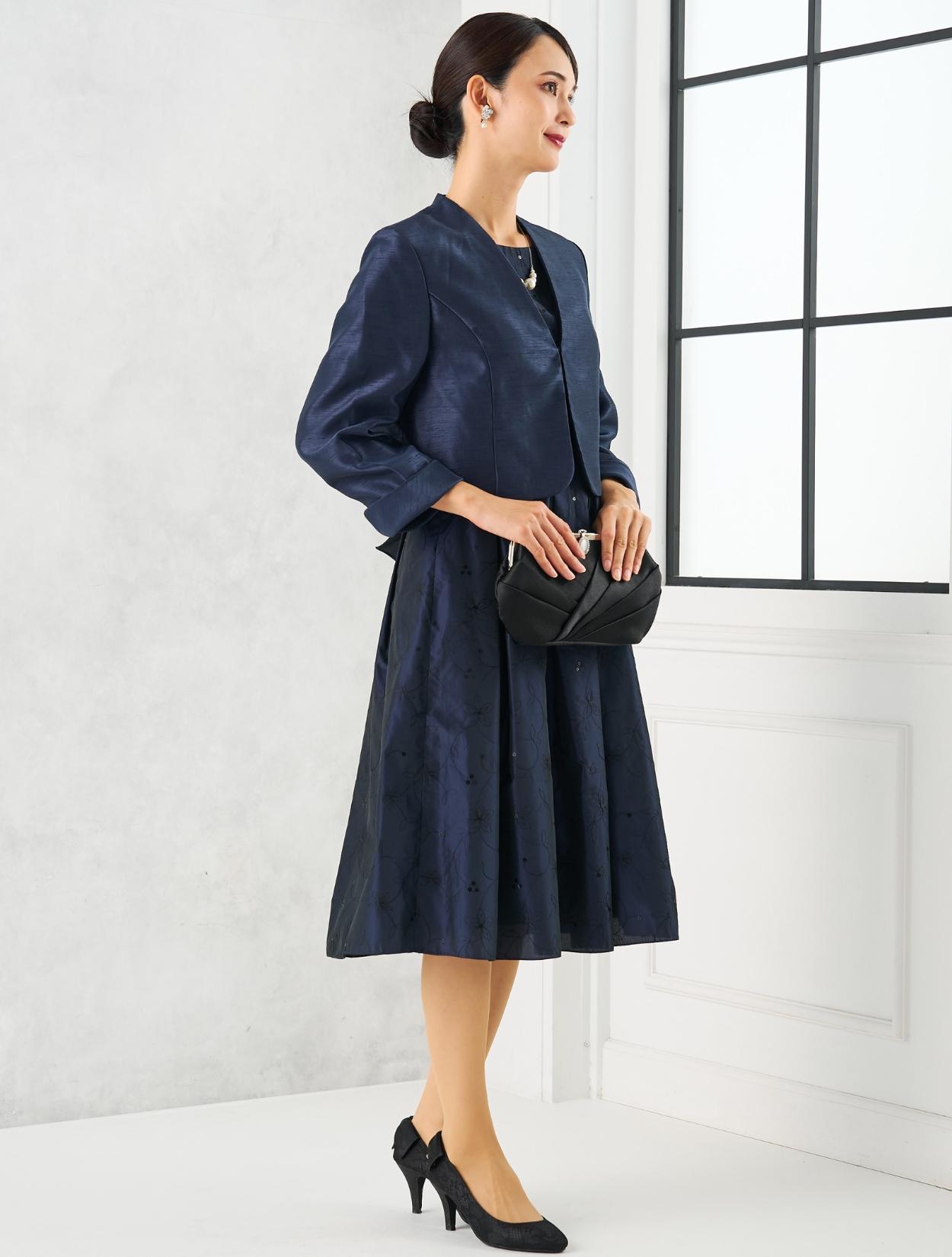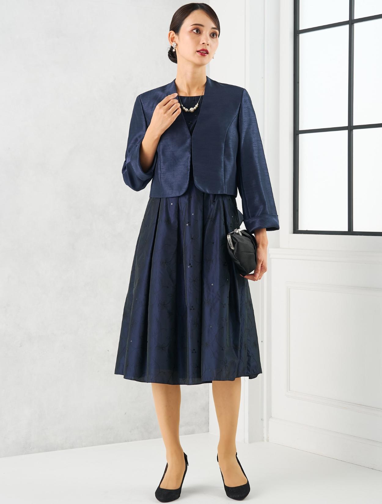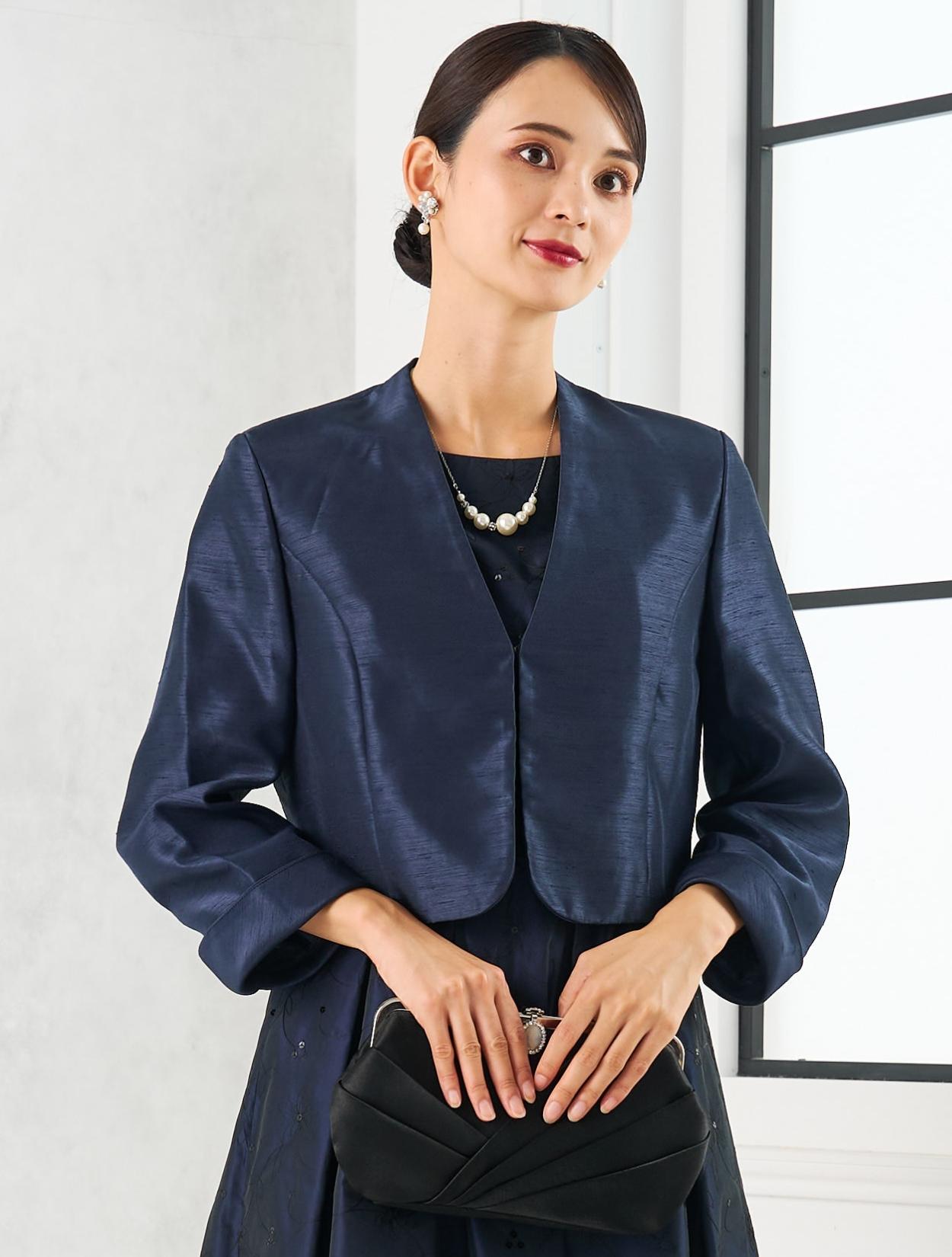 ネイビーのドレスにネイビーのジャケットを合わせた親族向きのコーディネート。単色でまとめたコーデは、フォーマル度もアップするので、特に親族におすすめです。ドレスの生地もジャケットの生地もしっかりしていて高級感があるので、格式ある会場でも心配いりません。