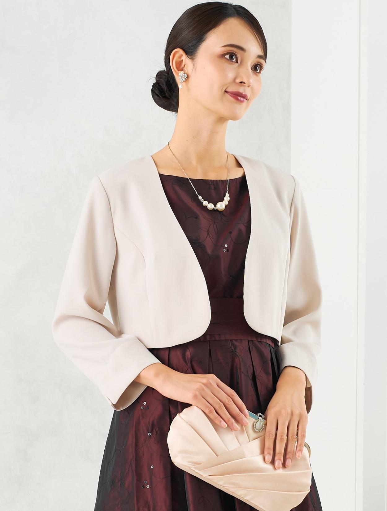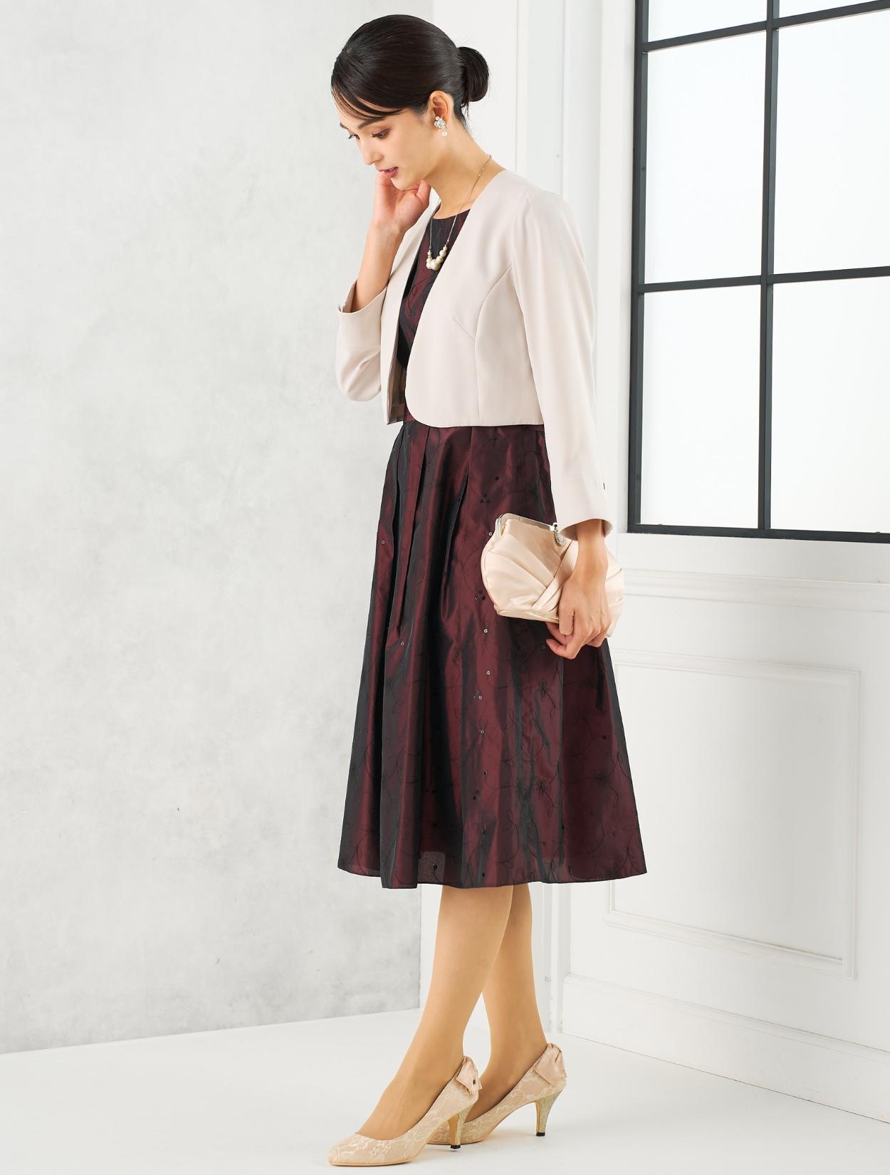 ボルドーのドレスにベージュのジャケットを合わせた若々しく上品なコーディネート。きちんと感のあるジャケットは、20代30代の親族・受付・スピーチをされる方にもおすすめのコーデです。