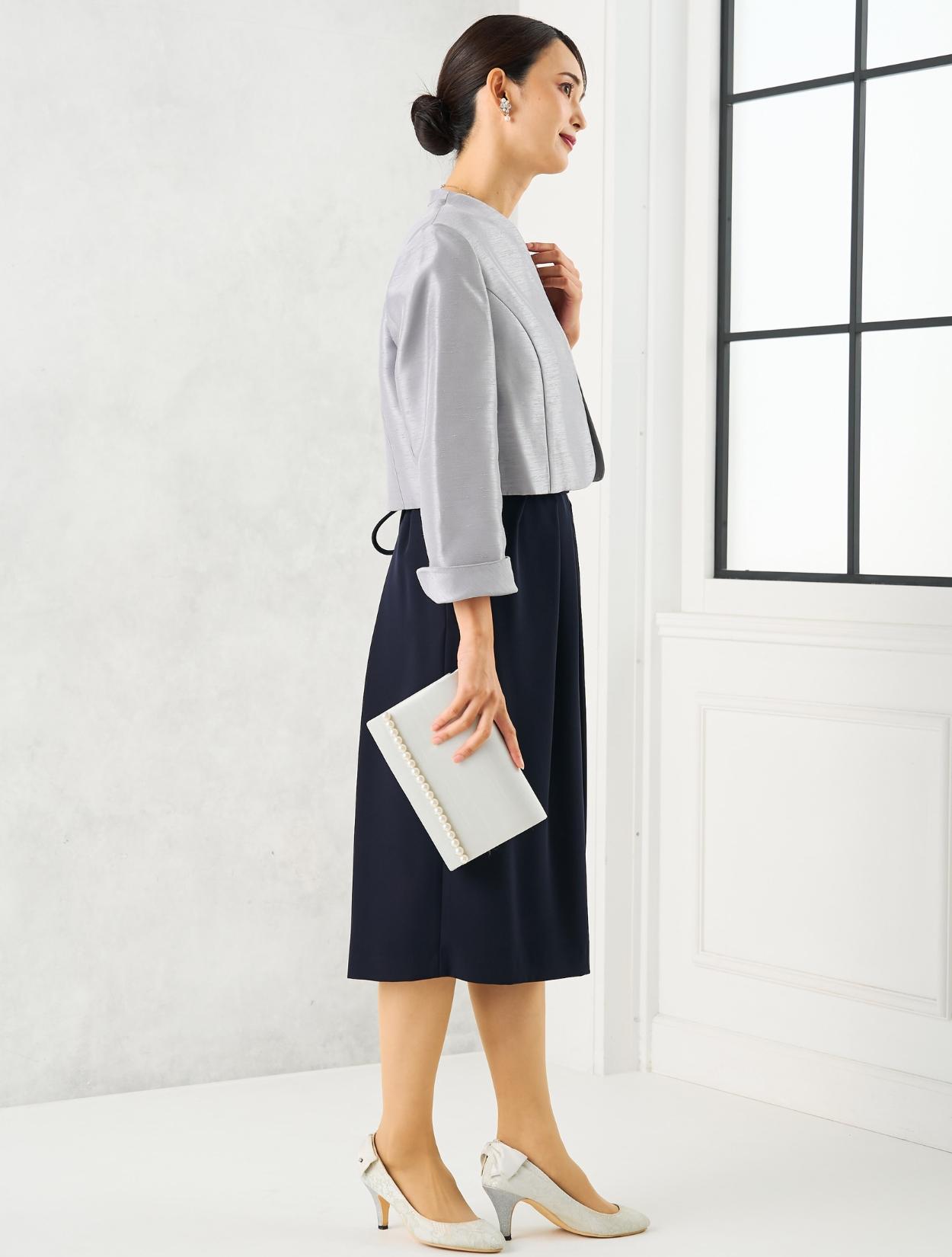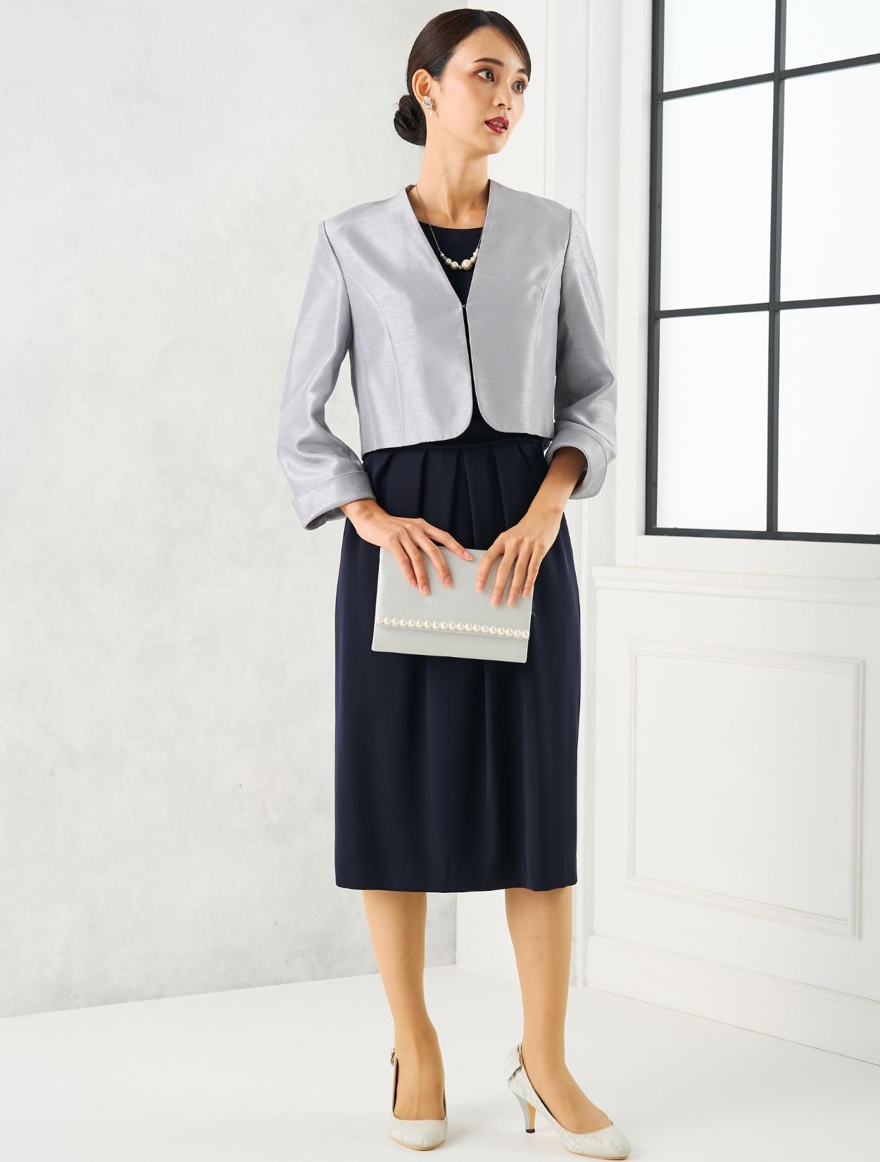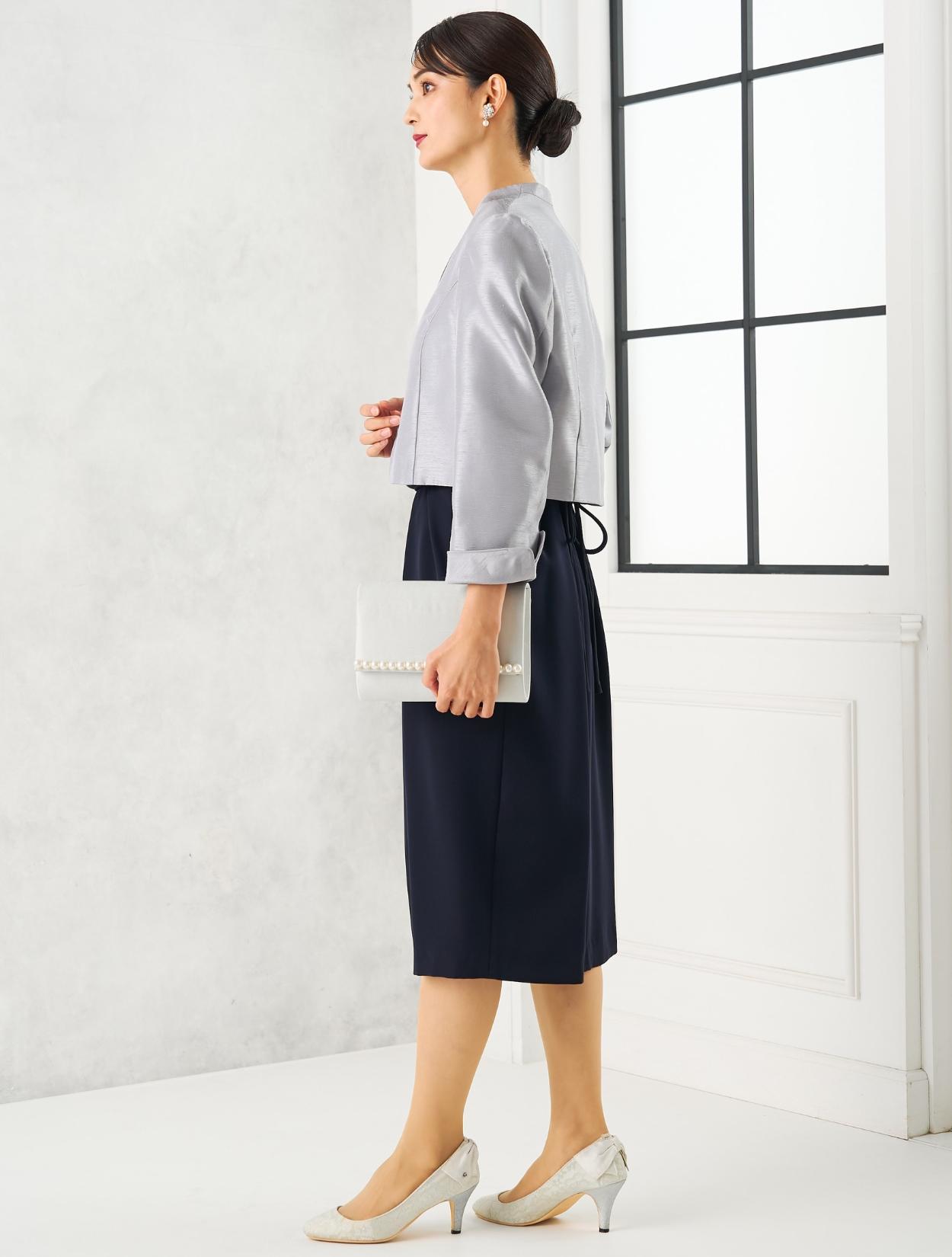 スカートが広がらないコクーンドレスに、高級感のあるシャンタンジャケットを合わせた、親族向きの落ち着いたコーディネート。グレーのシャンタン生地は、程よく光沢があり地味になり過ぎないのもポイント。お母様用の顔合わせ用ワンピースとしてもおすすめです。