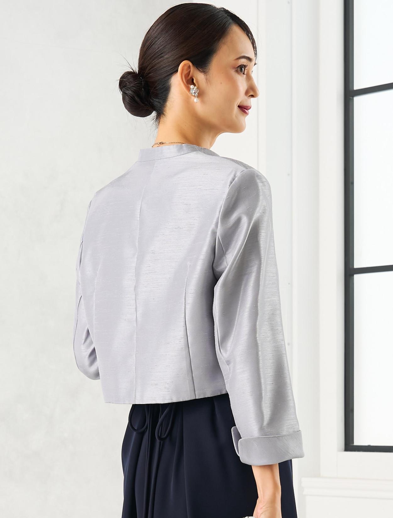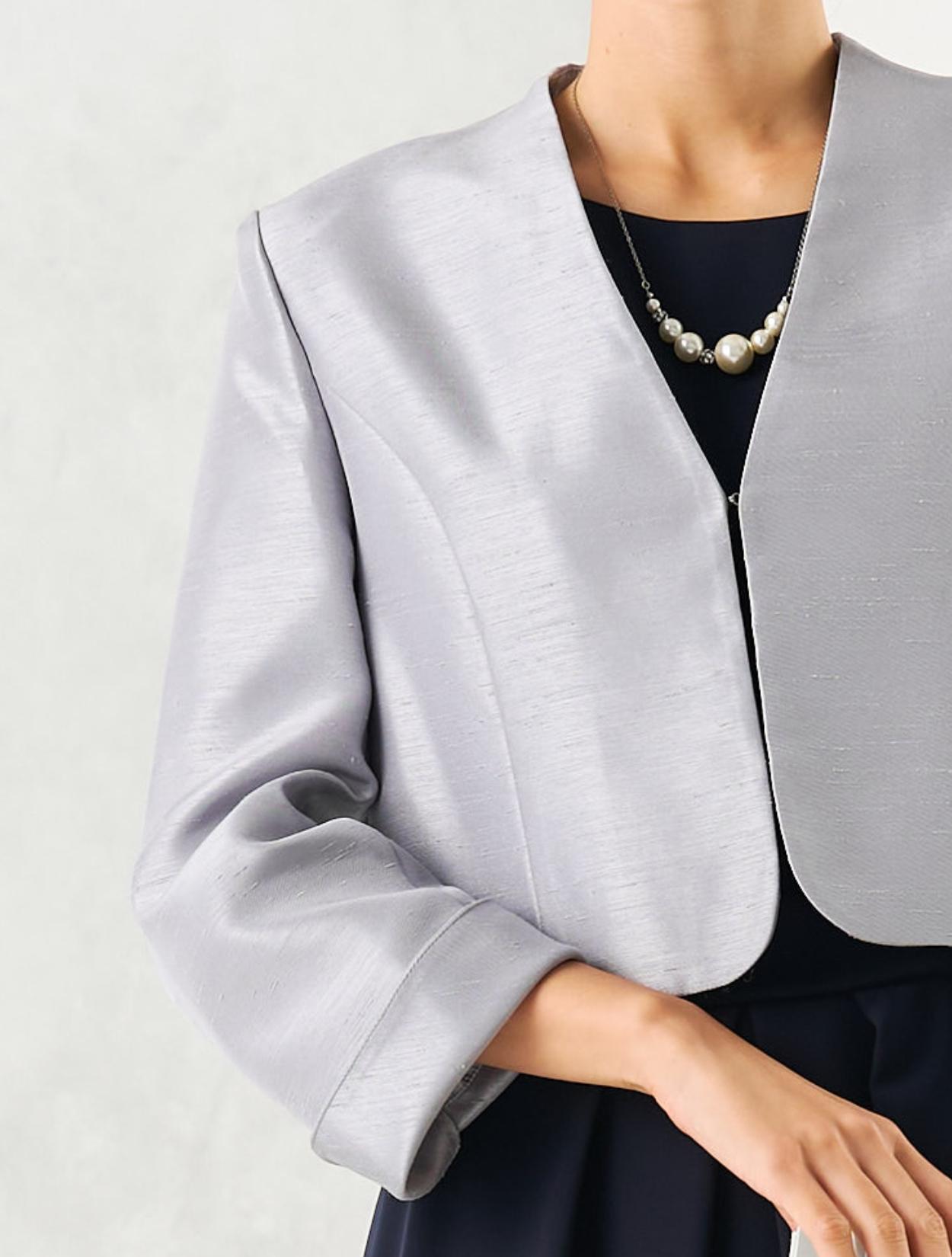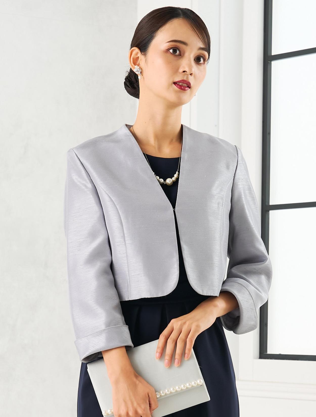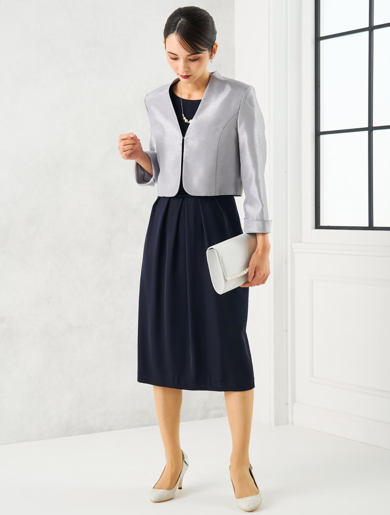 スカートが広がらないコクーンドレスに、高級感のあるシャンタンジャケットを合わせた、親族向きの落ち着いたコーディネート。グレーのシャンタン生地は、程よく光沢があり地味になり過ぎないのもポイント。お母様用の顔合わせ用ワンピースとしてもおすすめです。