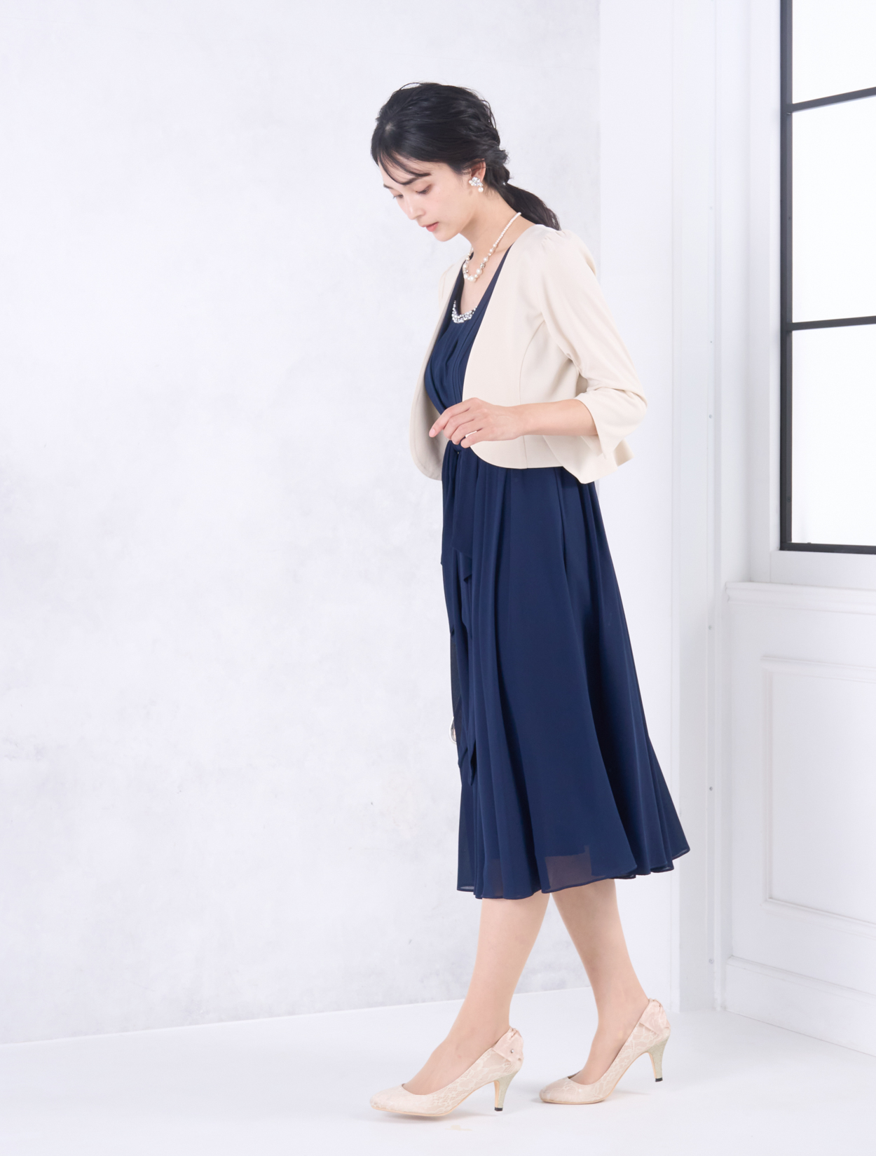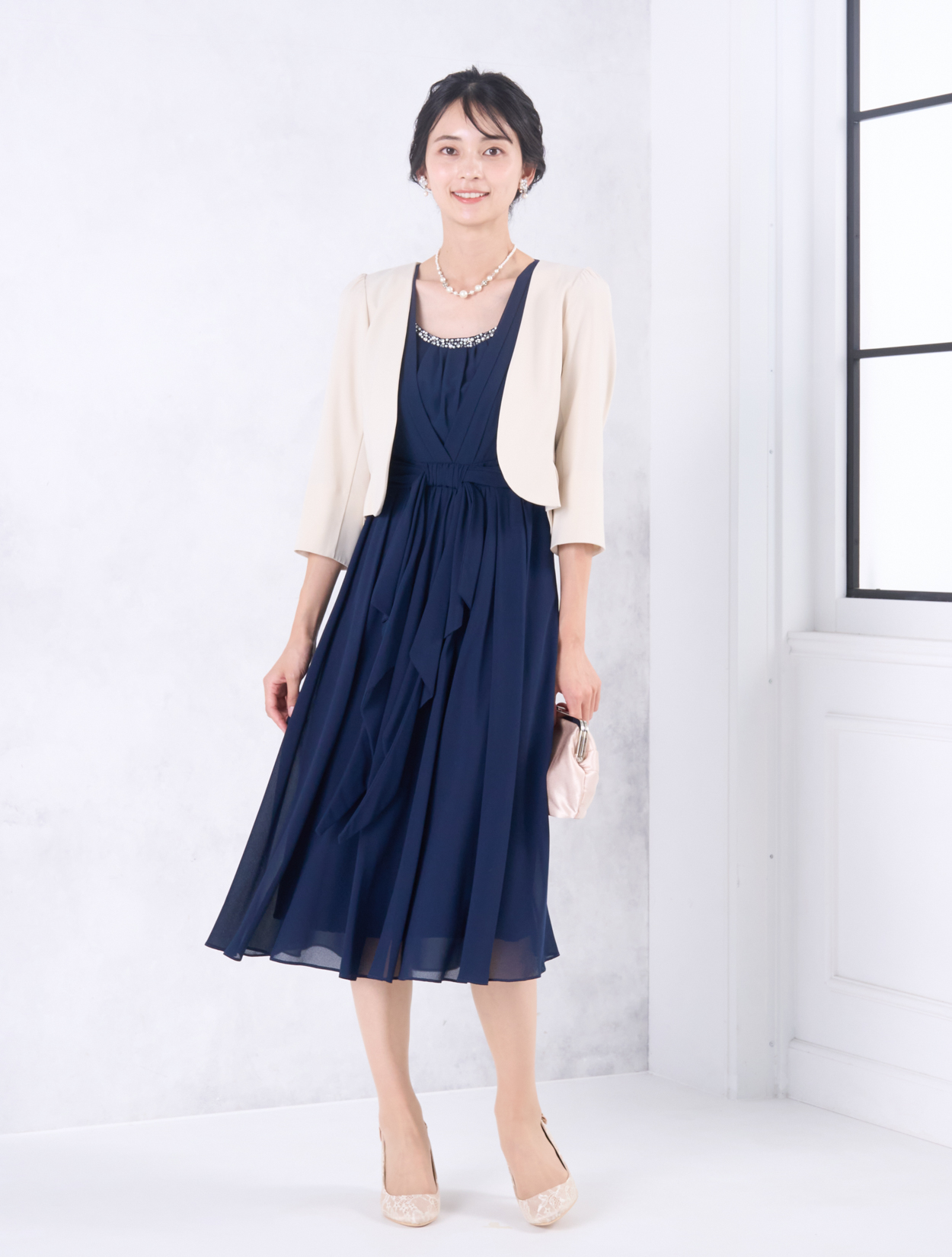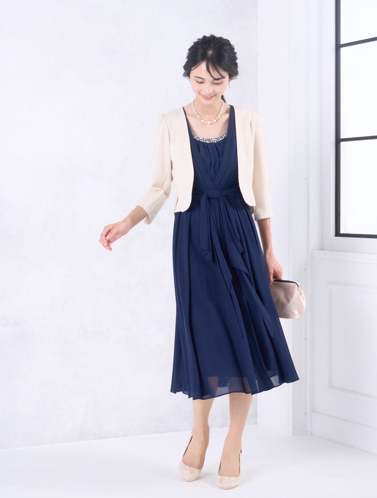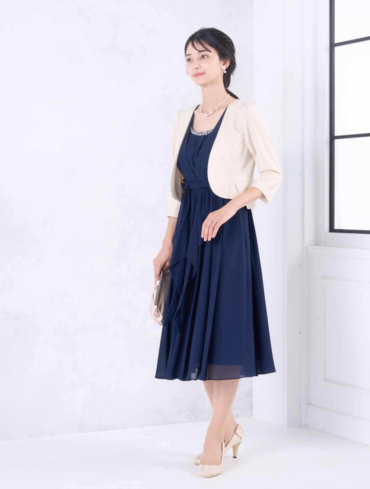 ベージュのジャケットが上品で華やかなコーディネート。きちんと感がありながらも、お顔映りも明るくしてくれます。20代後半から30代以降の親族ドレスとしてもおすすめです。また、きちんと感のあるスタイルで受付やスピーチをされたい方にも◎。