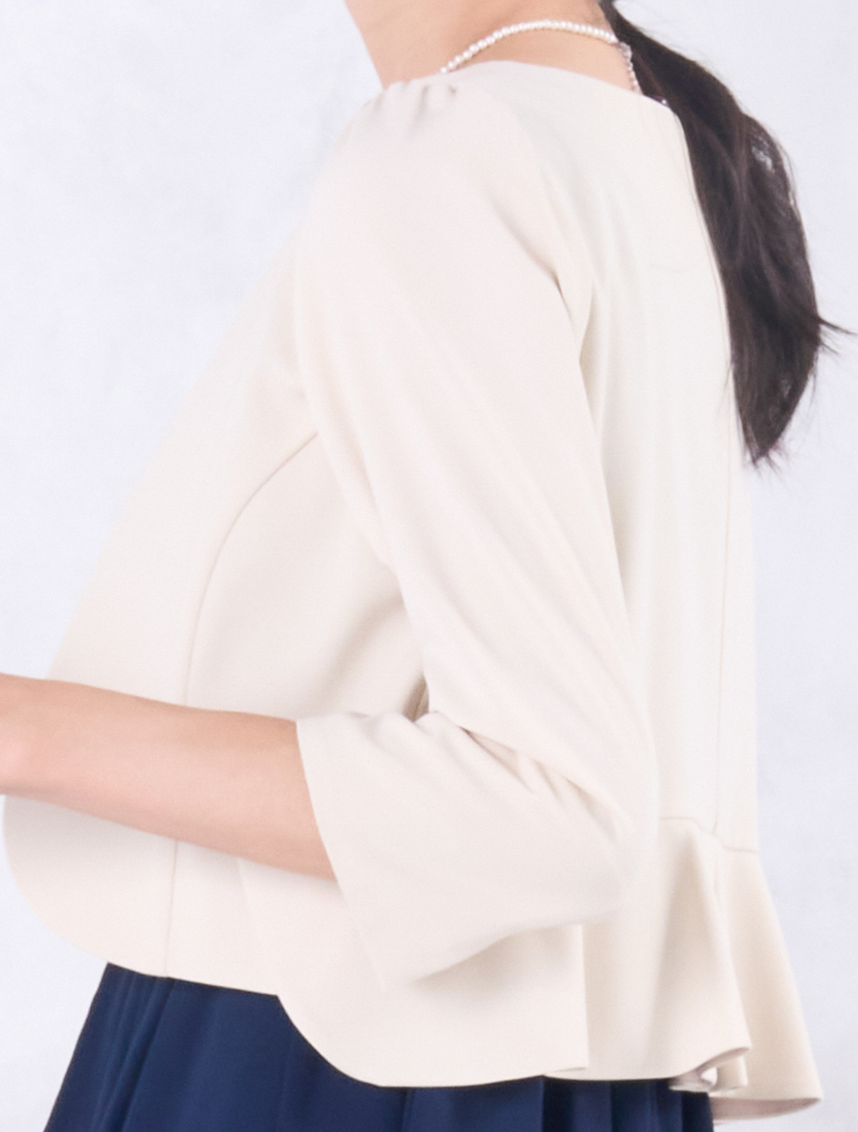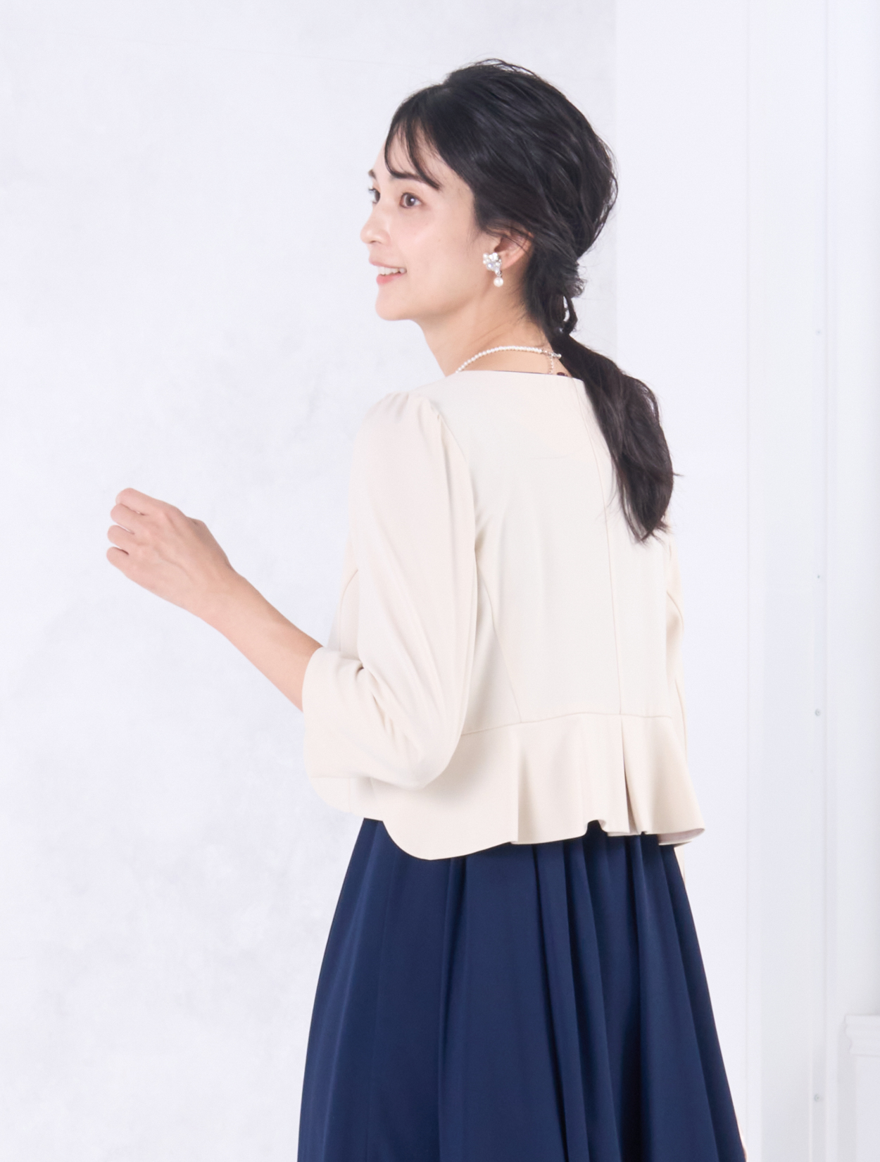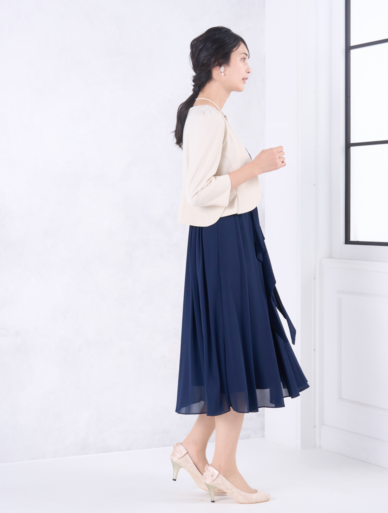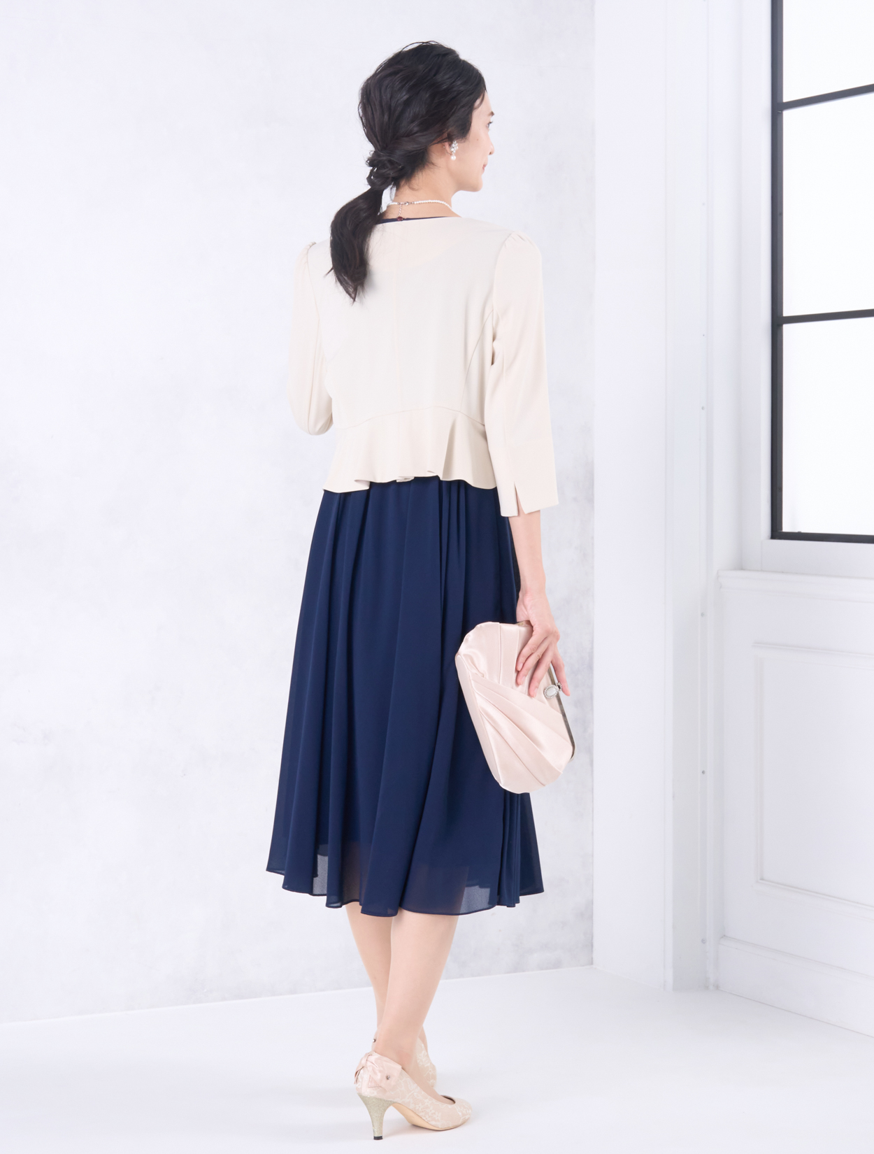 ベージュのジャケットが上品で華やかなコーディネート。きちんと感がありながらも、お顔映りも明るくしてくれます。20代後半から30代以降の親族ドレスとしてもおすすめです。また、きちんと感のあるスタイルで受付やスピーチをされたい方にも◎。