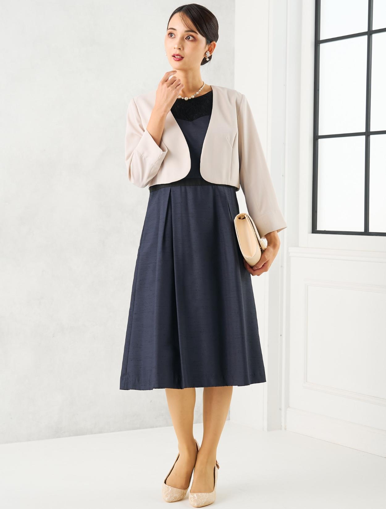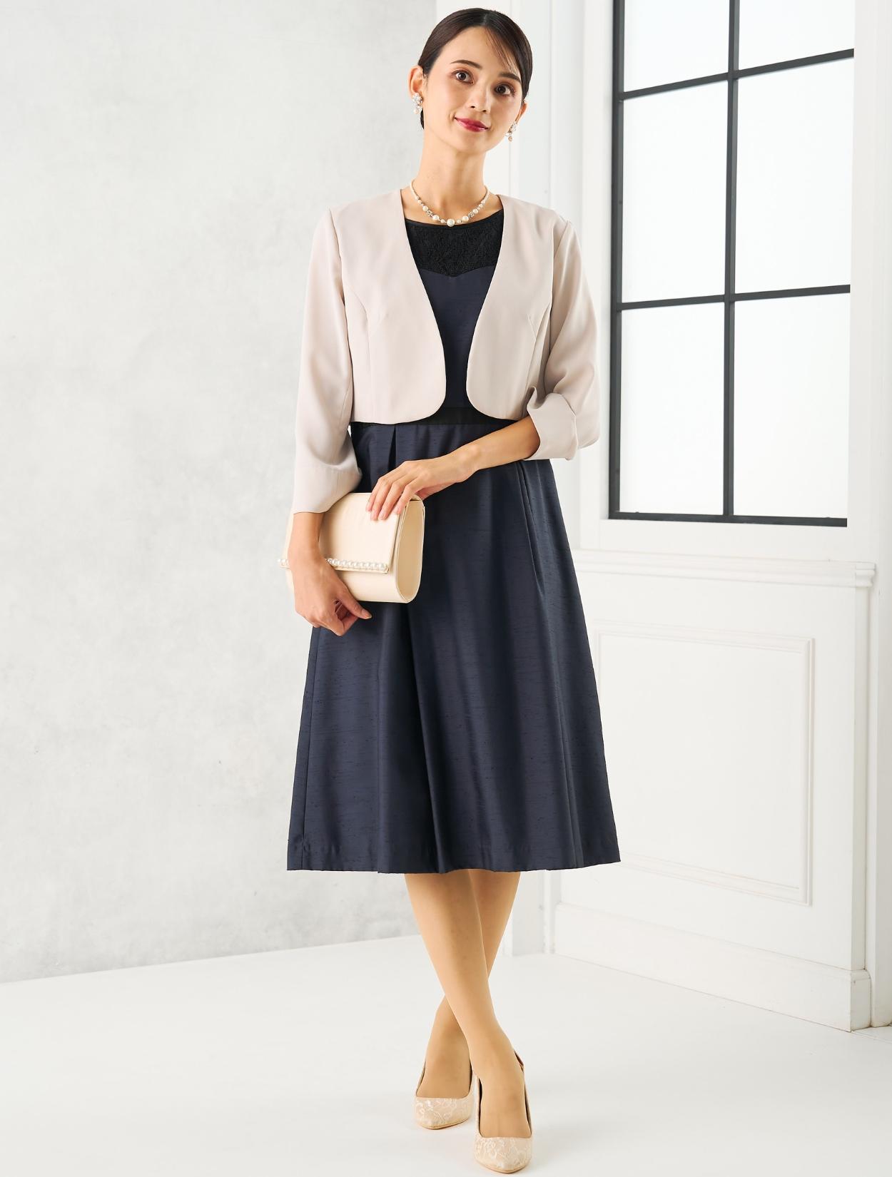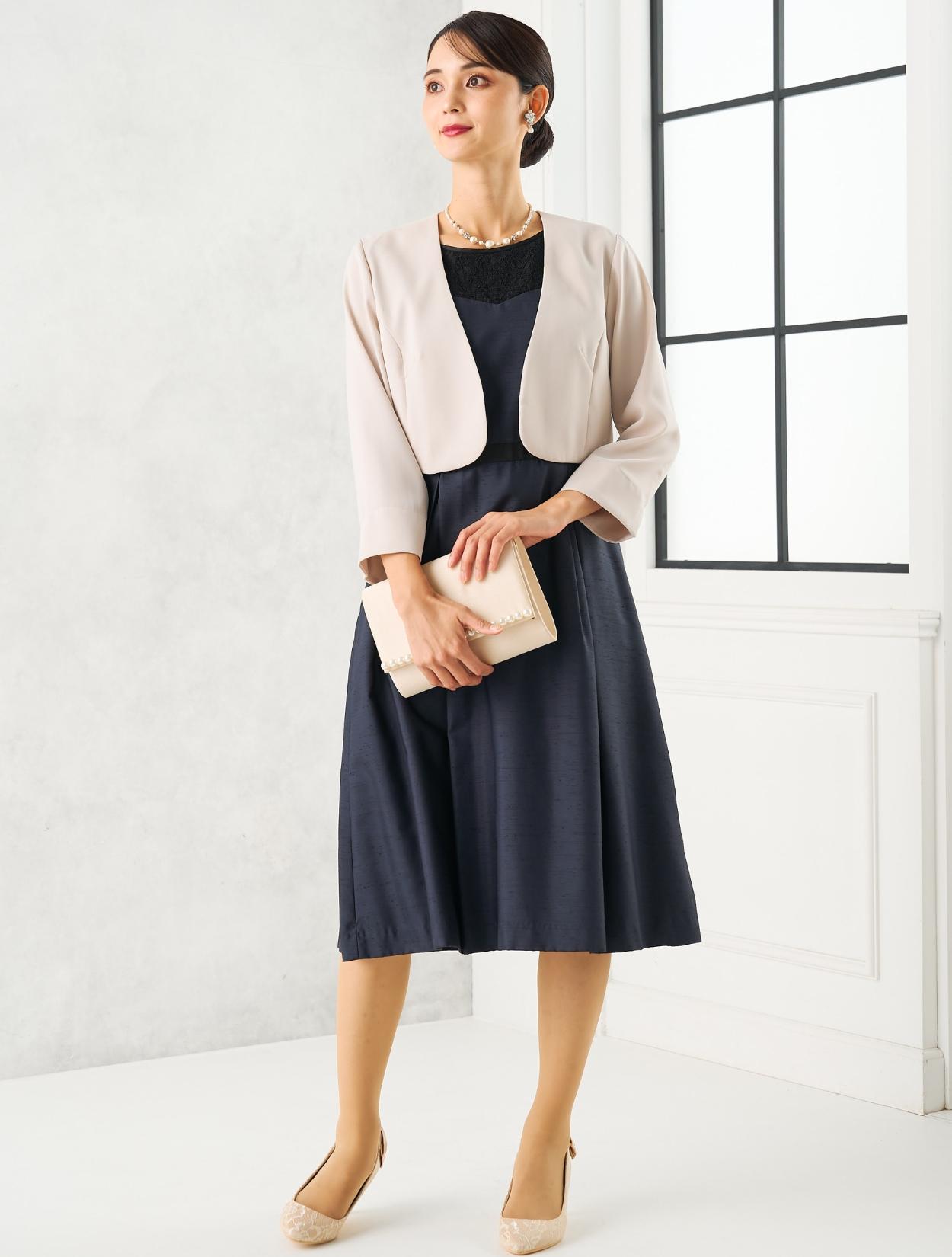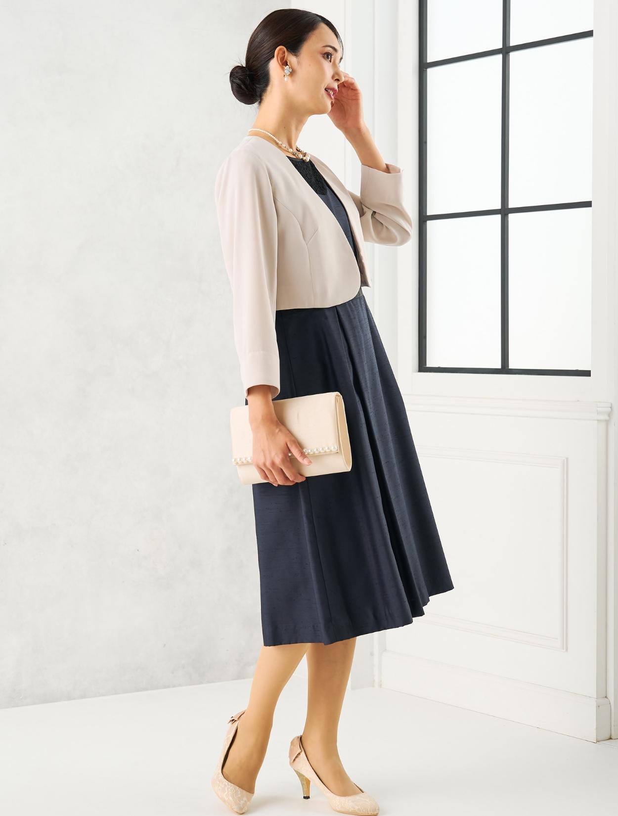 フレアスカートのドレスとベージュのジャケットが上品で女性らしいコーディネート。きちんと感もあるので30代・40代以降の親族におすすめです。地味になり過ぎないので、会社関係のお呼ばれにもおすすめです。
