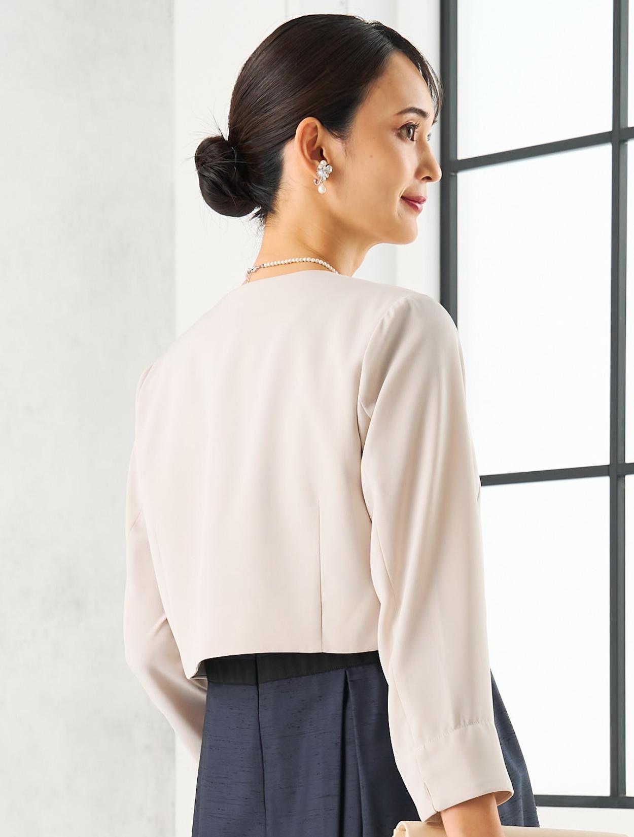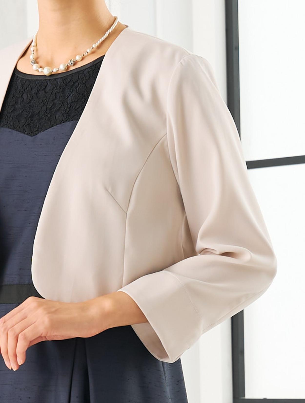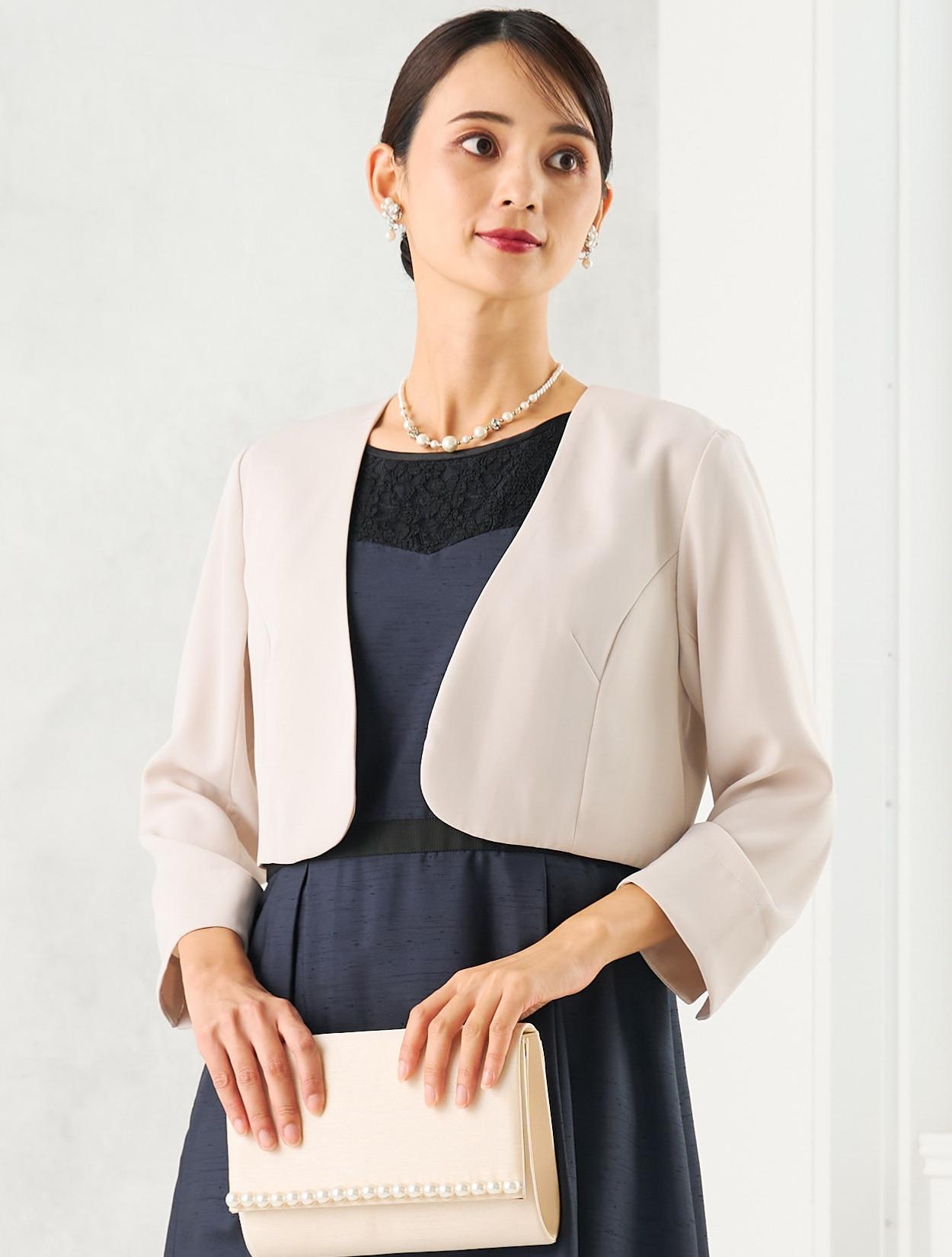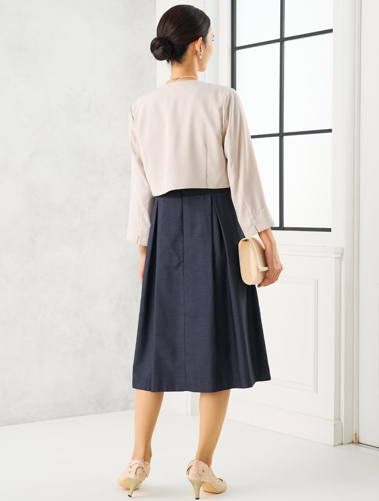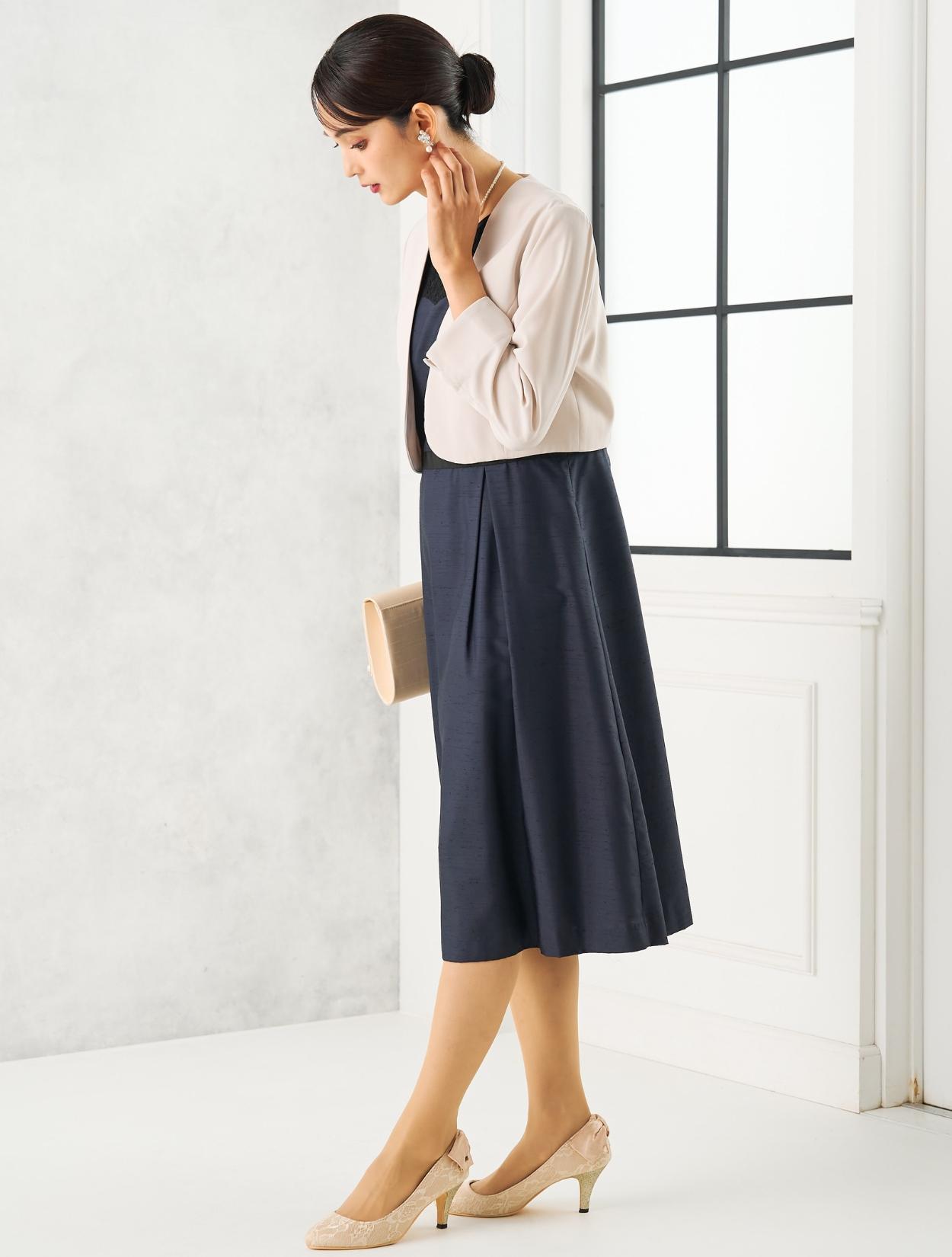 フレアスカートのドレスとベージュのジャケットが上品で女性らしいコーディネート。きちんと感もあるので30代・40代以降の親族におすすめです。地味になり過ぎないので、会社関係のお呼ばれにもおすすめです。