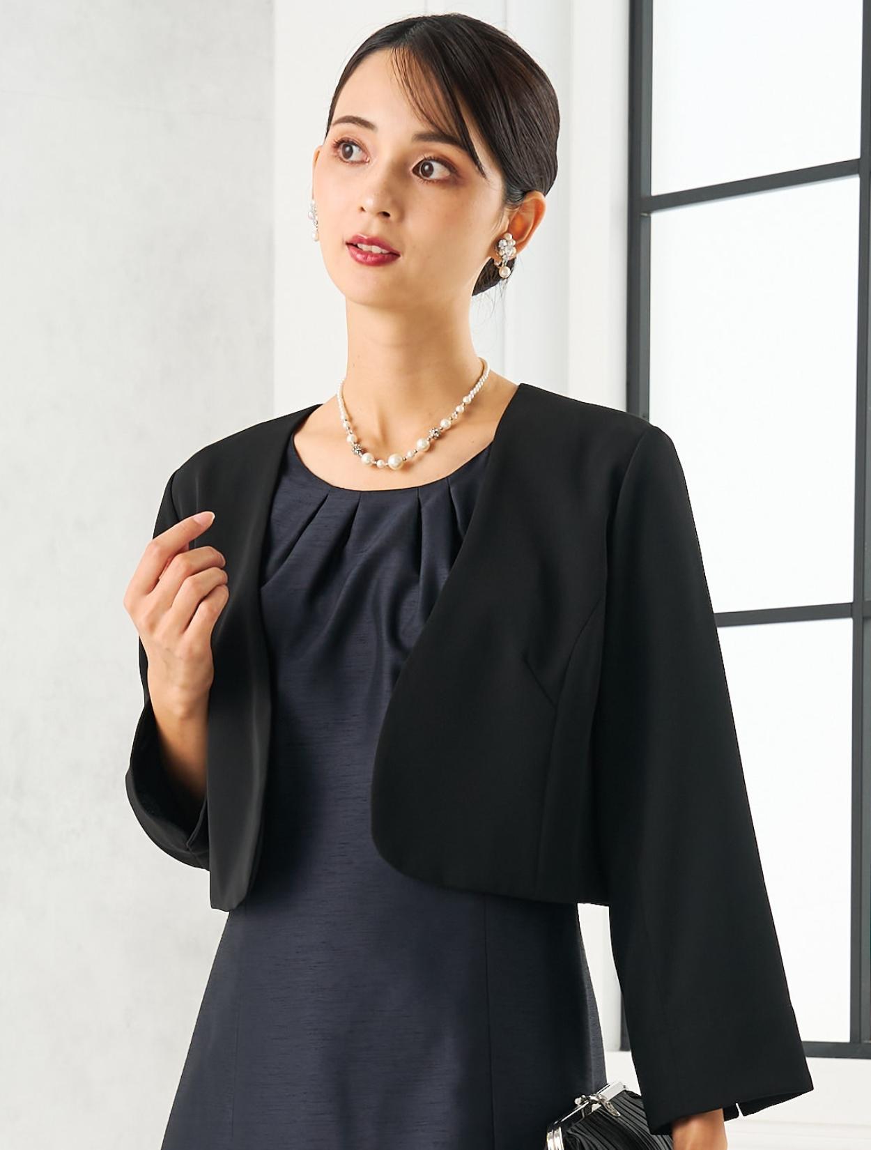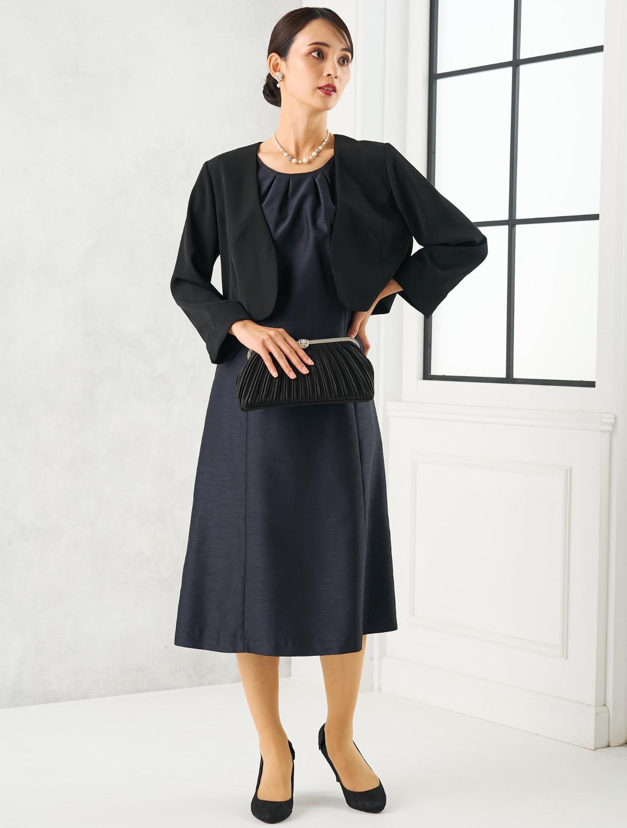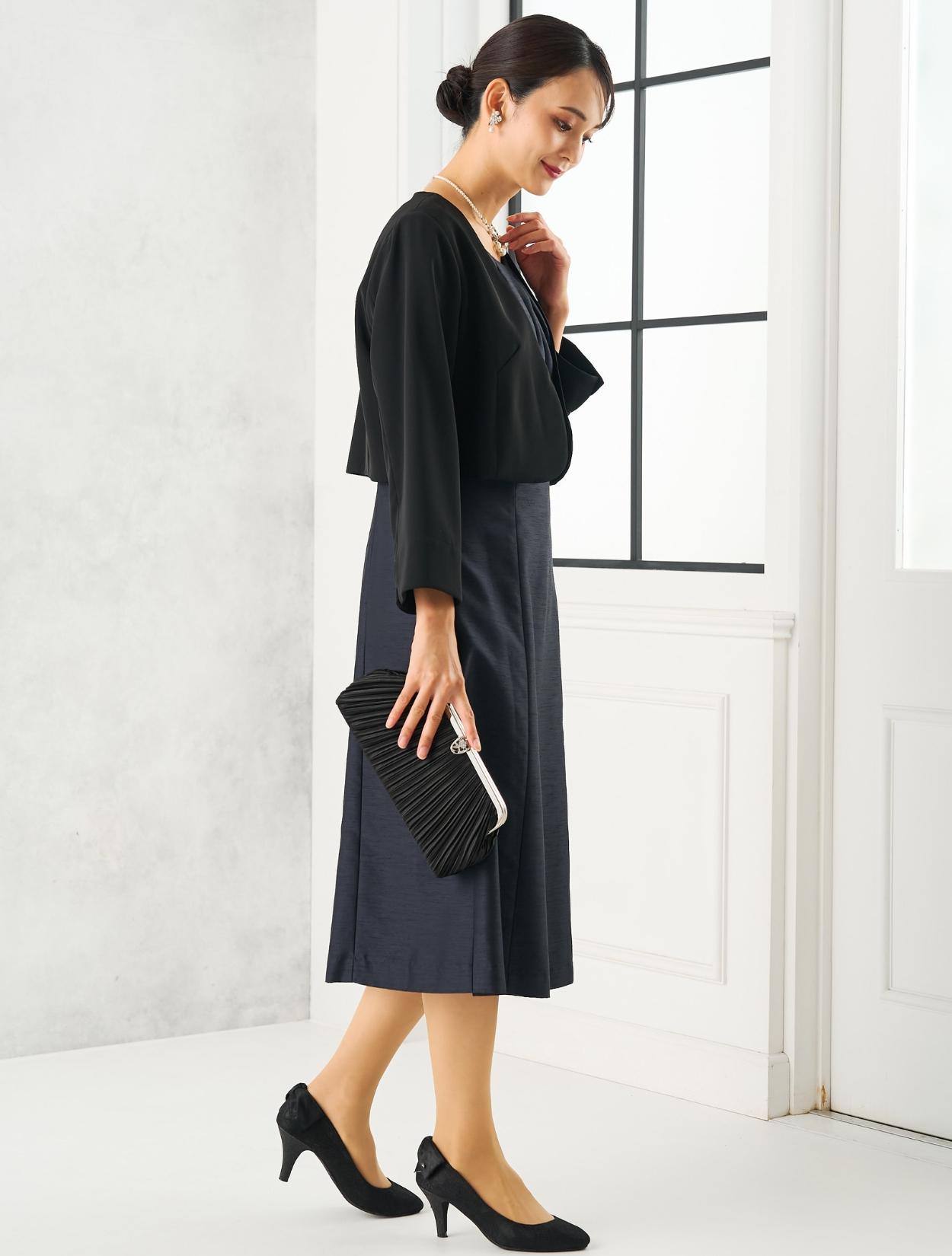 ネイビーのドレスにブラックのジャケットを合わせた、シックな親族向きのコディネート。派手過ぎず落ち着いた印象の合わせは、ゲストをお迎えする親族にぴったりです。