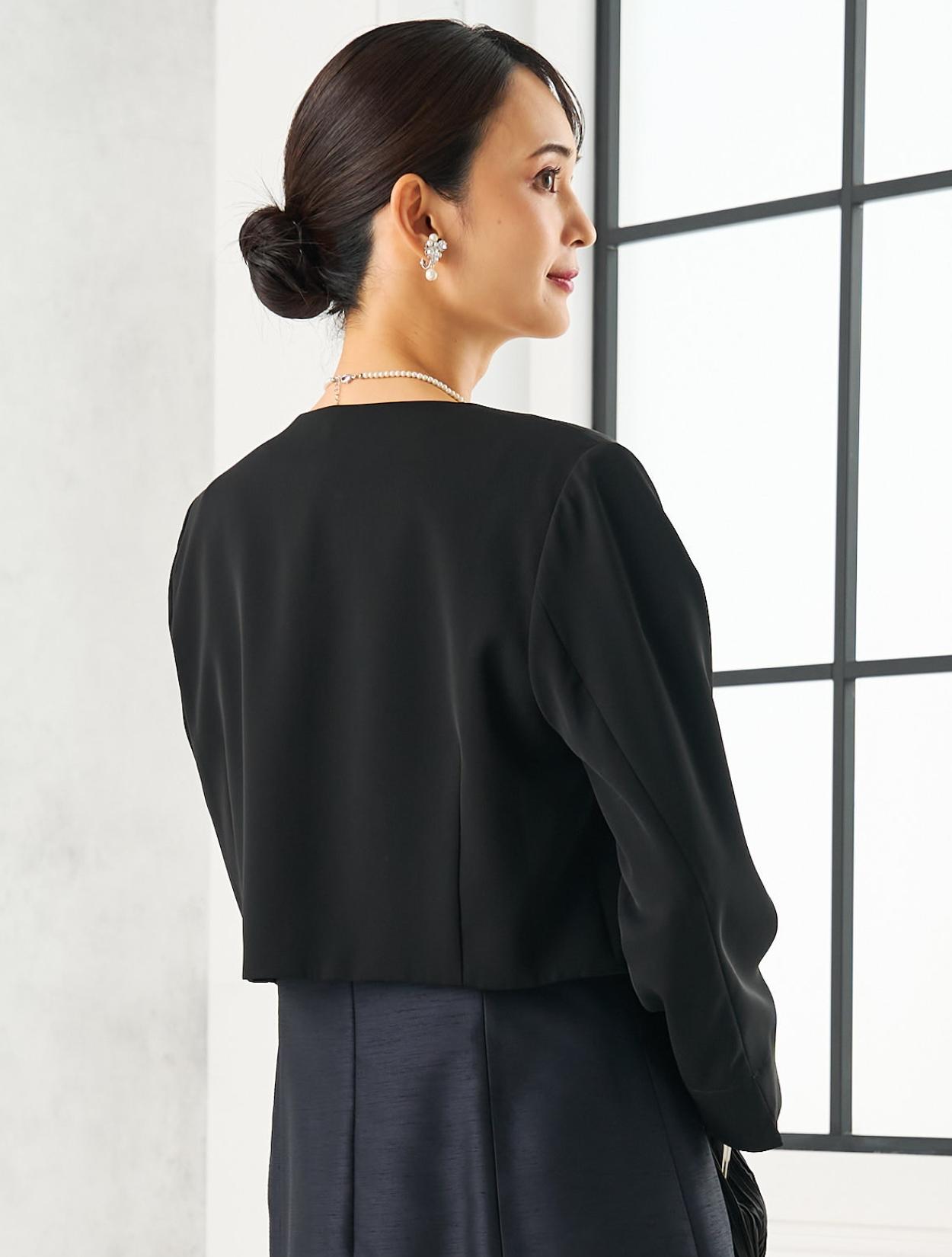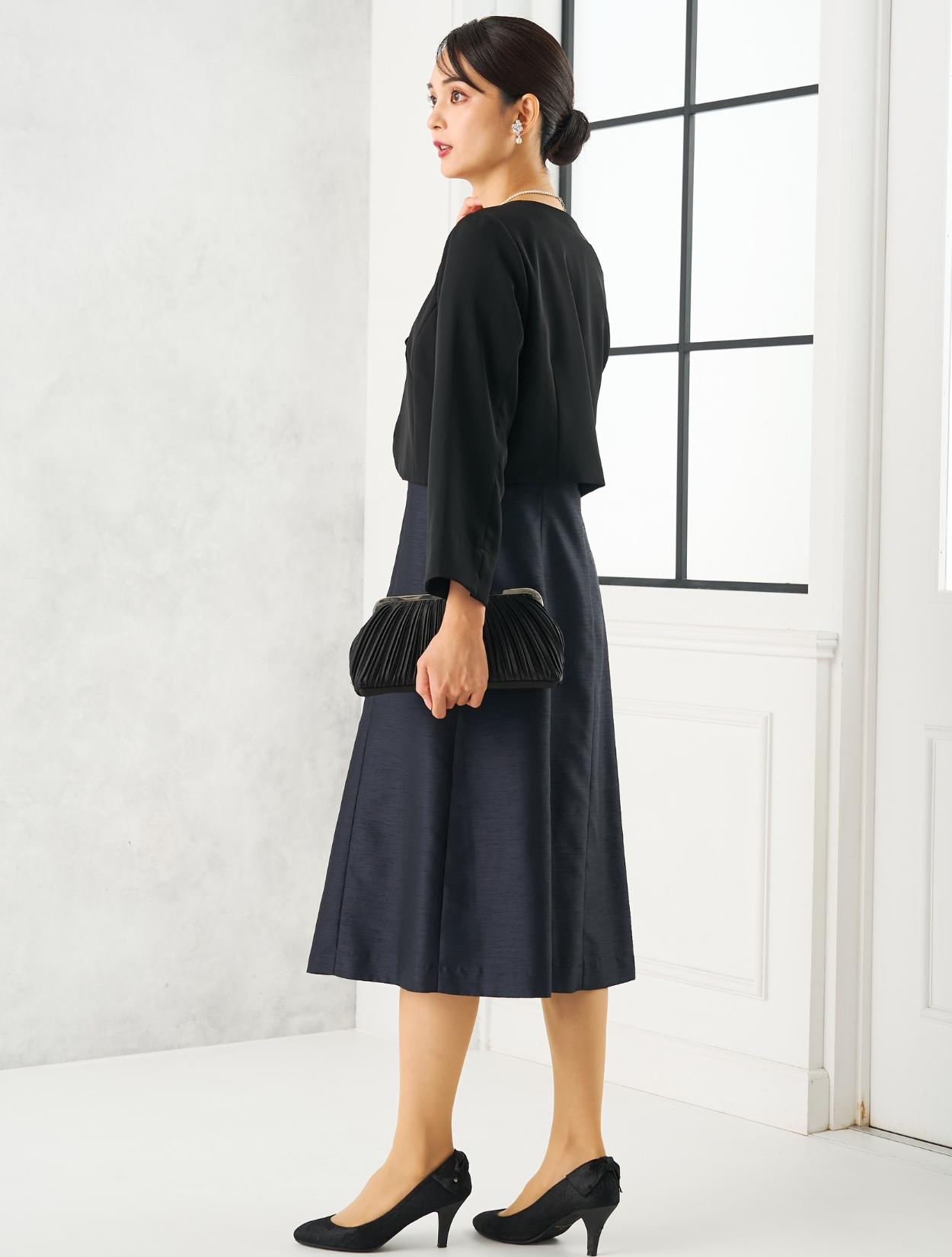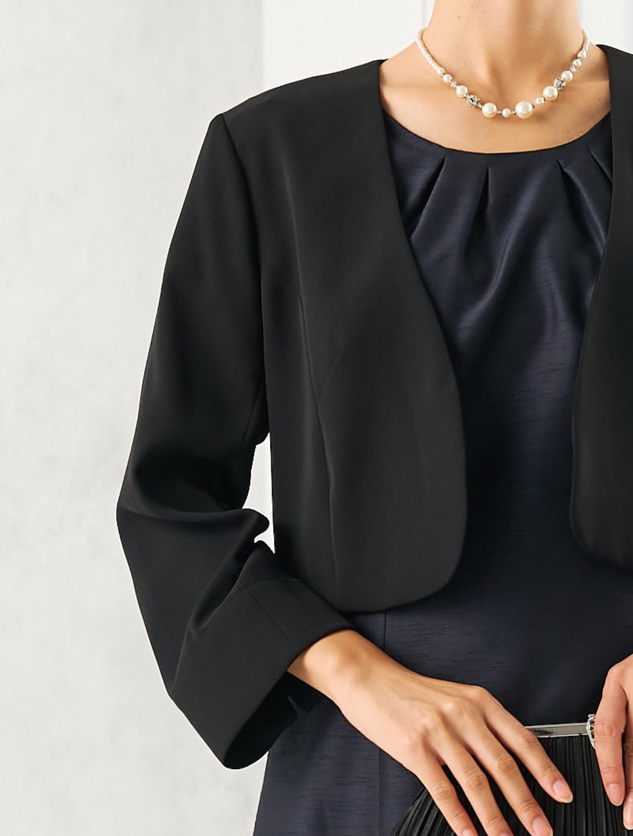 ネイビーのドレスにブラックのジャケットを合わせた、シックな親族向きのコディネート。派手過ぎず落ち着いた印象の合わせは、ゲストをお迎えする親族にぴったりです。