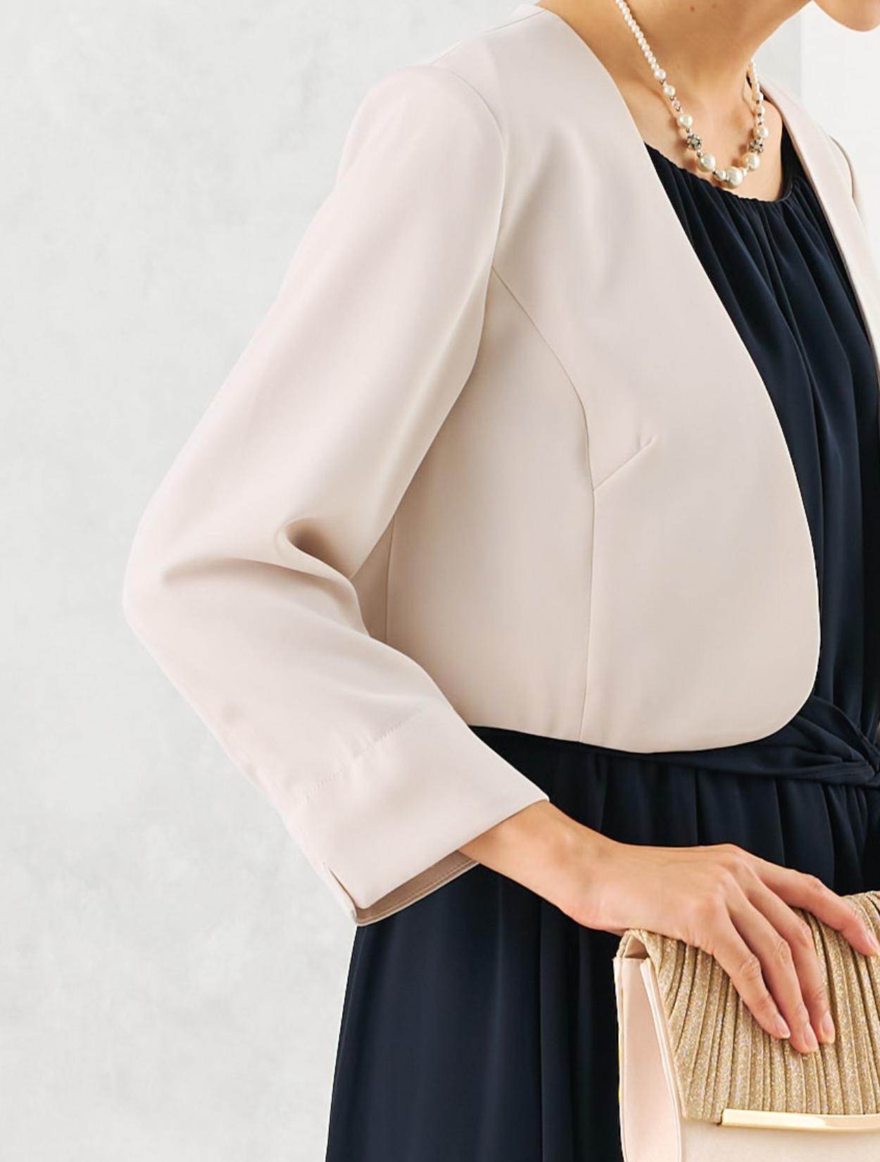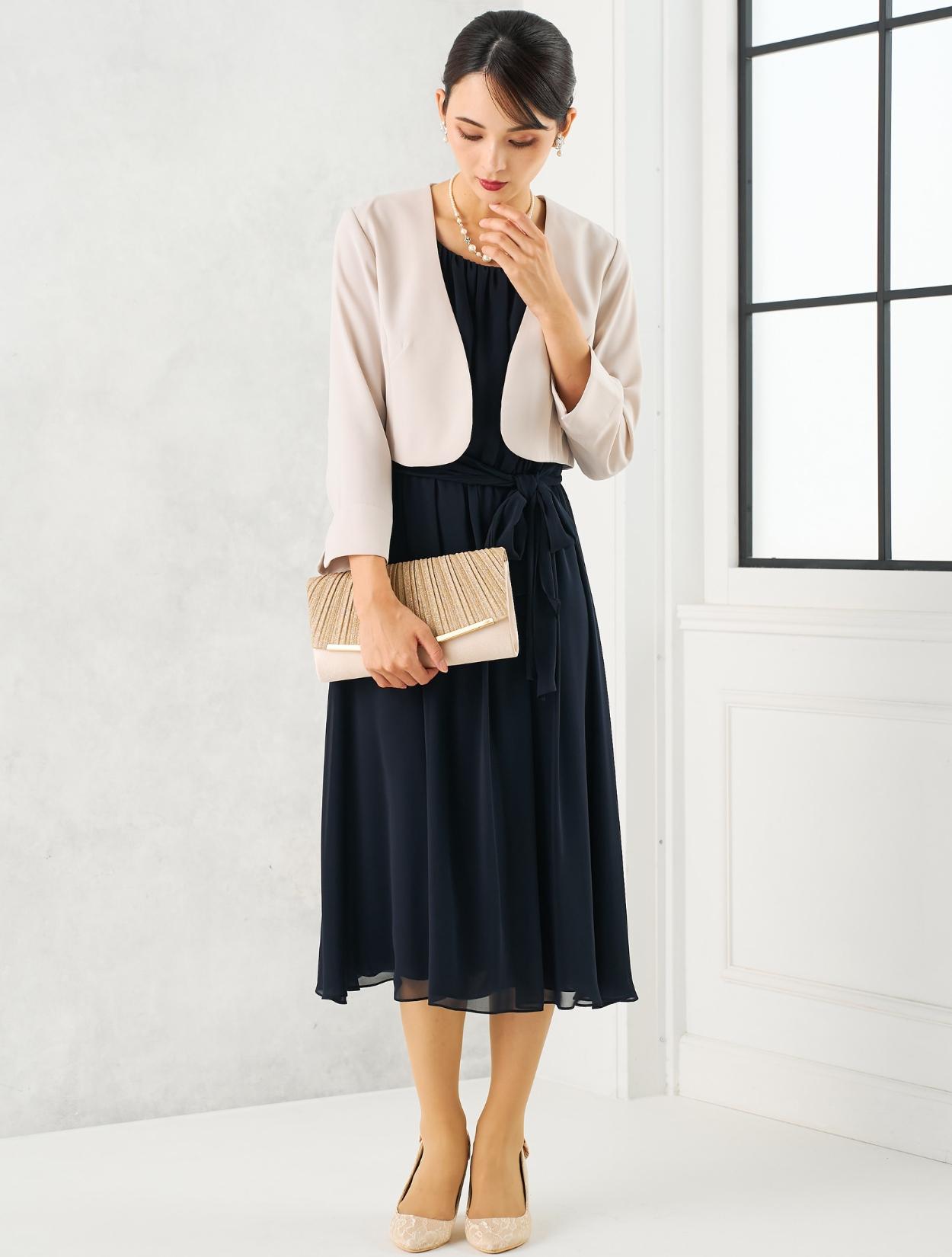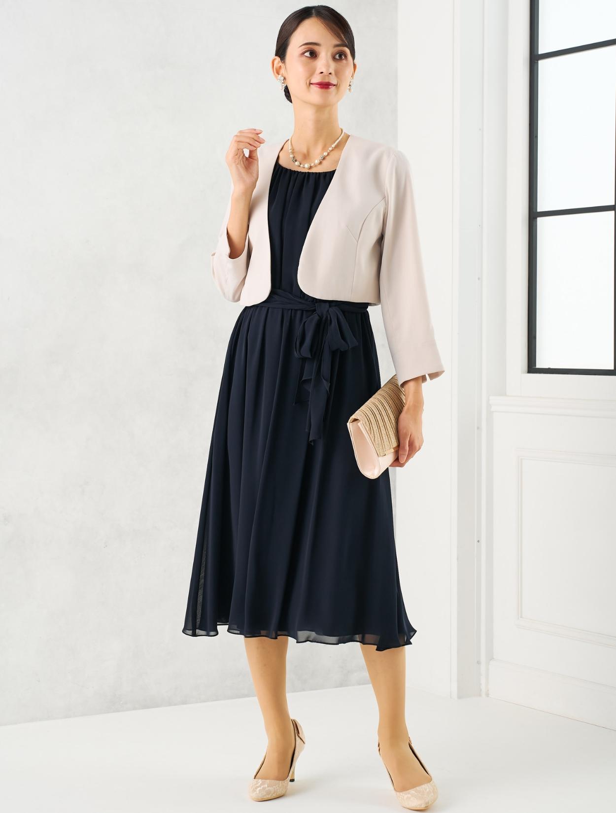 軽さのあるシフォンドレスにベージュのジャケットを合わせた上品コーデ。シンプルなシフォンドレスは、ジャケットを合わせるときちんと感が出ます。30代40代の親族におすすめです。結婚式で受付をされる方にも◎。