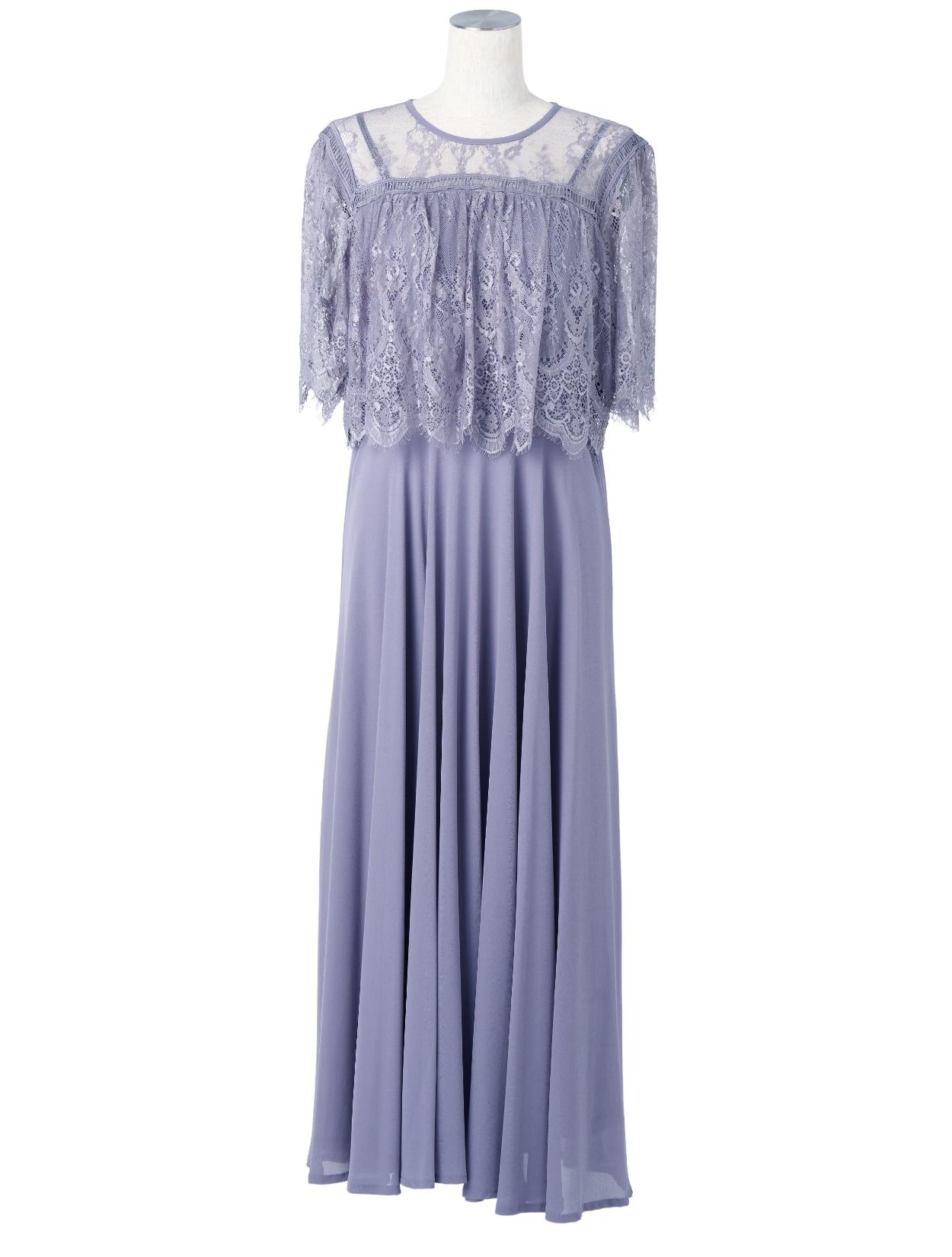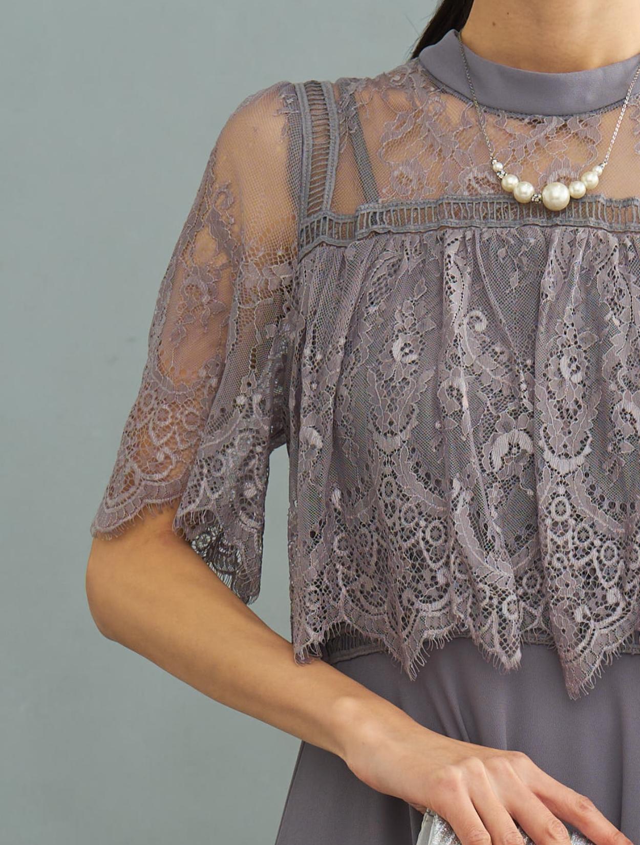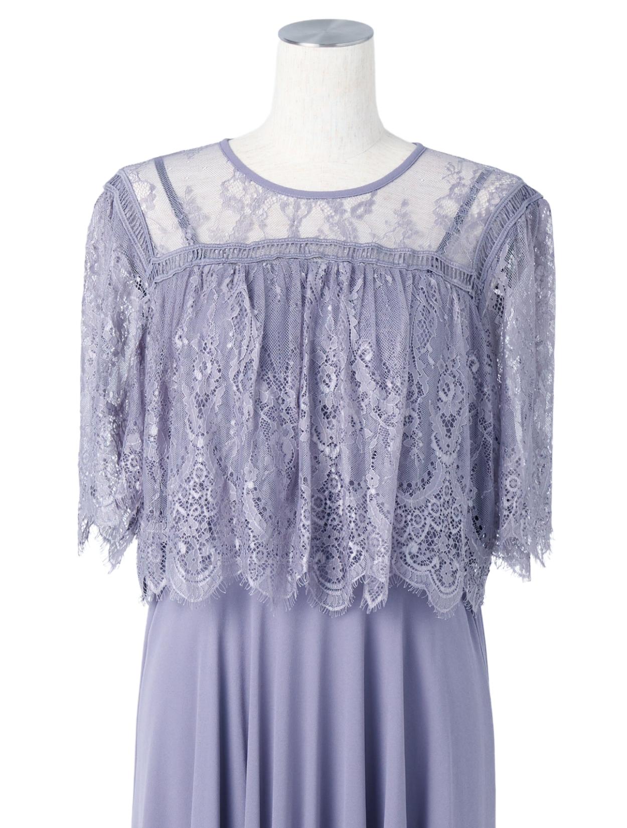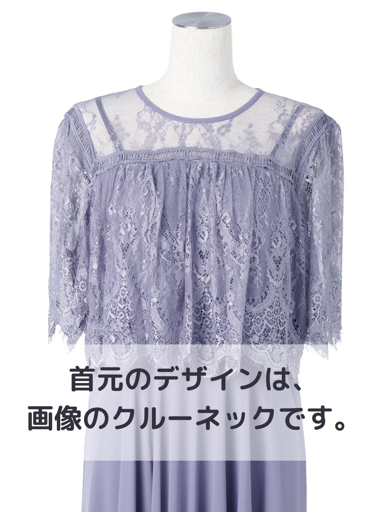 オーバーブラウス風のレースが華やかな印象のドレス。ふんわりとしたラインは、バストをきれいにカバーしてくれます。レースのお袖は長すぎないハーフスリーブ。肘下をしっかり出すことで抜け感が出て、ロング丈ドレスでも重たく見えません。レース部分の着丈は短めにデザインされているので、足長効果もありスタイルアップが叶います。お顔回りがすっきり見えるように、LL以上のおサイズはクルーネックのデザインを採用しています。レースの透け感のあり、首元が詰まって見えにくいです。
