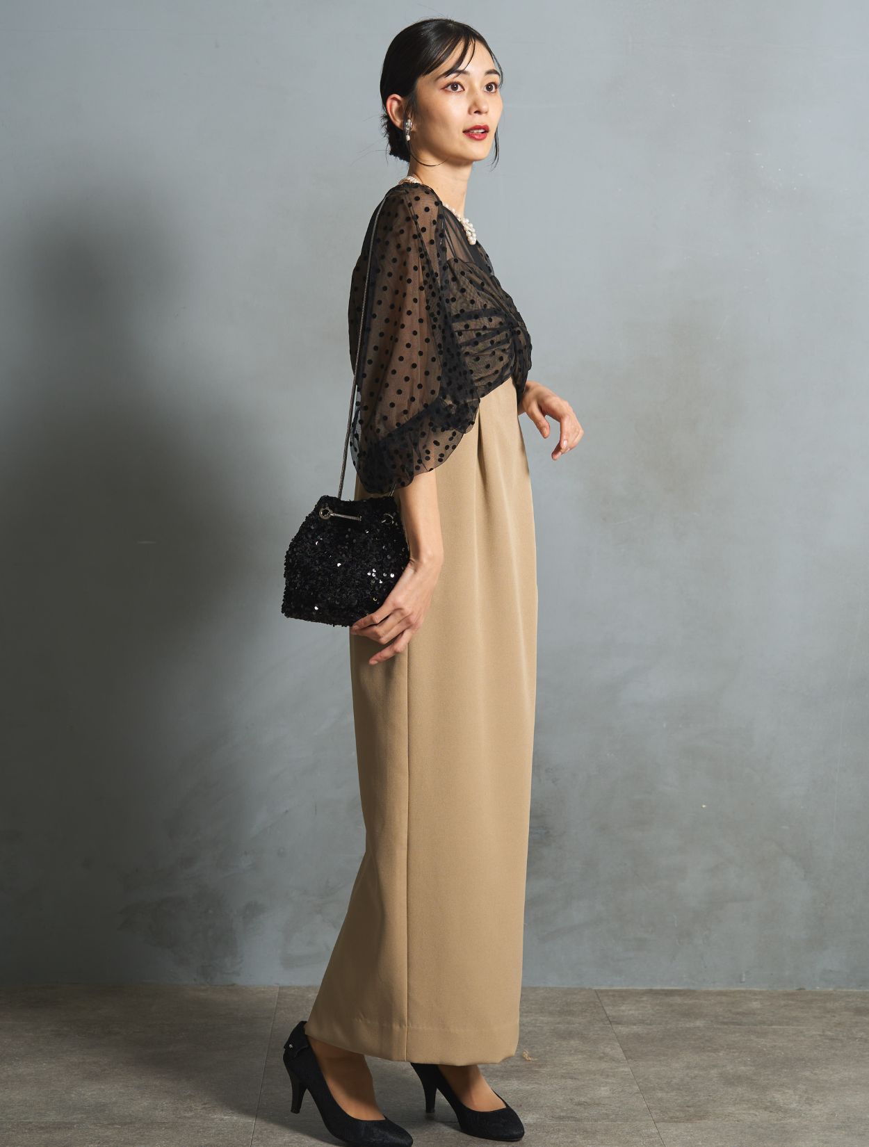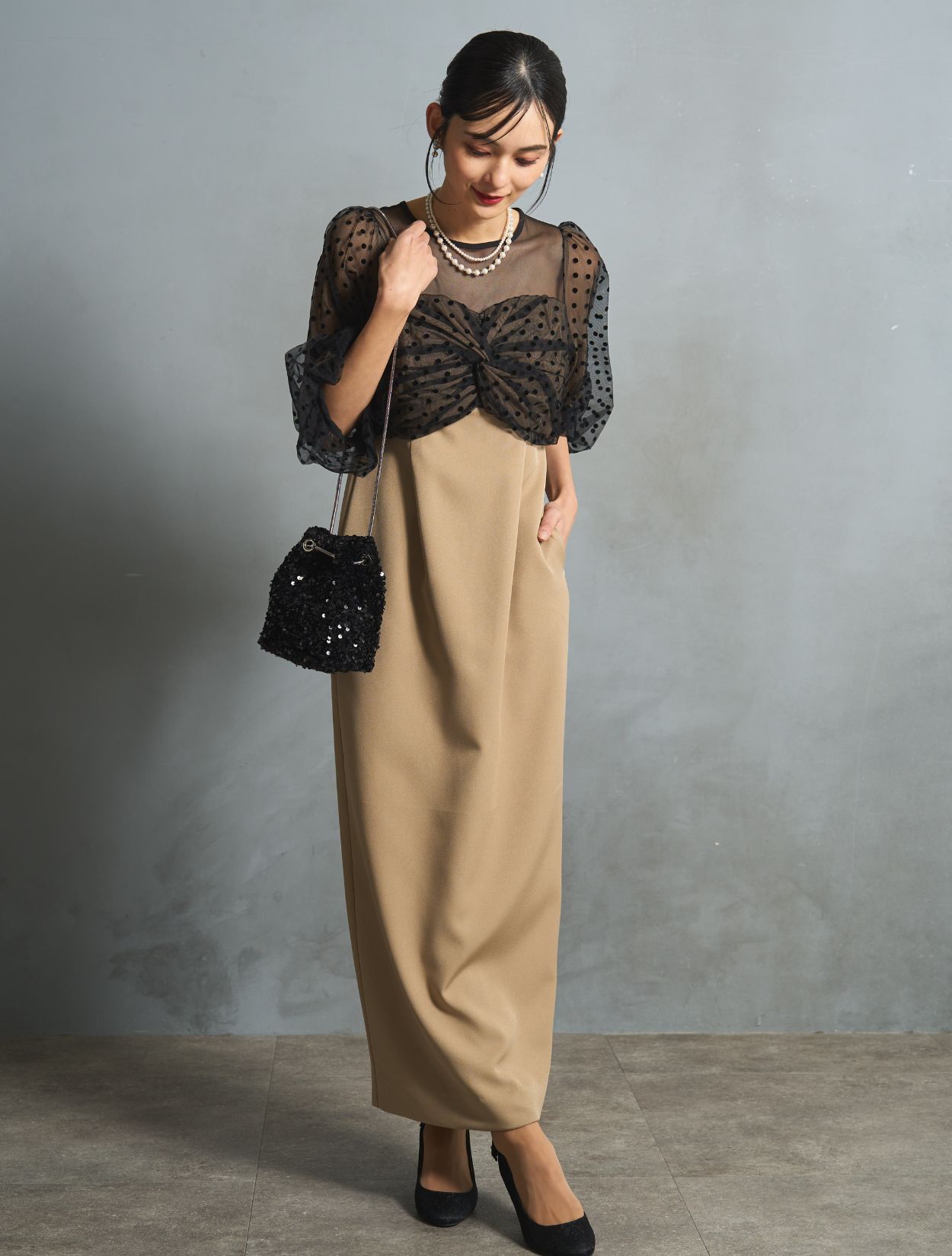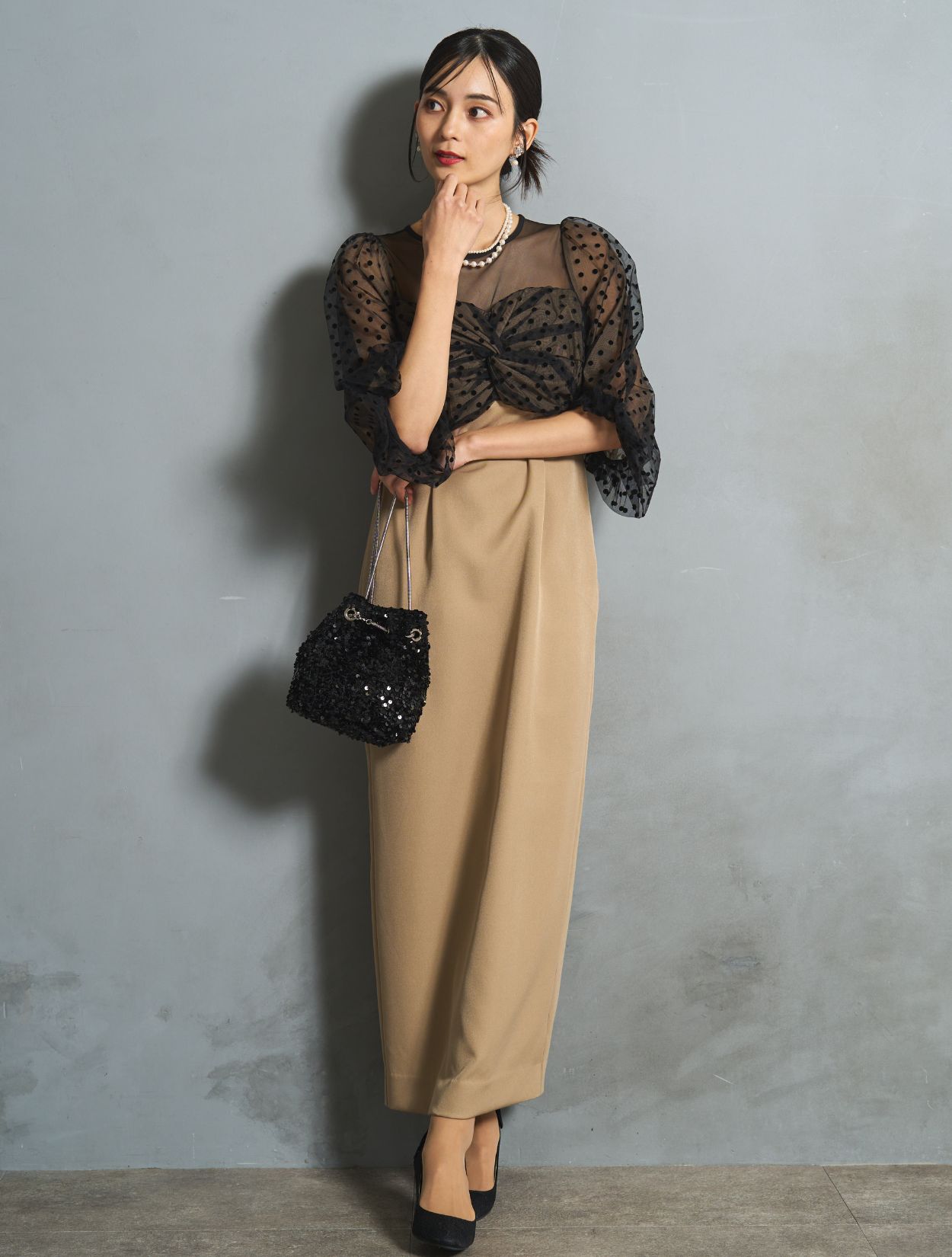 ドット柄が目を引くトレンド感のあるドレス。ペンシルラインのデザインで全体の印象を大人っぽく仕上げているので、ドット柄でも甘くなり過ぎず20代30代でも品よく着こなせるドレスです。スリーブはセットインスタイルで、肩の切替が肩先よりも内側にきます。デコルテが華奢な方でも貧相に見えにくく、肩幅がある方でもカバーして着られます。ふんわりとしたバルーンスリーブは短すぎず長すぎず、上手に露出を抑えつつ、手首を華奢に見せてくれる絶妙な長さです。トップのツイストデザインは、程よくボリュームがありシックな配色のドレスも華やかに見せてくれます。アンダーバストに切り替えがあるので、脚長効果は抜群です。ウエスト後部分はゴム仕様で着心地も◎。ドレスには珍しく、スカートにポケットが付いています。ポケットにたくさん物を入れるとシルエットが崩れるので要注意です。ドット柄はこれまでカジュアルな側面もありました、知的な印象もある小さいドットにシックな配色で、トレンド感のある今っぽいお呼ばれドレス・ワンピースを探している方に人気です。