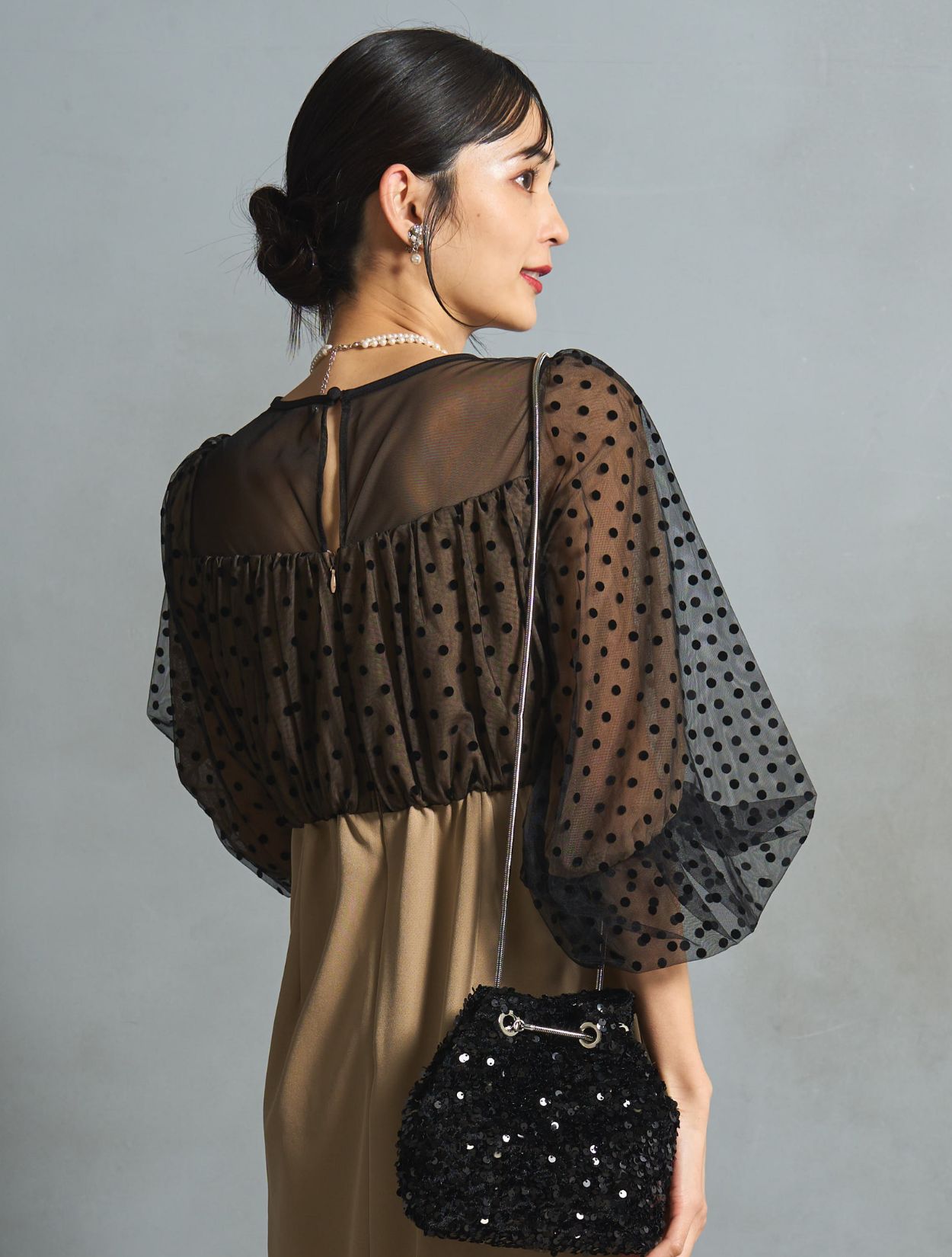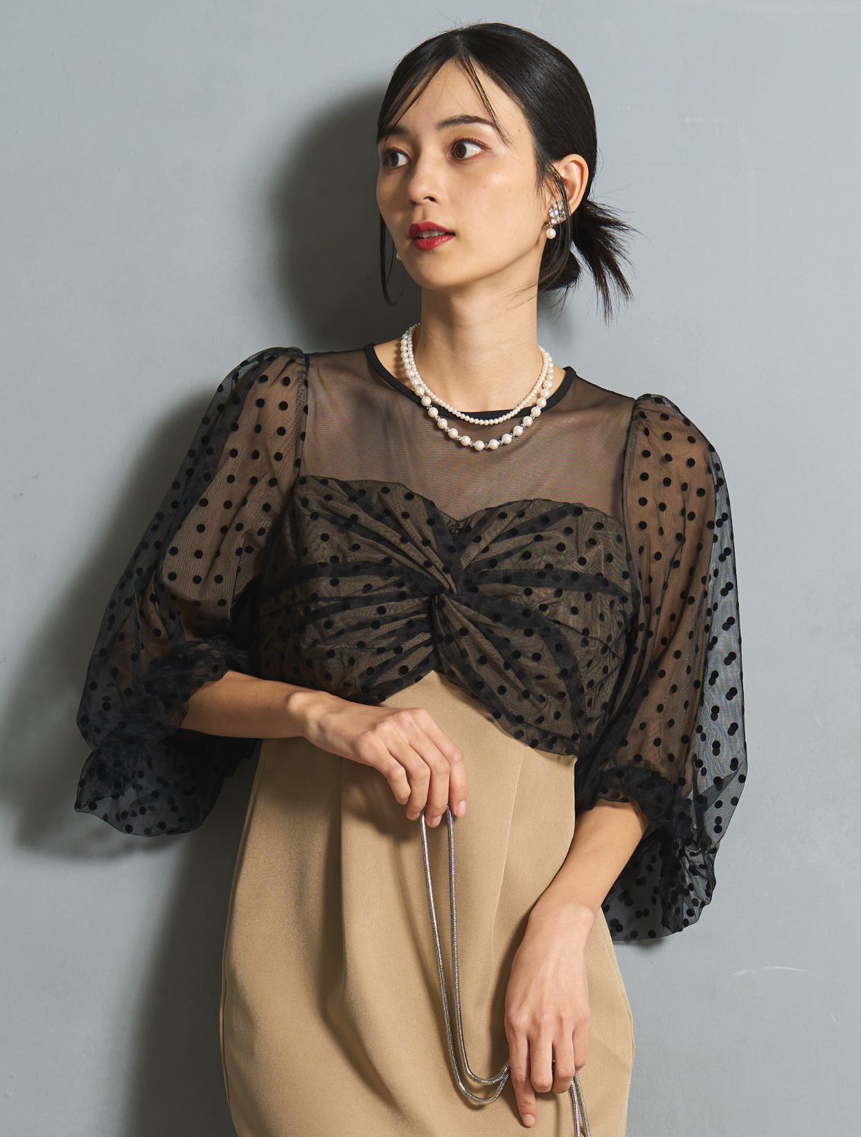 柔らかく赤味のあるビスケットのようなベージュカラー。黄味が強くないので、イエベ・ブルべどちらの肌にも馴染みやすい色味です。お顔回りはブラックカラーですが、シアー素材で重たく見えません。裏にベージュを重ねているので、ポイントのドット柄が良く見えて◎。