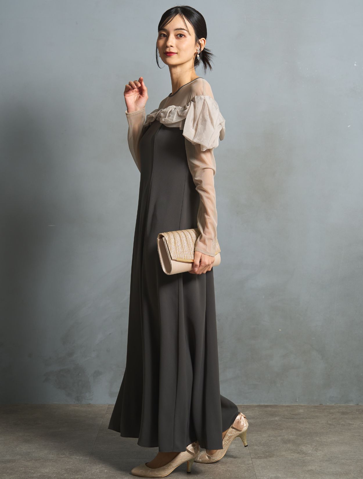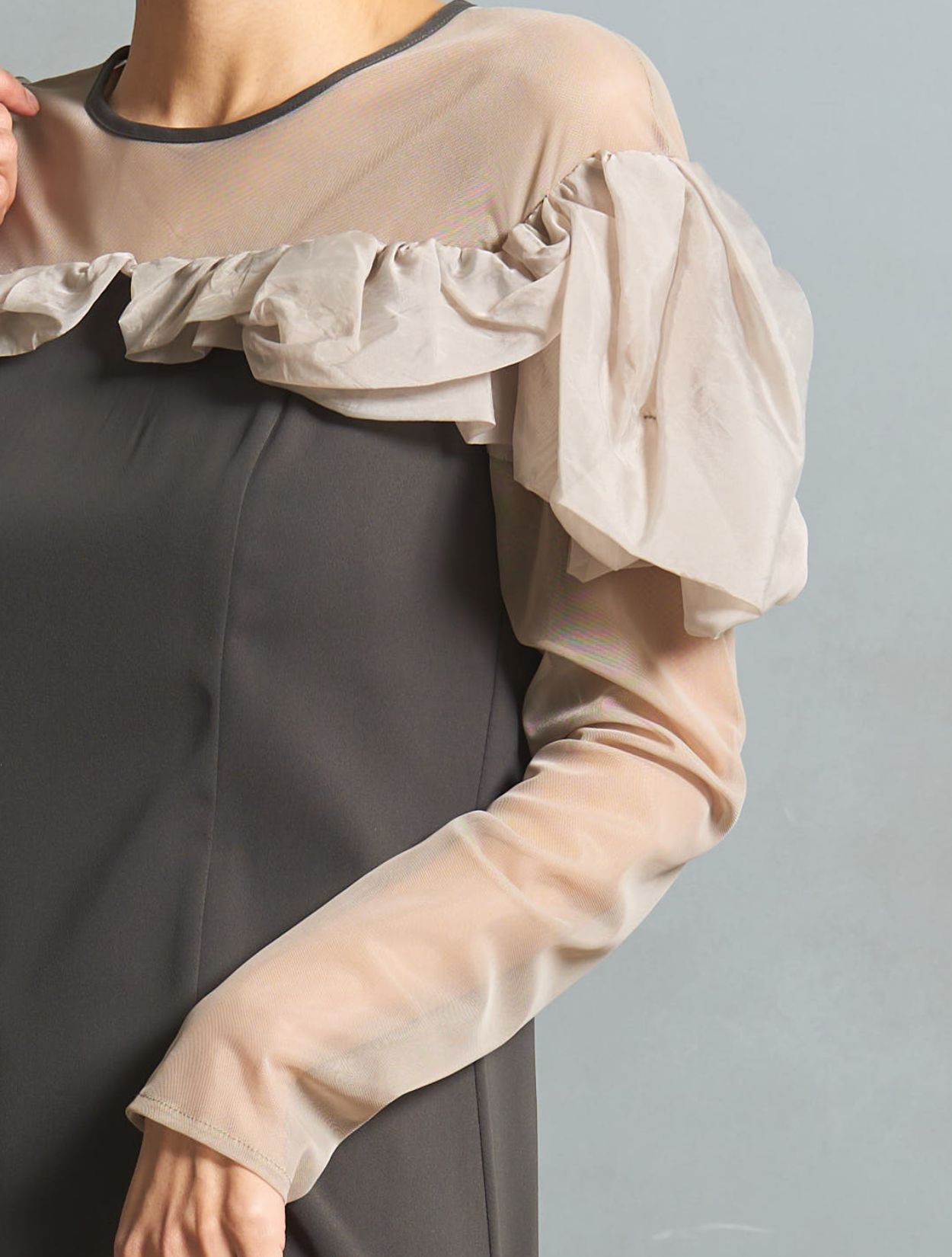 シンプルなAラインスカートのドレスに、トレンド感のあるフリルがポイントのドレス。フリル部分には立体感と艶のあるソフトオーガンジー、デコルテからスリーブ部分にはマットチュールが使われており、異素材の組み合わせがさりげなくおしゃれに見せてくれます。ネック部分にはパイピングがされており、お顔回りにメリハリをプラス。ネックラインは詰まり過ぎていないので、短い首が悩みの方でも着こなしやすいデザインです。ウエストにかけて自然とくびれて、華やかにフレアに広がるスカートのワンピースは、シンプルながらもスタイルアップ効果抜群です。お腹周りはスッキリ見えるのに締め付け感はなく、背中部分のウエストはゴム仕様なので、サイズ感にも余裕が出ます。スカートには透け感がないので、重たく見えないように5?以上のヒールと合わせるのがスタイルアップ効果もありおすすめです。程よく透け感がありつつも全体的に露出を抑えたドレスは、肌見せが苦手な方でも着やすいです。