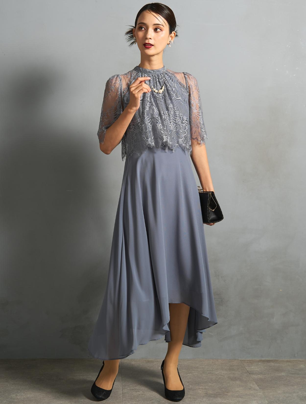 ヘム裾スカートが華やかなデザインのドレス。長すぎない丈感は、低身長の方にもおすすめです。ウエストの切り替えは、表からは見えないですが高めに設定されているので脚長効果抜群。低身長の方でもバランスよく着こなせます。フワッとしたオーバーブラウス風レースが、ウエストや腰周りをすっきり見せてくれる人気のデザイン。着痩せ効果がかなり期待できます。ウエストは背中部分のみゴム仕様で、着心地も◎。ミニスタンドネックが上品でクラシカルな印象。結婚式などのフォーマルな場面にぴったりです。肩から袖は透け感がありますが、デコルテ部分は透けないので幅広い年代が安心して着られます。