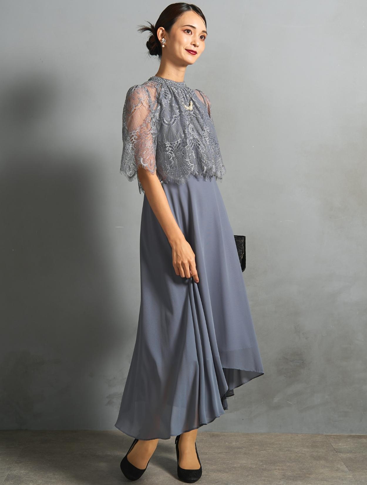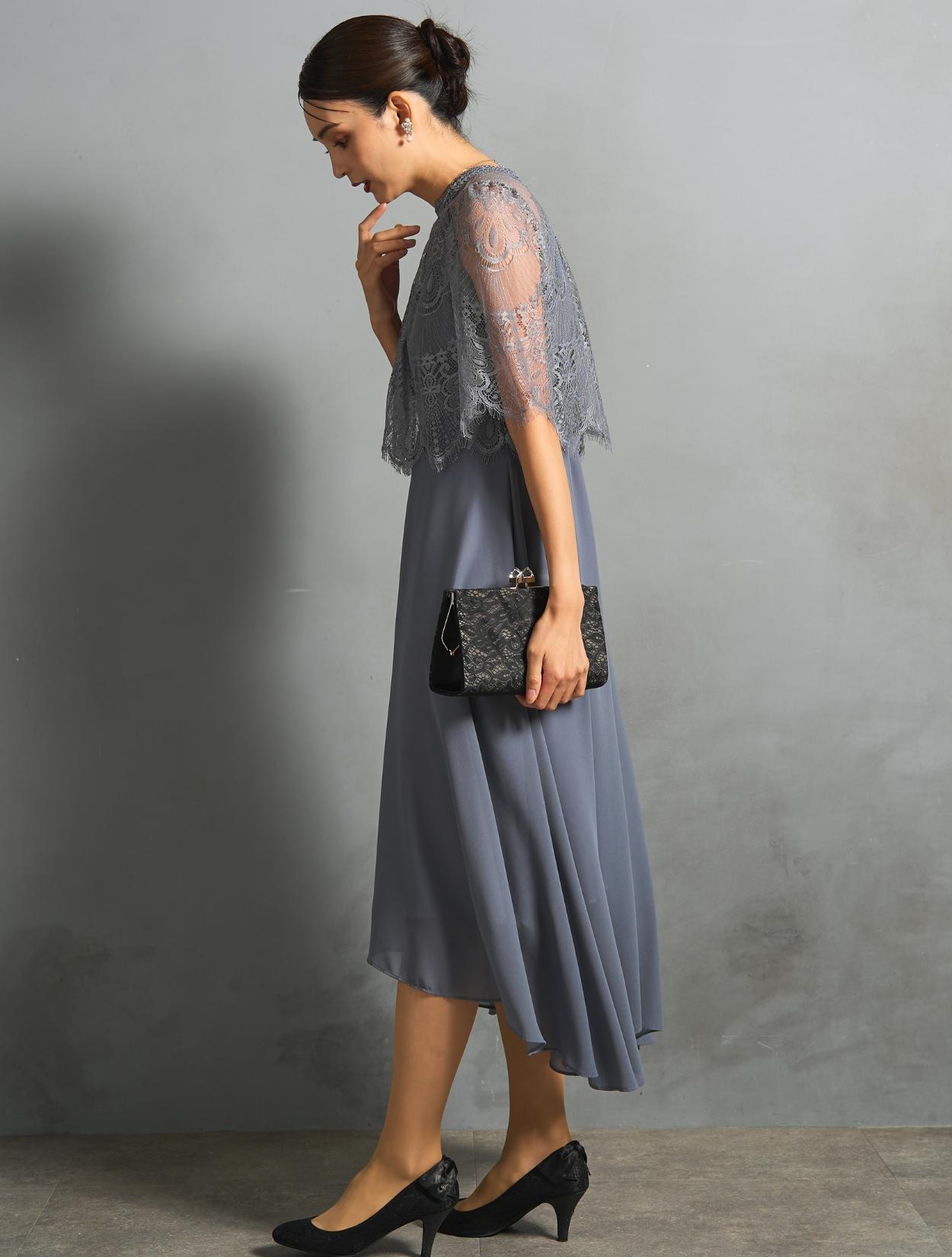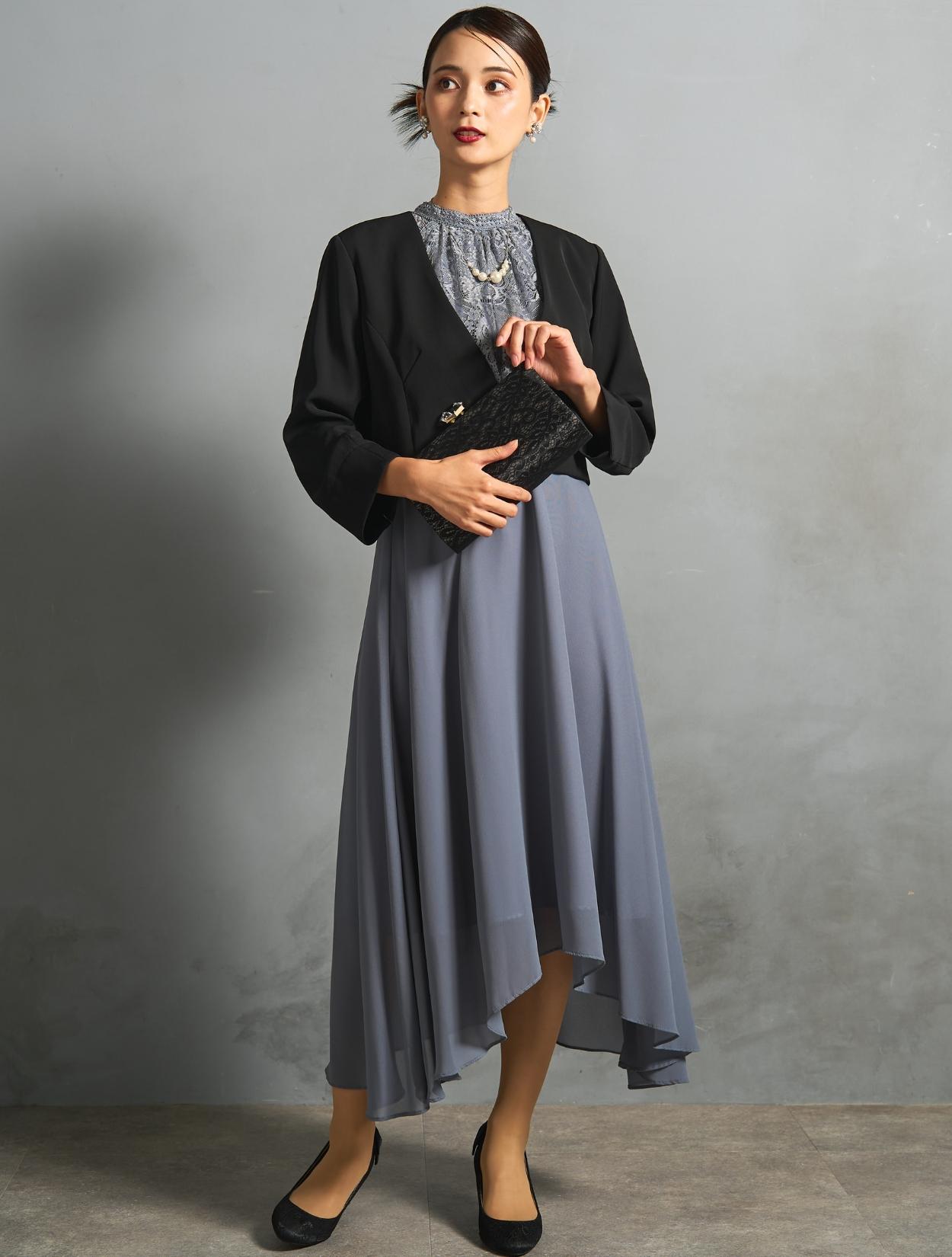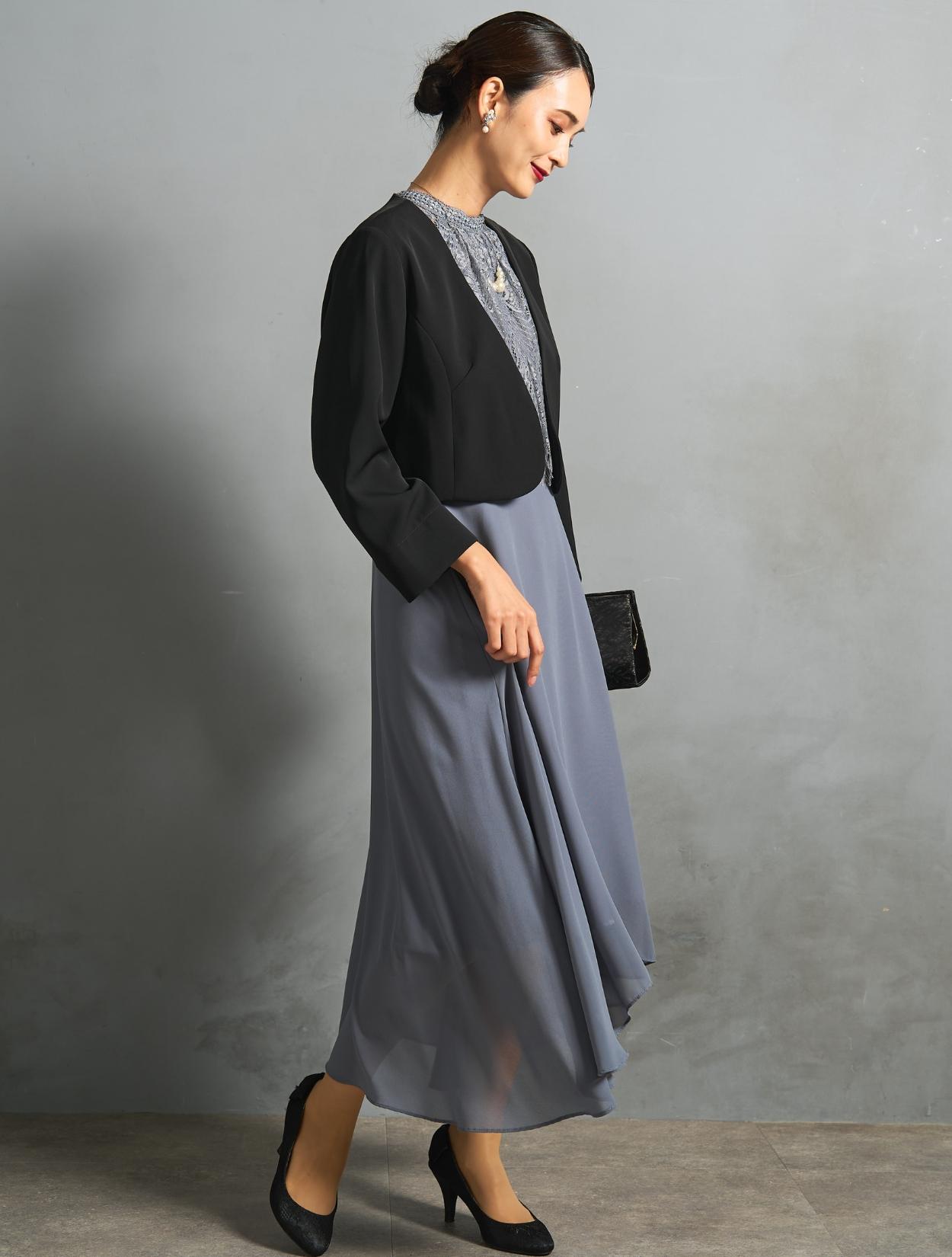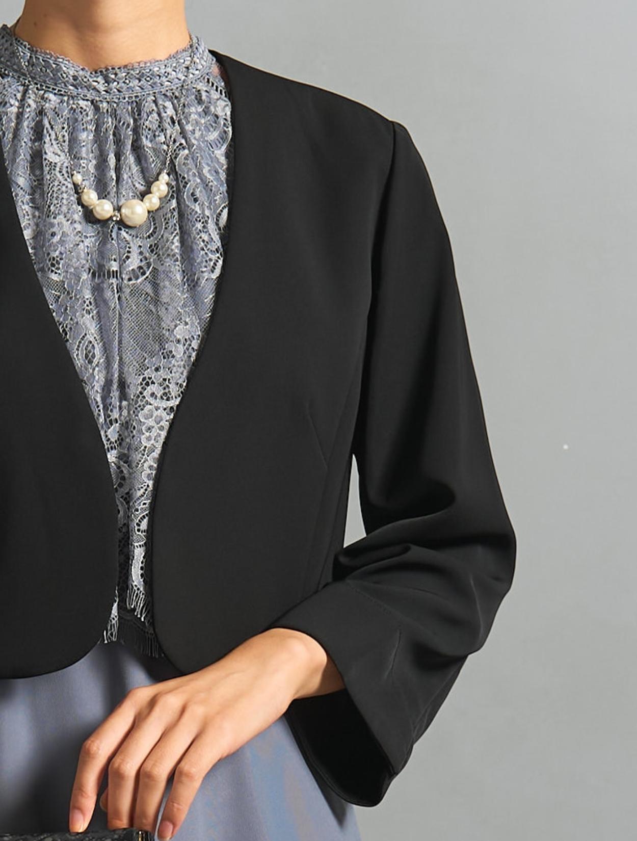 ブルーグレーのドレスにブラックジャケットを合わせた、きちんと感のある親族向きのコーディネート。ジャケットはペプラム仕様のデザインで、ブラックでも地味過ぎずフェミニンな雰囲気もあります。カラードレスを着たいご親族におすすめです。スタンドネックのデザインをスッキリ着こなす、長めのネックレスを合わせています。首が短いのがお悩みの方でも、視覚効果で詰まって見えにくいです。