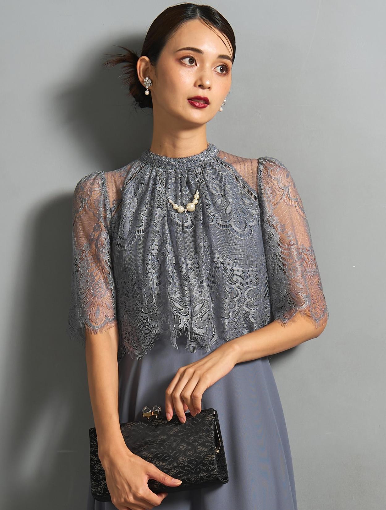 ヘム裾スカートが華やかなデザインのドレス。長すぎない丈感は、低身長の方にもおすすめです。ウエストの切り替えは、表からは見えないですが高めに設定されているので脚長効果抜群。低身長の方でもバランスよく着こなせます。フワッとしたオーバーブラウス風レースが、ウエストや腰周りをすっきり見せてくれる人気のデザイン。着痩せ効果がかなり期待できます。ウエストは背中部分のみゴム仕様で、着心地も◎。ミニスタンドネックが上品でクラシカルな印象。結婚式などのフォーマルな場面にぴったりです。肩から袖は透け感がありますが、デコルテ部分は透けないので幅広い年代が安心して着られます。