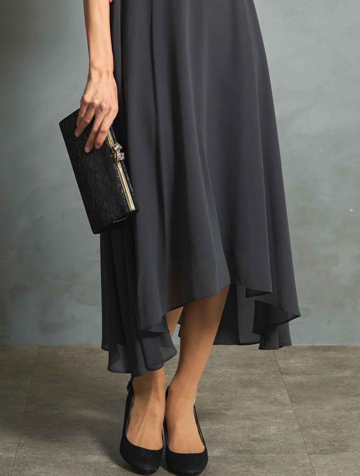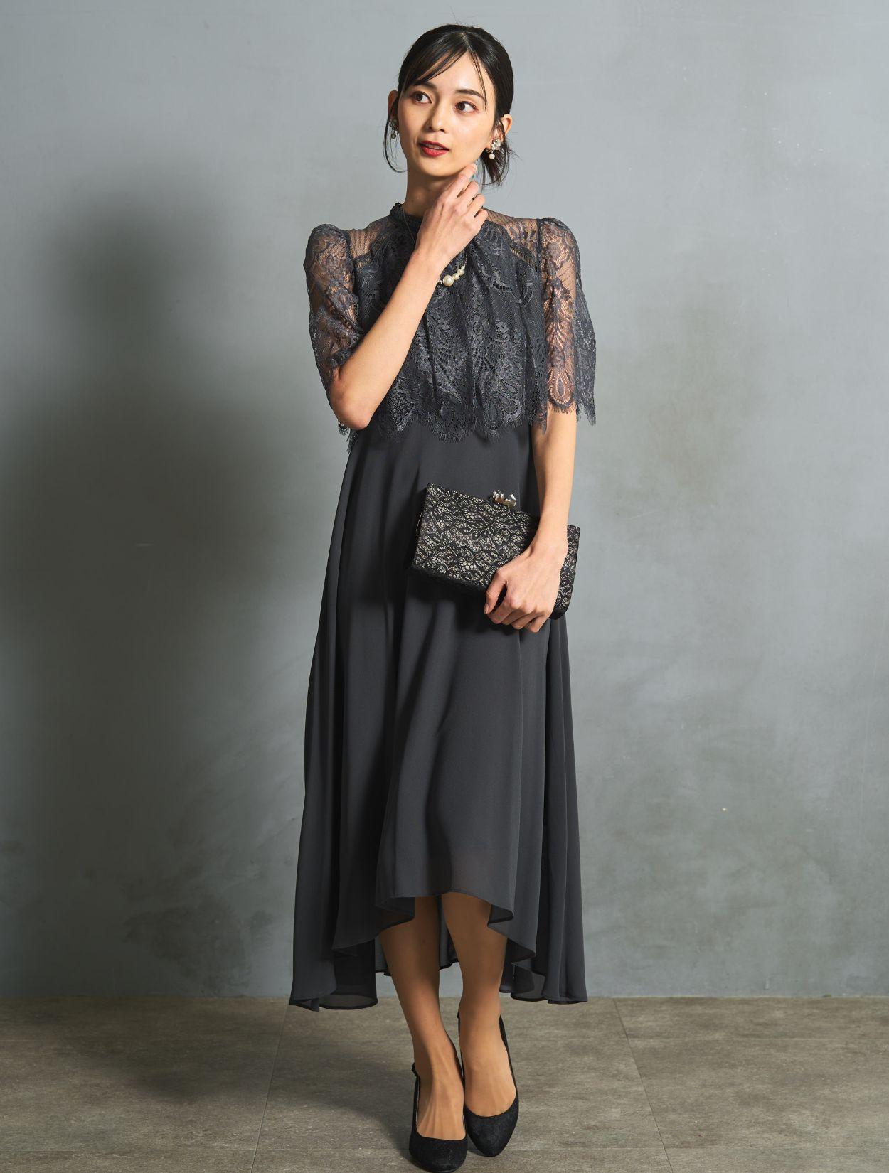 チャコールグレーのドレスにブラックのバッグを合わせたシックで大人っぽい組み合わせ。落ち着いた印象で、ご親族コーデとしても人気です。バッグはレースの柄が程よくアクセントになりドレスに立体感がでます。スタンドネックのデザインをスッキリ着こなす、長めのネックレスを合わせています。首が短いのがお悩みの方でも、視覚効果で詰まって見えにくいです。
