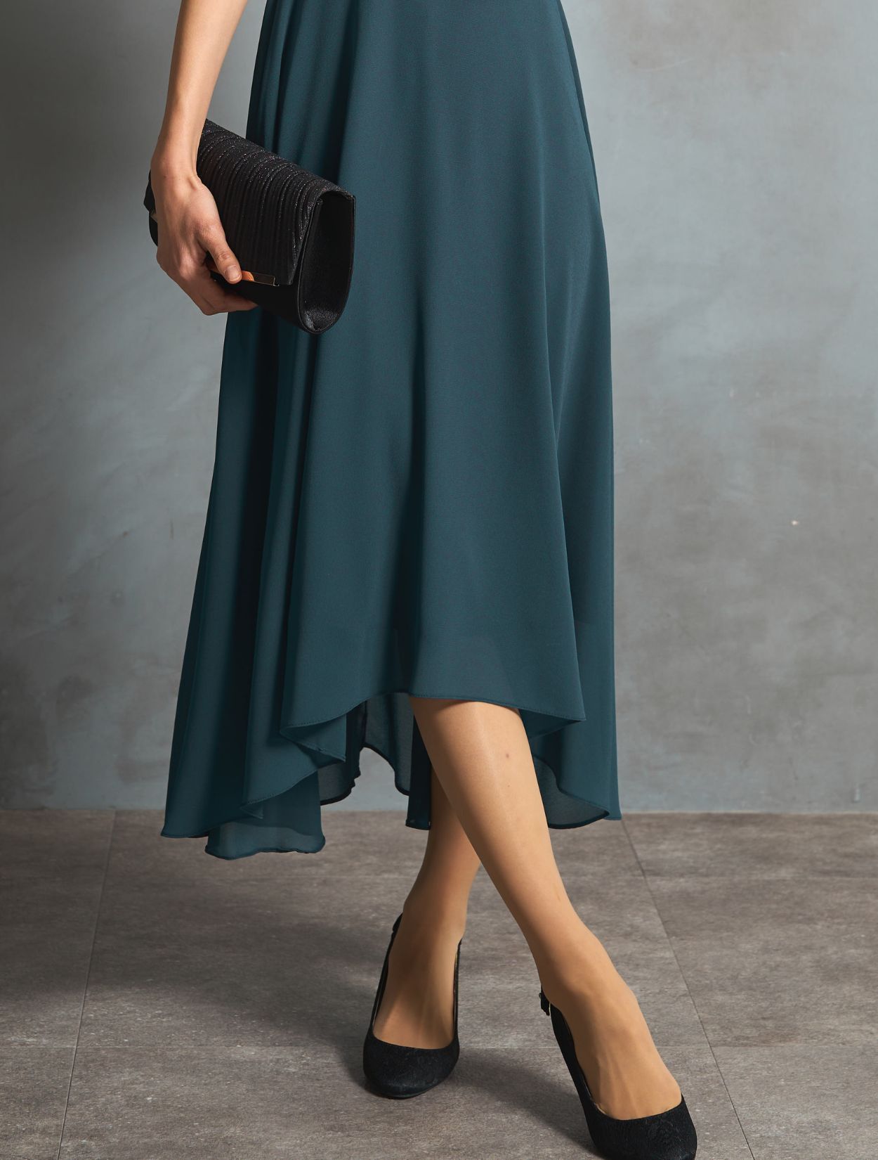 ヘム裾スカートが華やかなデザインのドレス。長すぎない丈感は、低身長の方にもおすすめです。ウエストの切り替えは、表からは見えないですが高めに設定されているので脚長効果抜群。低身長の方でもバランスよく着こなせます。フワッとしたオーバーブラウス風レースが、ウエストや腰周りをすっきり見せてくれる人気のデザイン。着痩せ効果がかなり期待できます。ウエストは背中部分のみゴム仕様で、着心地も◎。ミニスタンドネックが上品でクラシカルな印象。結婚式などのフォーマルな場面にぴったりです。肩から袖は透け感がありますが、デコルテ部分は透けないので幅広い年代が安心して着られます。