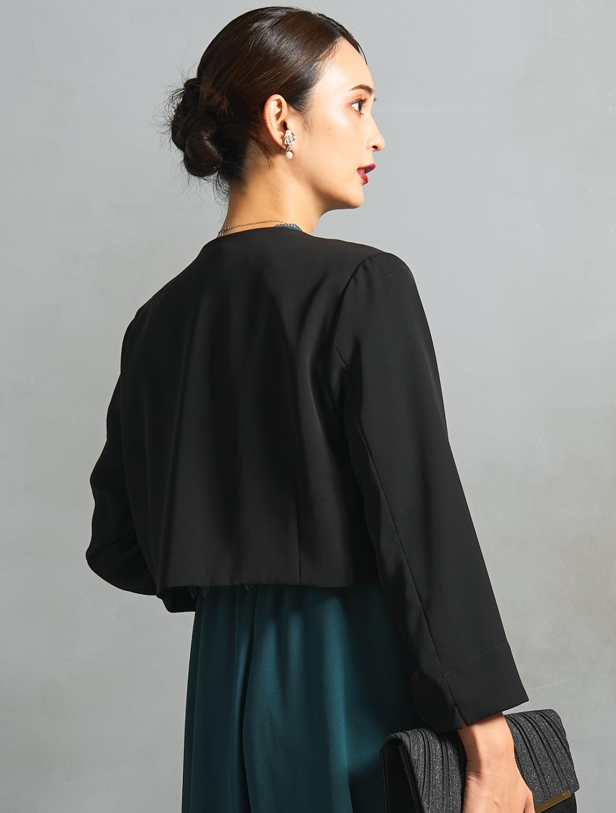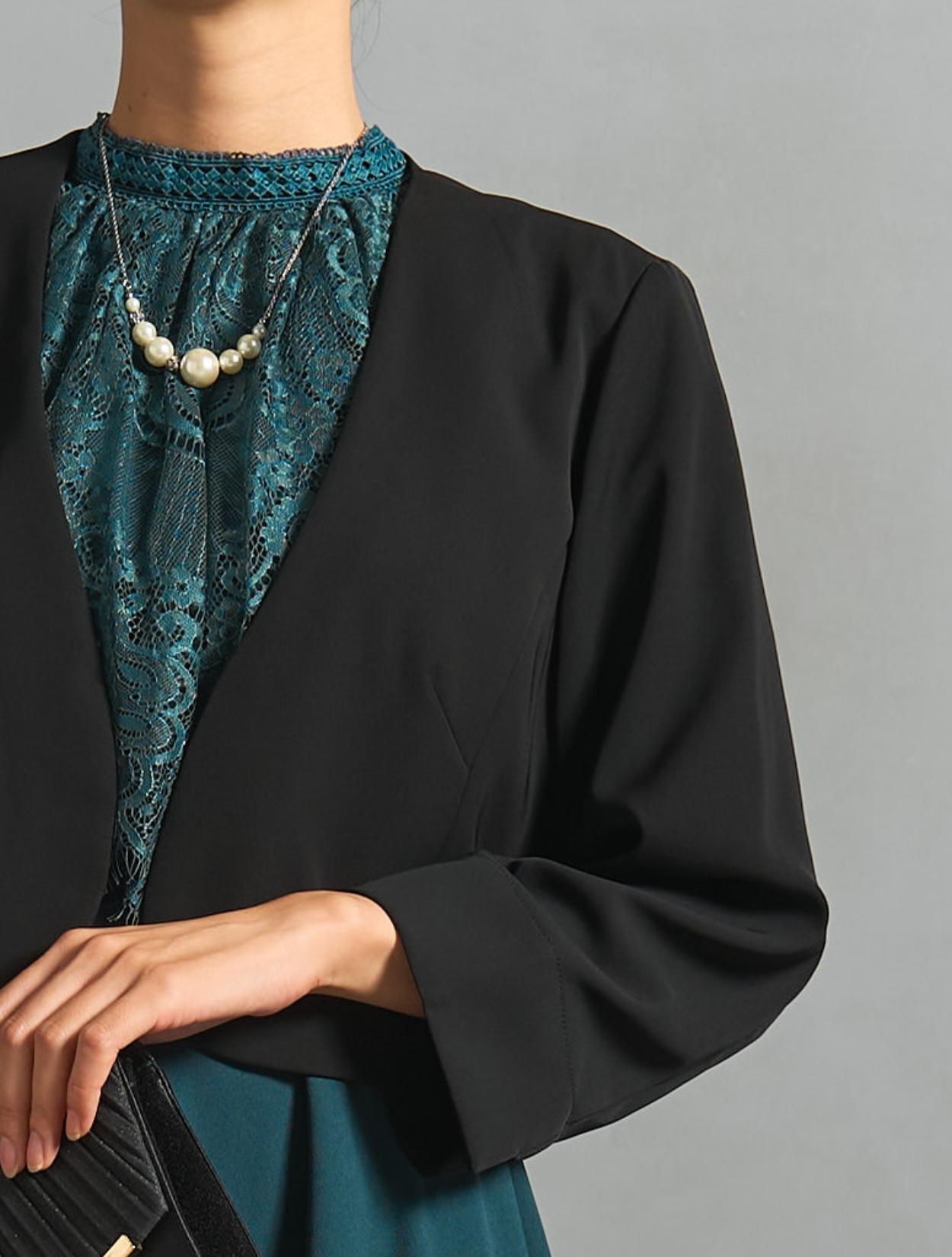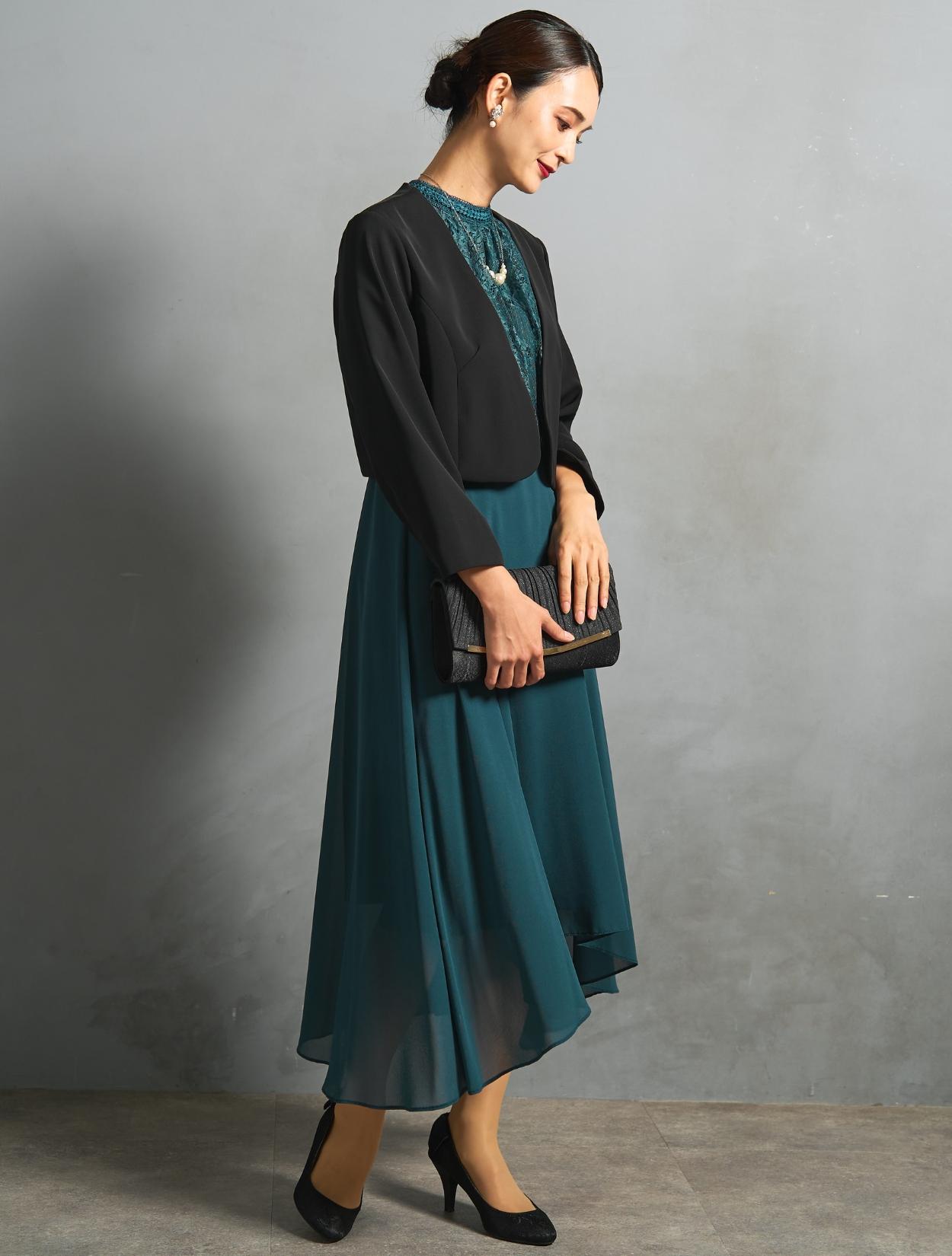 グリーンのドレスにブラックのジャケットを合わせたきちんと感のあるコーディネート。カラードレスを着たい親族におすすめのセットです。ブラックジャケットは、ドレスのグリーンが更に引き立ちますので地味に見え過ぎないのもポイント。スタンドネックのデザインをスッキリ着こなす、長めのネックレスを合わせています。首が短いのがお悩みの方でも、視覚効果で詰まって見えにくいです。