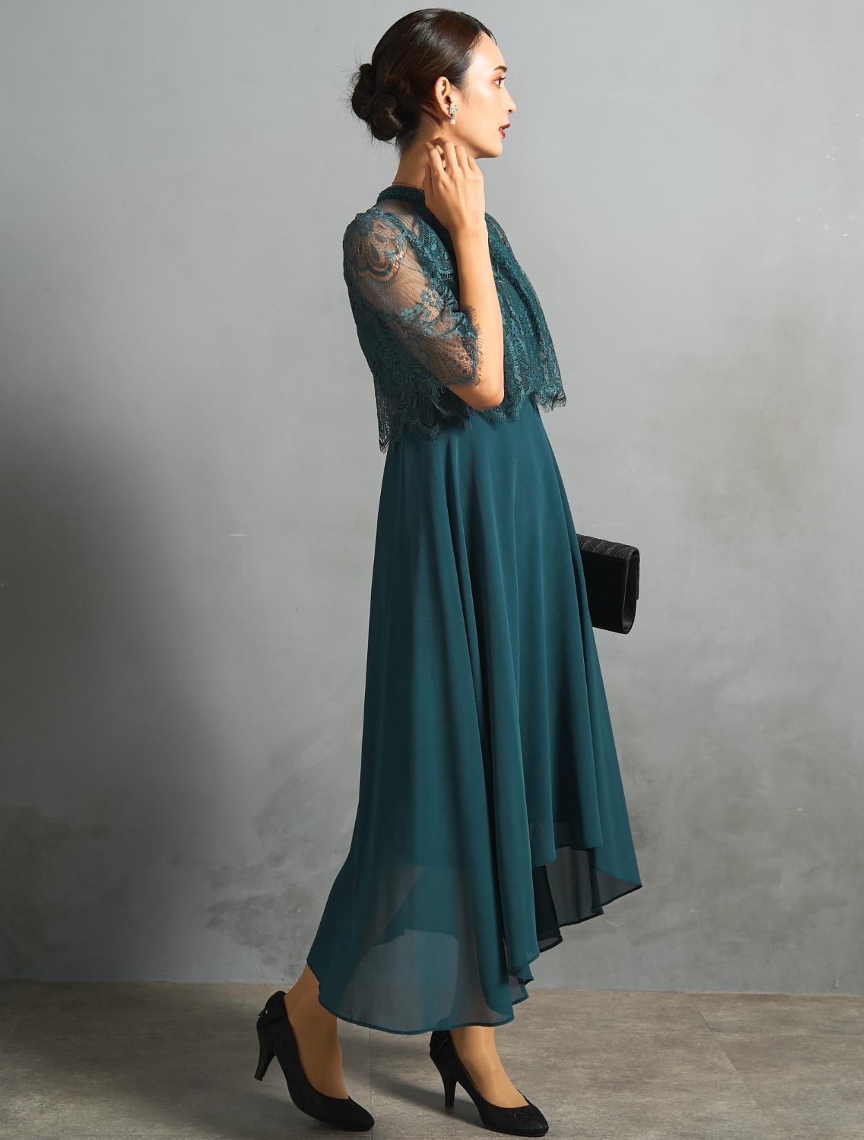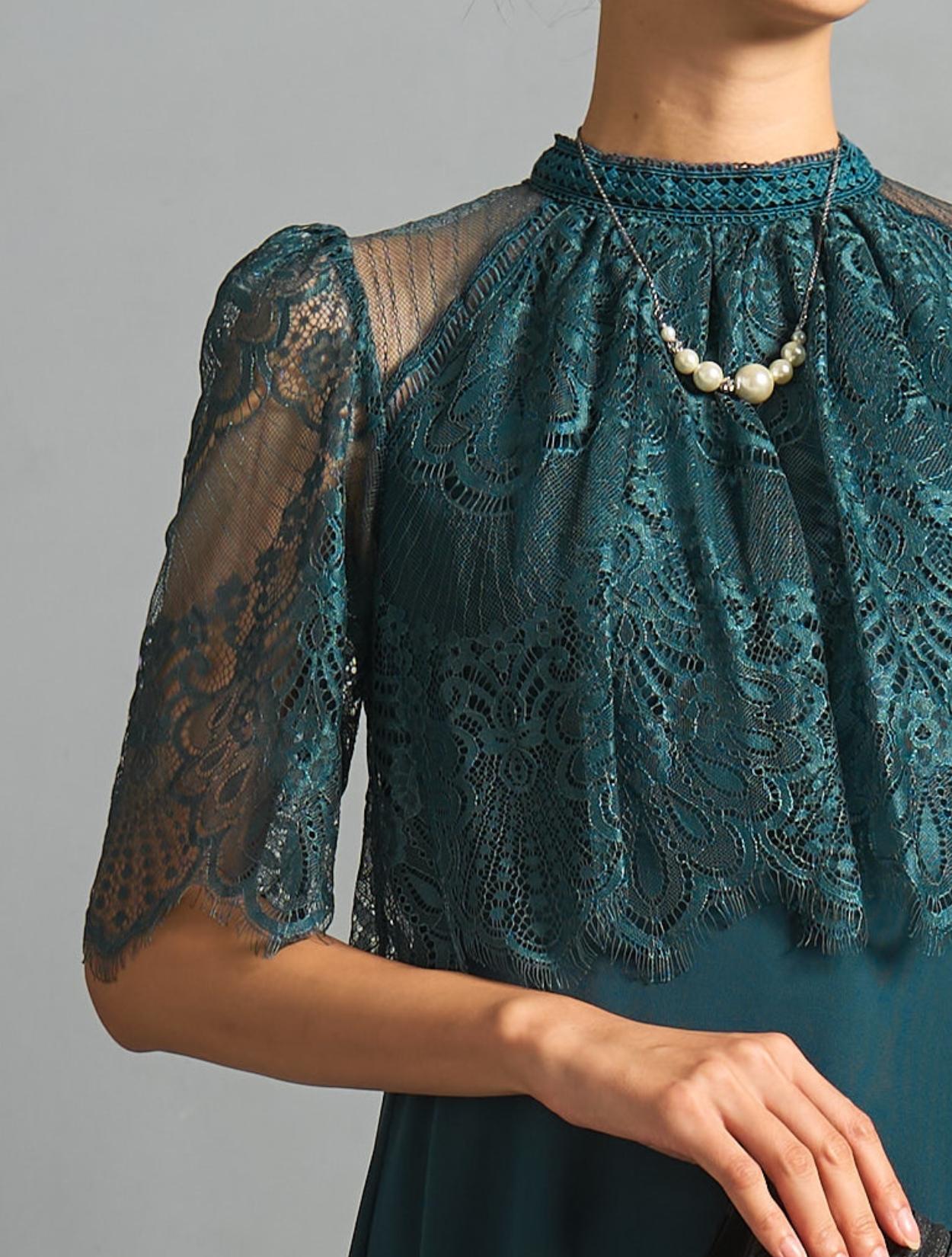 ヘム裾スカートが華やかなデザインのドレス。長すぎない丈感は、低身長の方にもおすすめです。ウエストの切り替えは、表からは見えないですが高めに設定されているので脚長効果抜群。低身長の方でもバランスよく着こなせます。フワッとしたオーバーブラウス風レースが、ウエストや腰周りをすっきり見せてくれる人気のデザイン。着痩せ効果がかなり期待できます。ウエストは背中部分のみゴム仕様で、着心地も◎。ミニスタンドネックが上品でクラシカルな印象。結婚式などのフォーマルな場面にぴったりです。肩から袖は透け感がありますが、デコルテ部分は透けないので幅広い年代が安心して着られます。