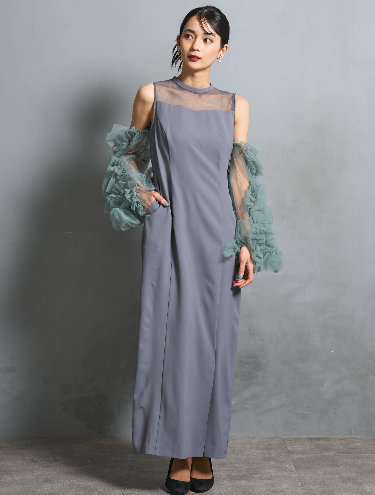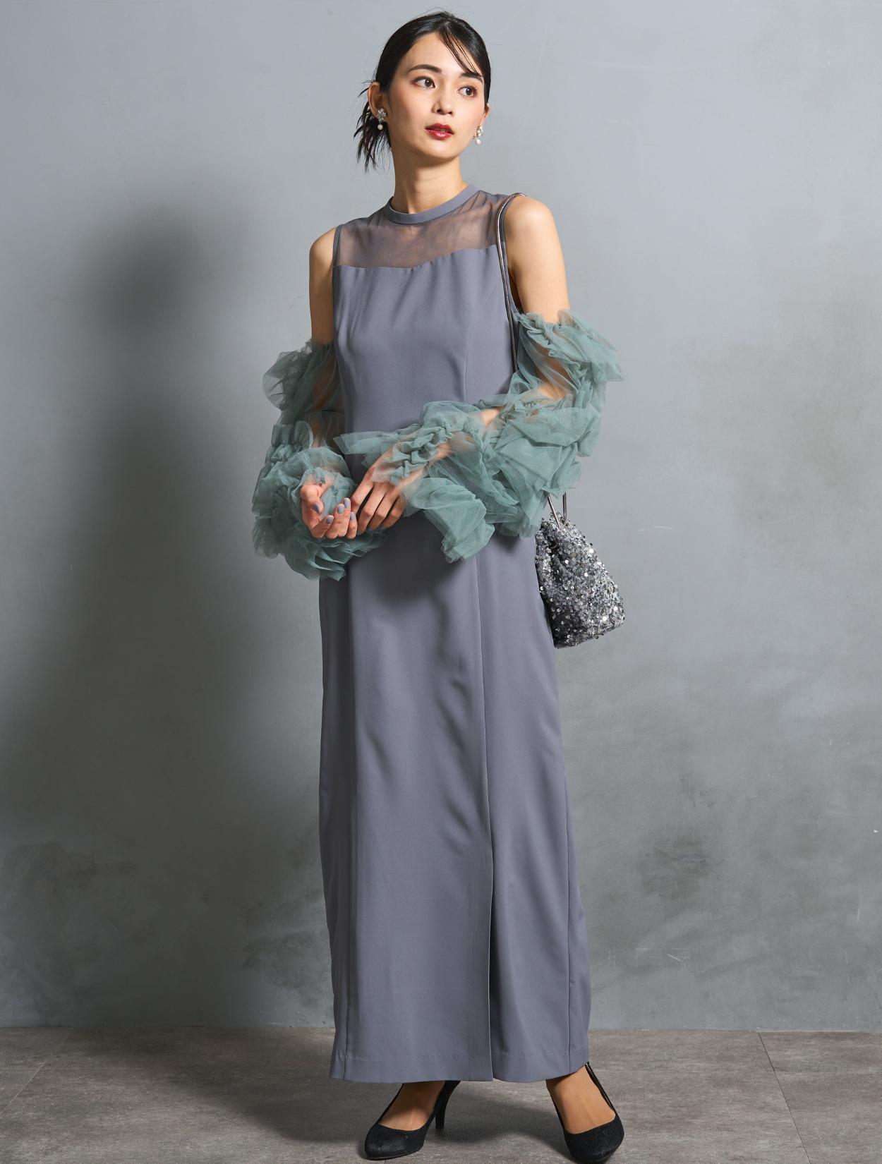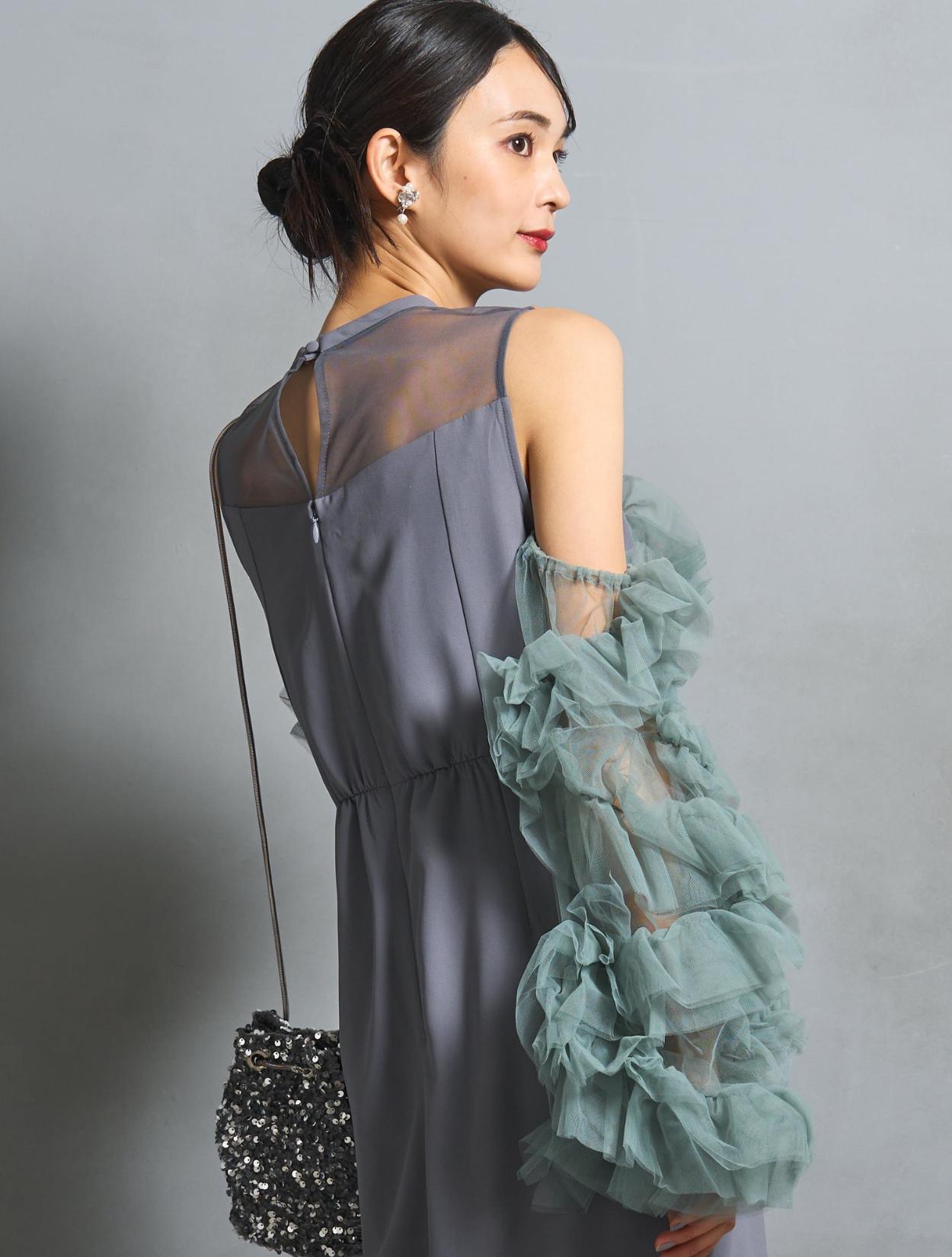 ワンピースは、モーヴブルーを感じる上品なブルーグレーカラー。袖のチュールは、南国の海の様な透明感のあるアクアグリーン。大人っぽさと個性が同居する絶妙なカラーバランスです。遊び心ある大人女子に人気。