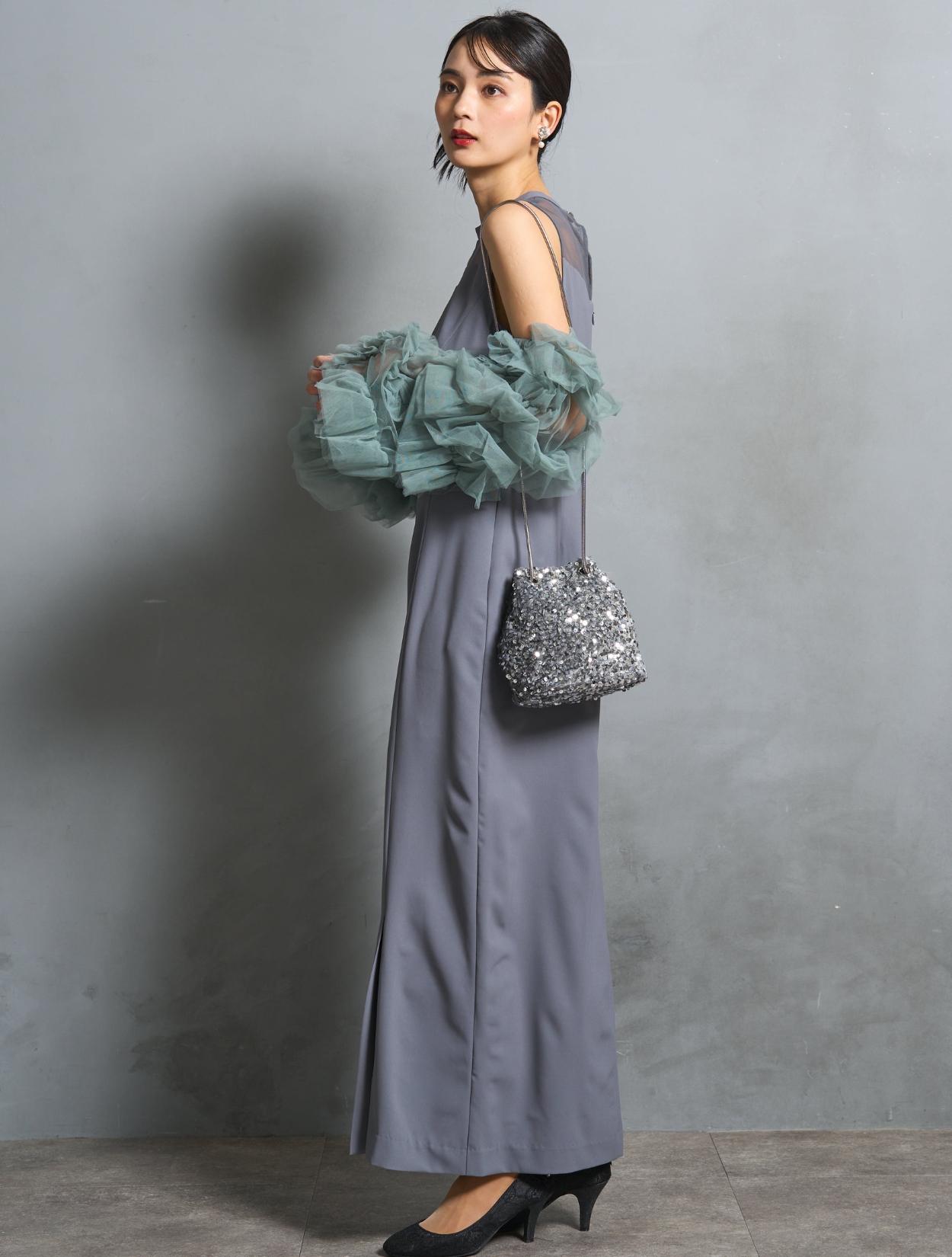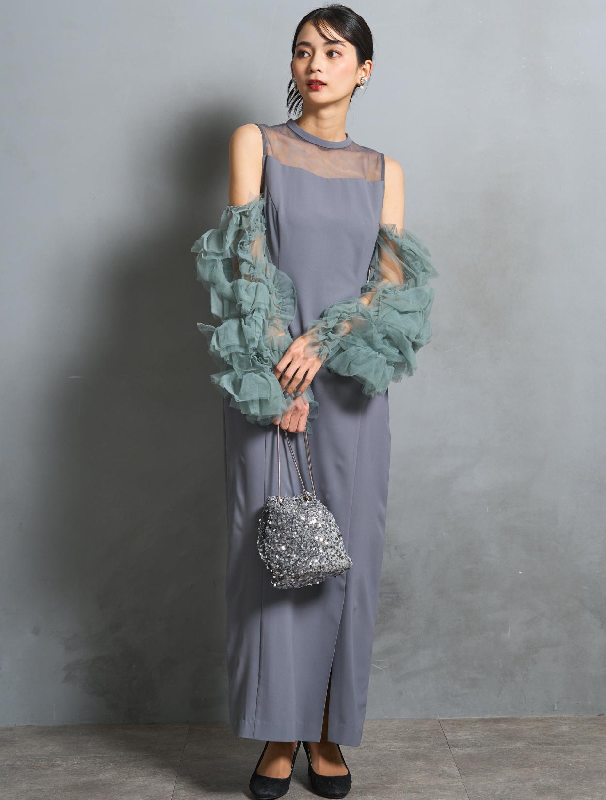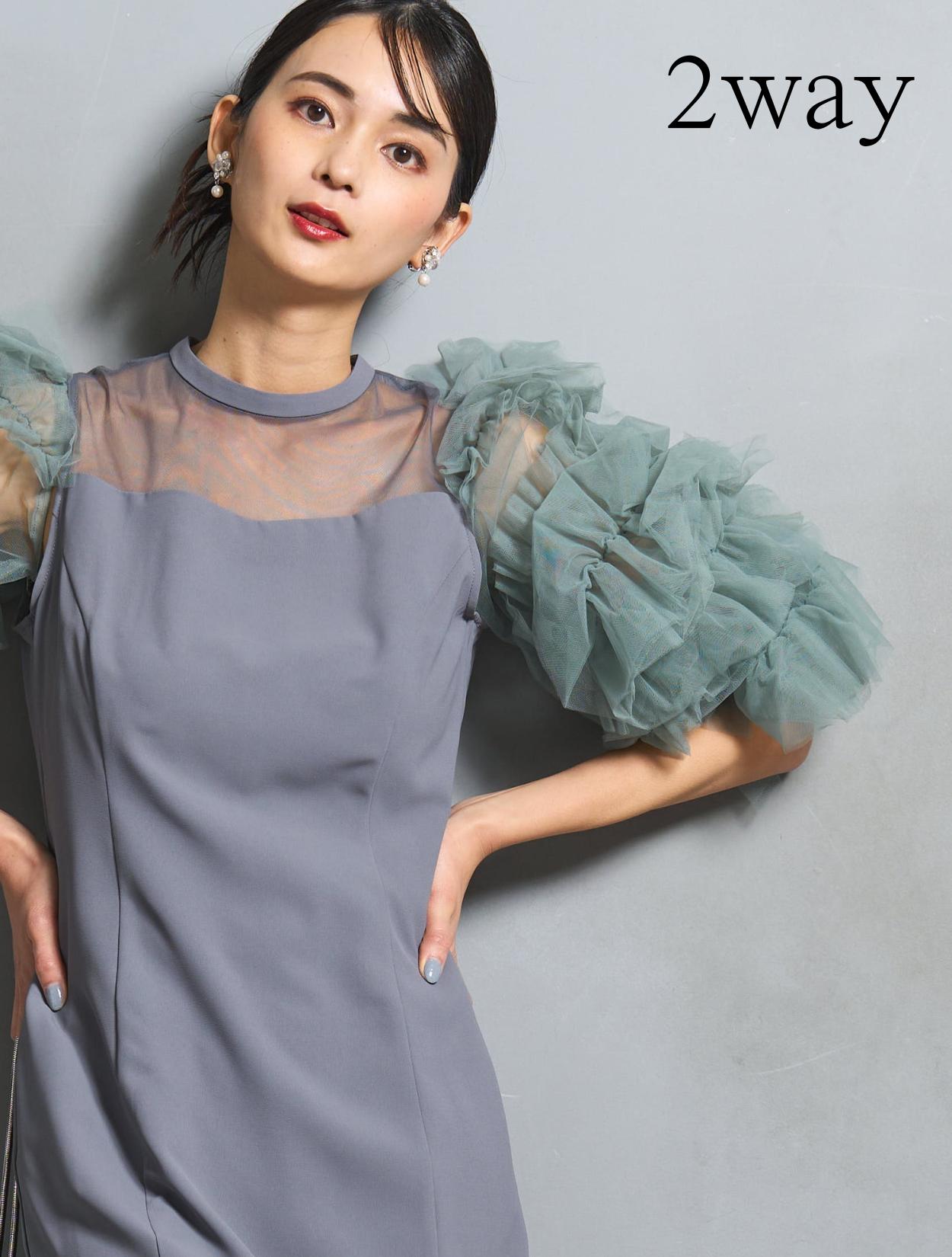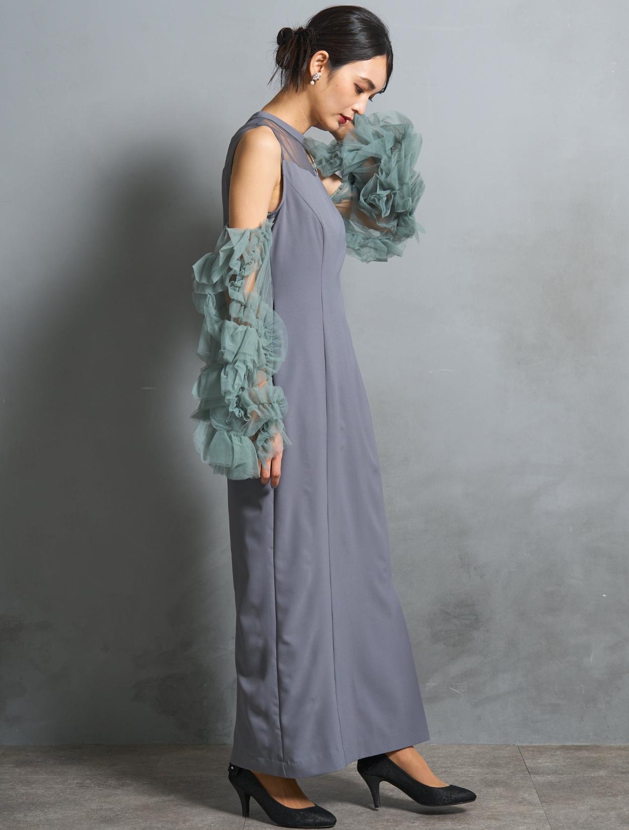 ワンピースは、モーヴブルーを感じる上品なブルーグレーカラー。袖のチュールは、南国の海の様な透明感のあるアクアグリーン。大人っぽさと個性が同居する絶妙なカラーバランスです。遊び心ある大人女子に人気。