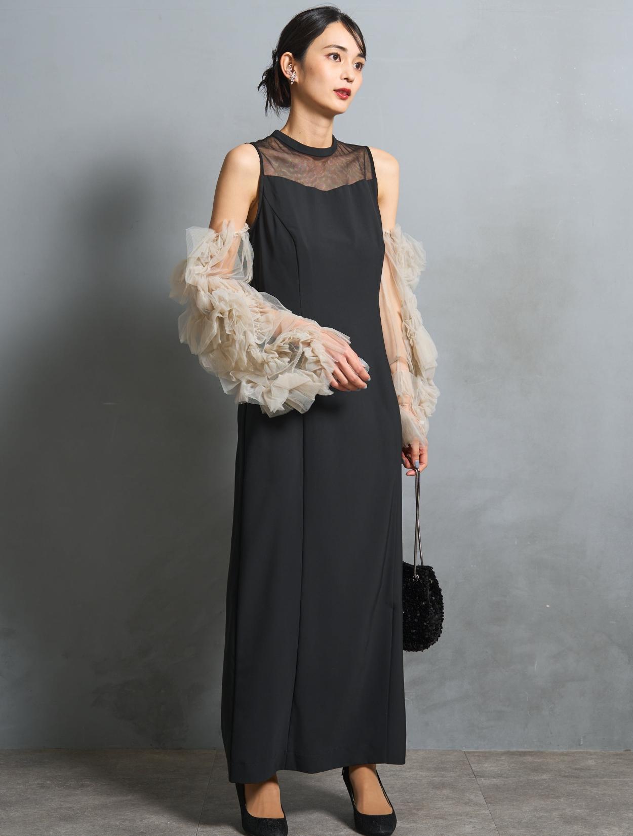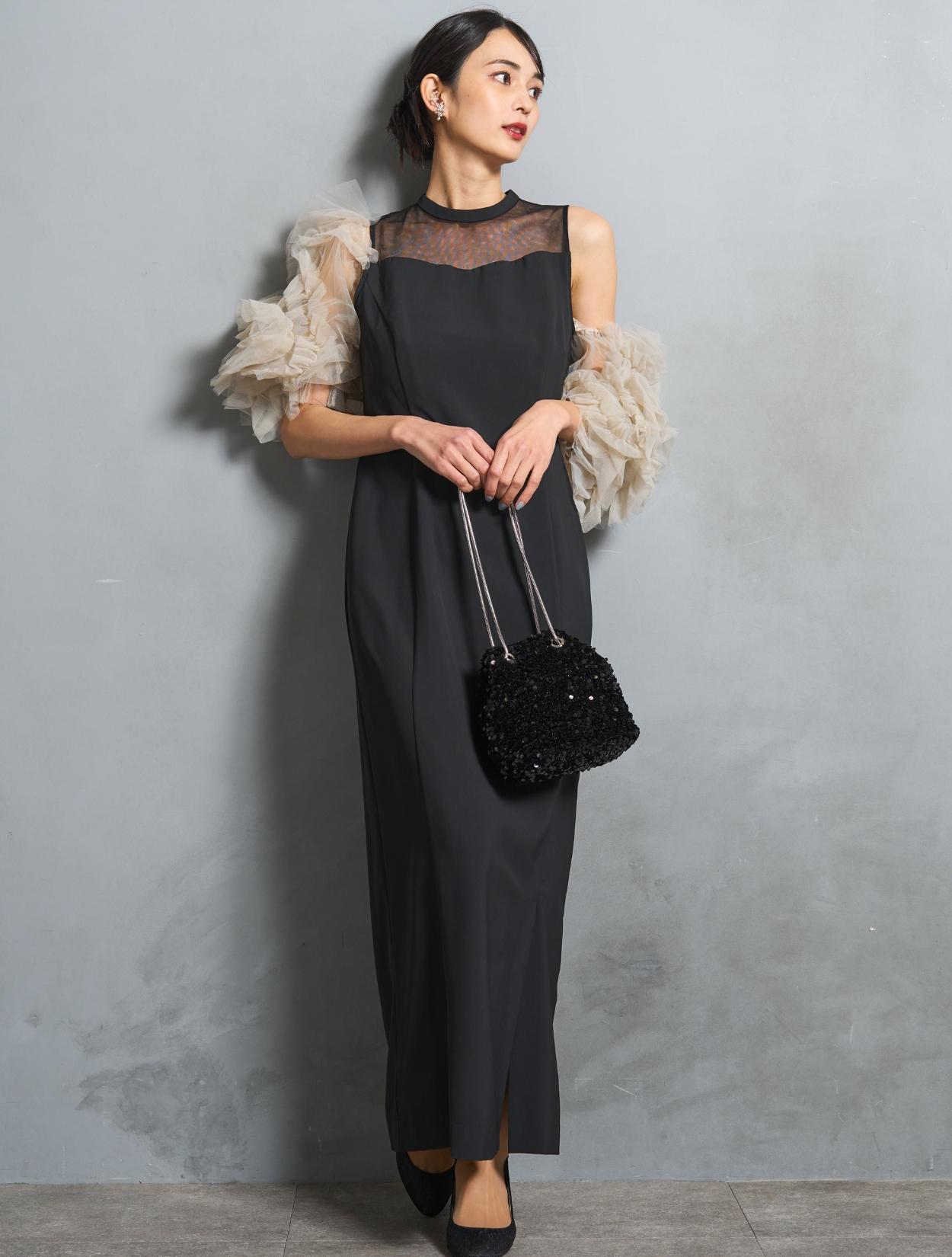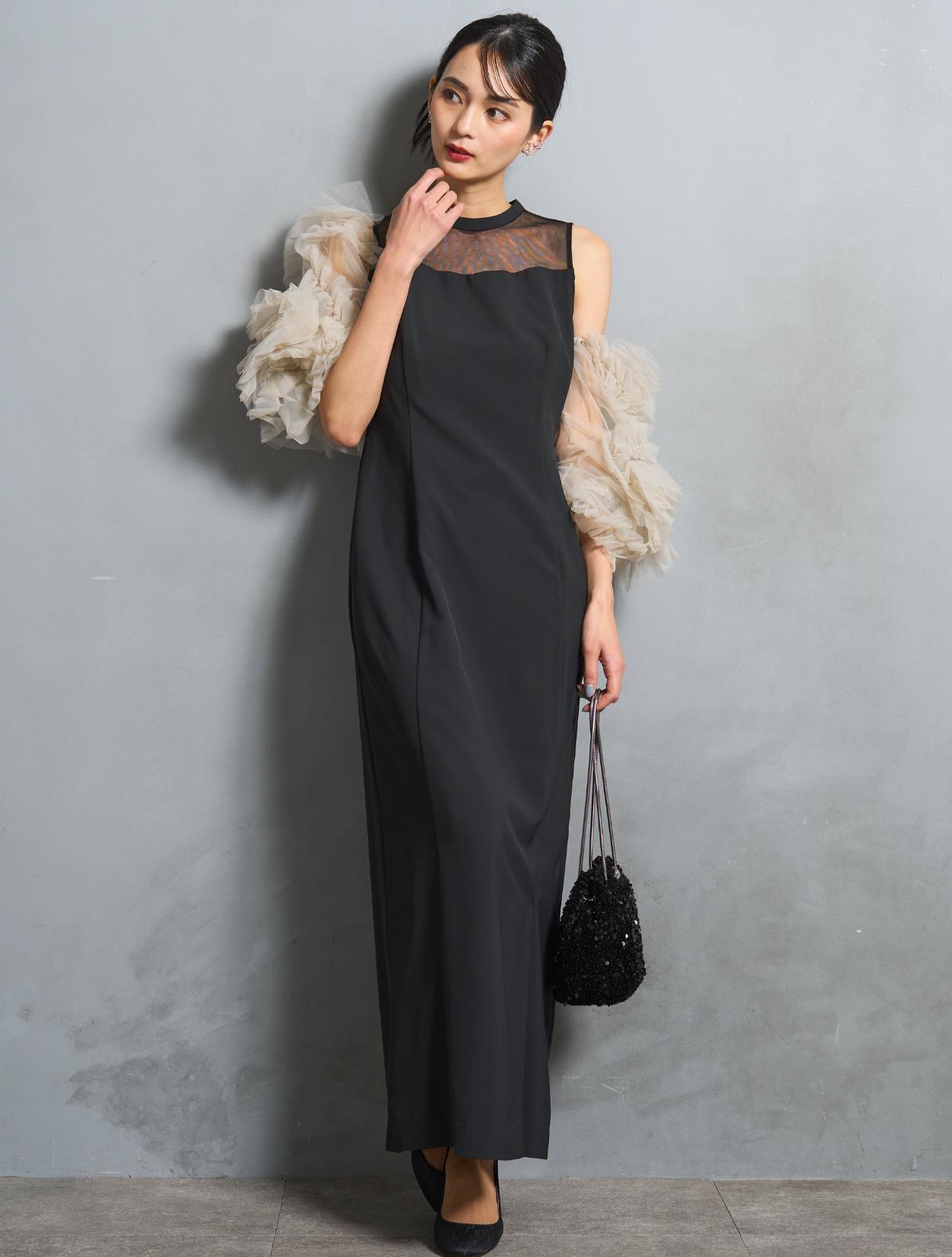 ワンピースは、シックながら艶感のあるブラック。袖のチュールは、黄色味が控えめなミルキーベージュ。シャープなブラックドレスを、ミルクで中和させたようなまろやかなカラーバランスが人気です。