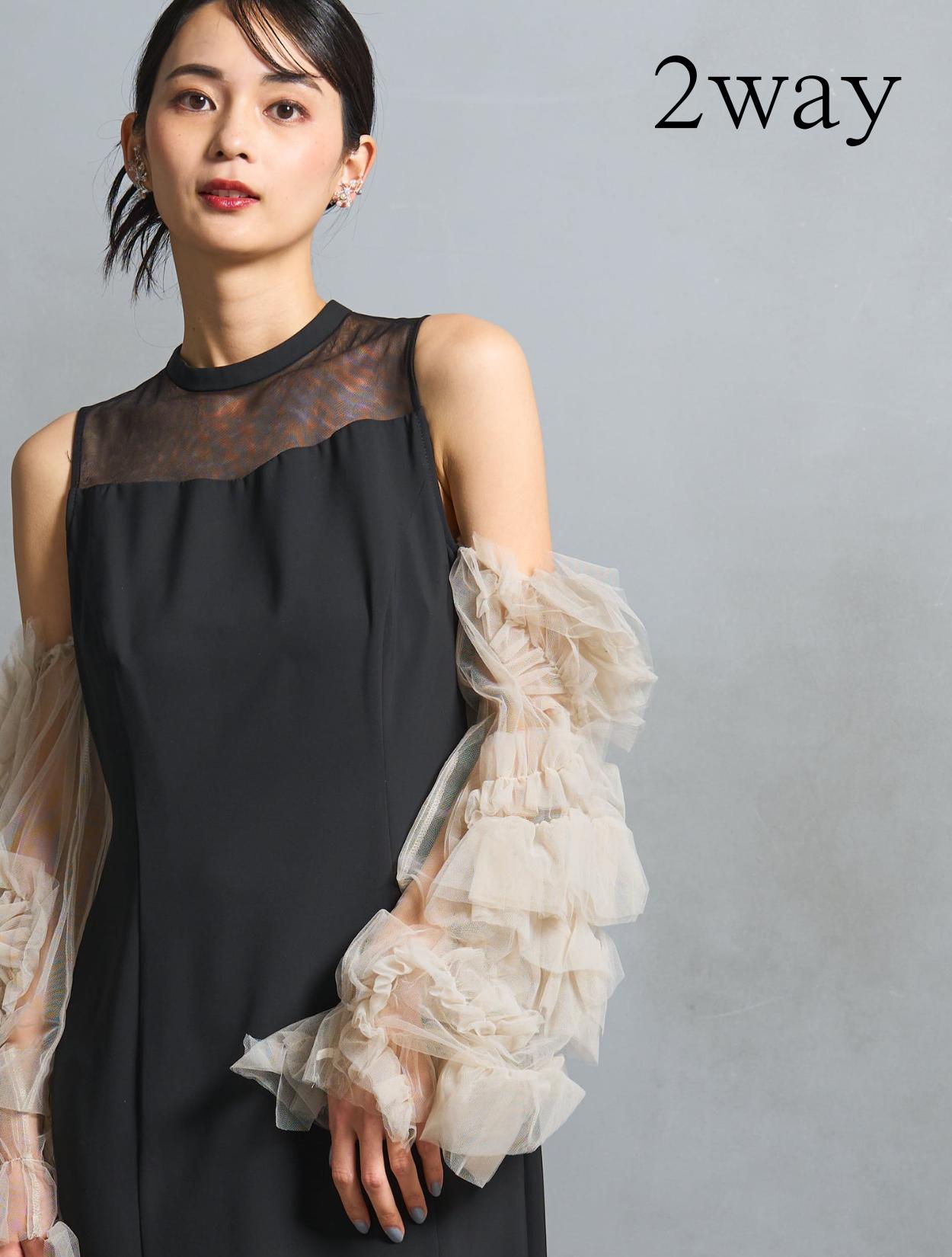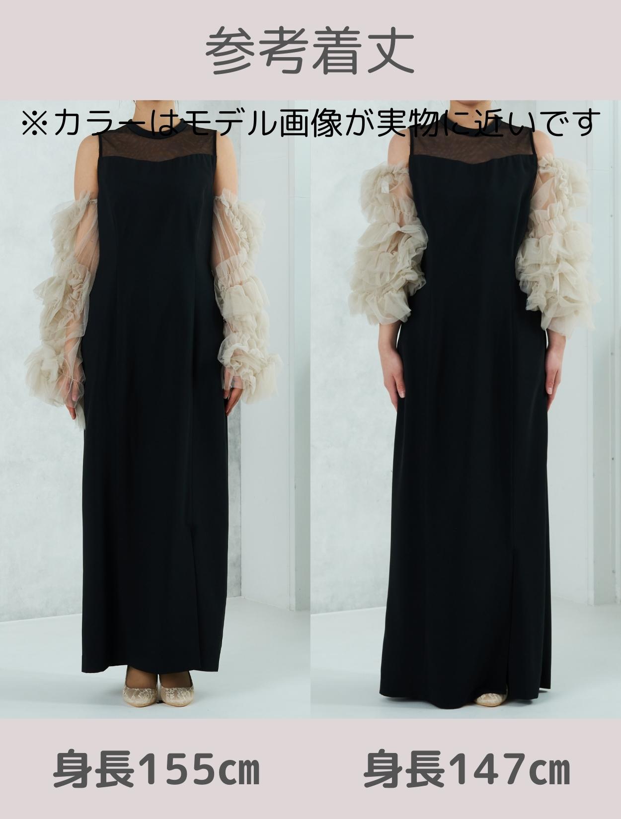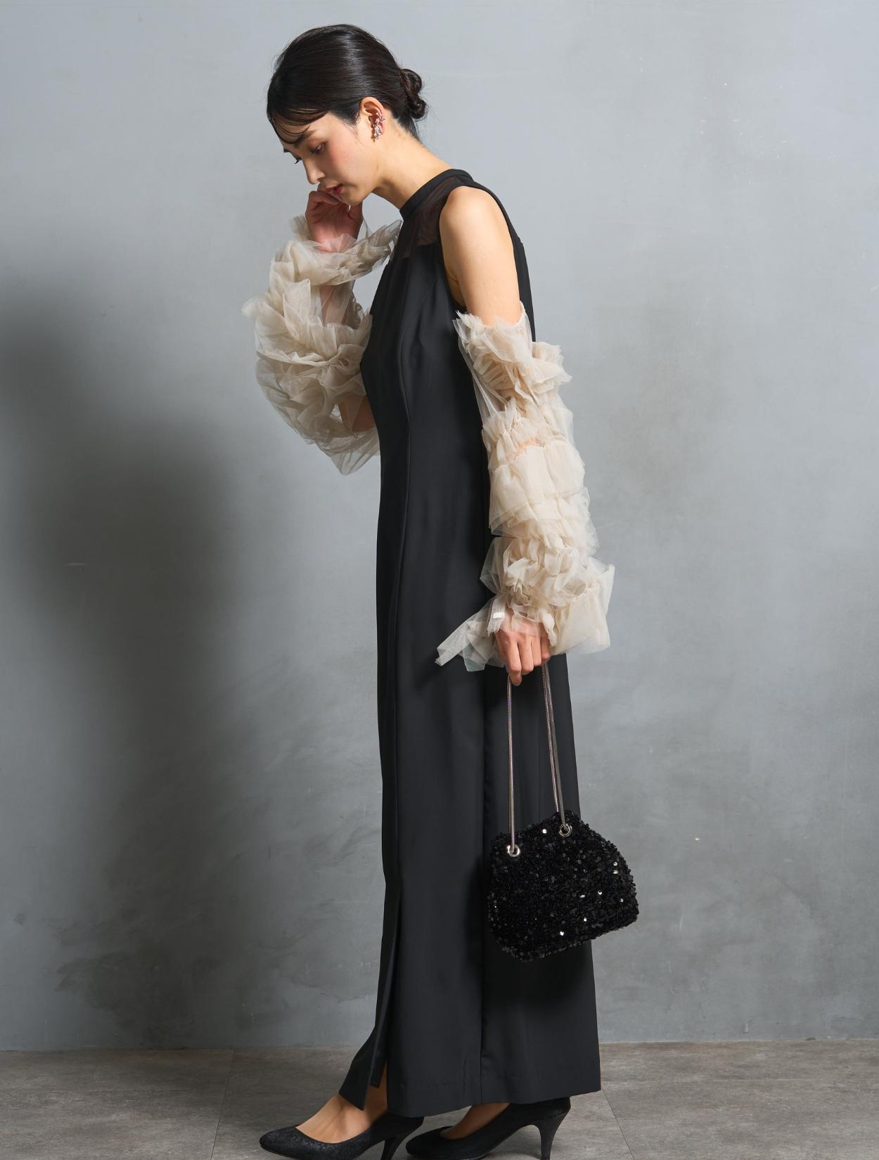 ワンピースは、シックながら艶感のあるブラック。袖のチュールは、黄色味が控えめなミルキーベージュ。シャープなブラックドレスを、ミルクで中和させたようなまろやかなカラーバランスが人気です。