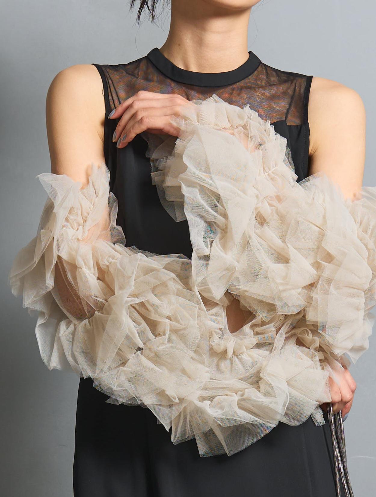 大胆なボリュームチュール袖が個性的な、トレンド感たっぷりのおすすめドレス。ランダムなチュールフリルがウェーブ状に配置されていて、インパクトのあるボリューム感がポイントです。印象に残りやすいデザインのお呼ばれドレスは、レンタルならではでもあります♪チュールは柔らかいので、肌触りも痛くありません。チュールの袖は様々な使い方が可能。結婚式の挙式では肩を覆うスタイルで、披露宴では肩見せスタイル、二次会ではアームカバーの様に使ってみることも◎。1日の中でも複数の着こなしが楽しめます。また、袖口にはゴムが入っているので、お食事中も邪魔になりません。