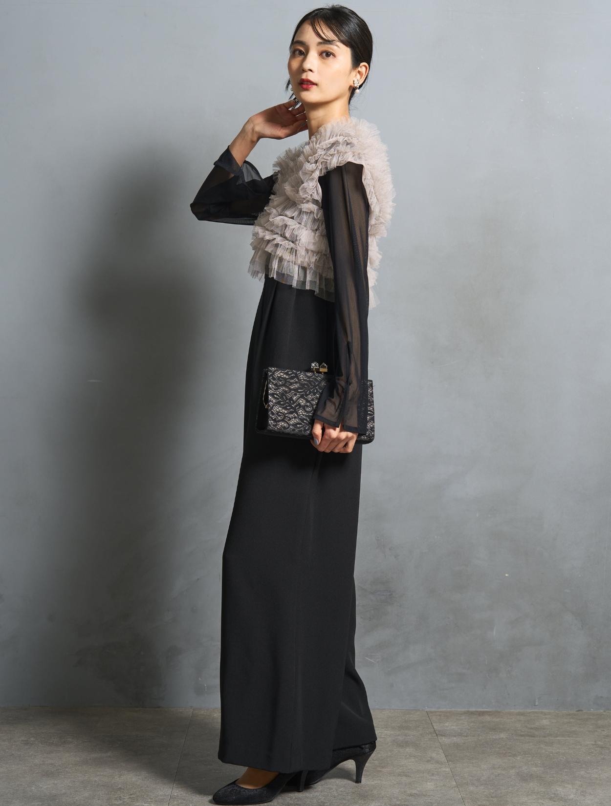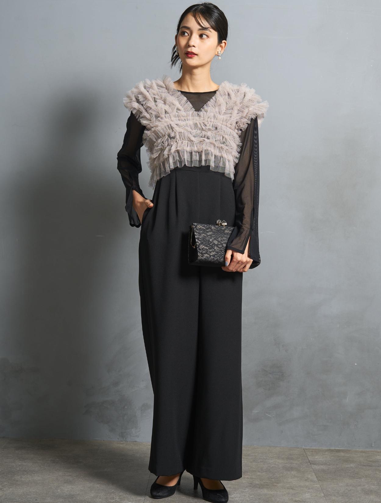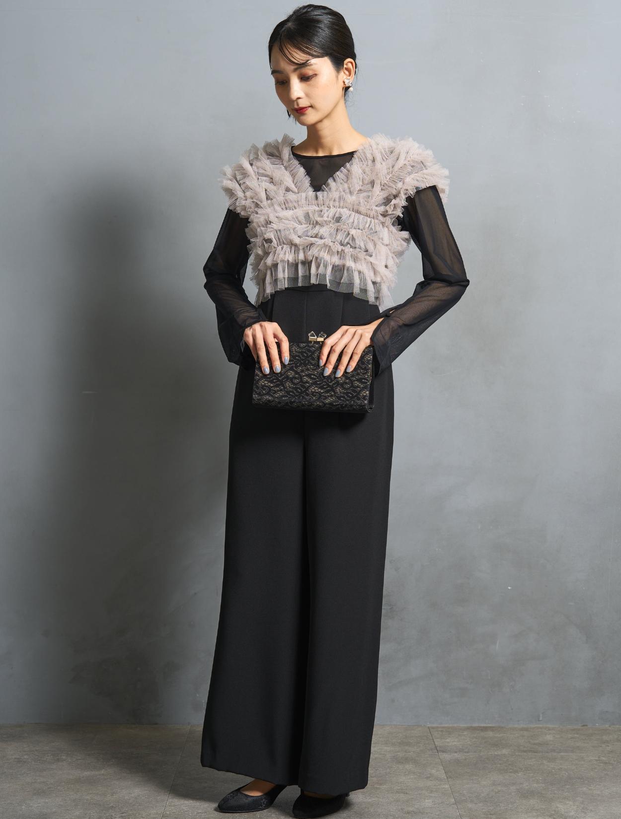 肌見せが苦手な方や腕の露出をしたくない方向けに、ブラウスを合わせて露出を抑えたコーディネート。長袖のブラウスですが、シンプルで透け感があるので、ドレスのデザインを邪魔せずに安心して着られます。オールインワンと同色のブラックバッグを合わせてシックで大人っぽい印象に。レースのバッグは、トレンド感のあるパンツスタイルをクラシカルな雰囲気にしてくれるので、結婚式お呼ばれのパンツスタイルにおすすめのアイテムです。