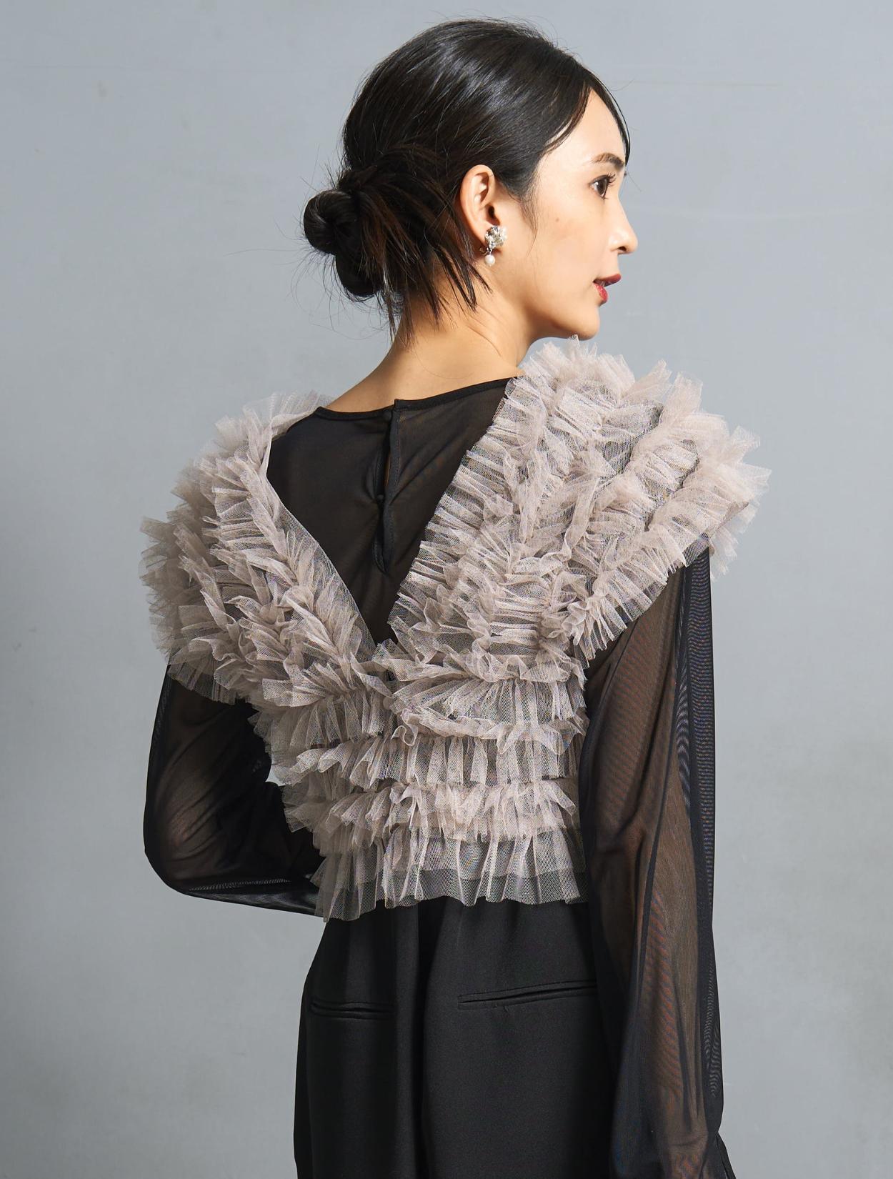 透け感が若干あるので、ストラップレスの下着の着用をおすすめします。チュールトップスの肩部分は立体感があり、中のストラップはあまり目立ちません。オフショルにしないのであれば、目立ちにくいスキンカラーの下着ならストラップ付きでも着用可能です。