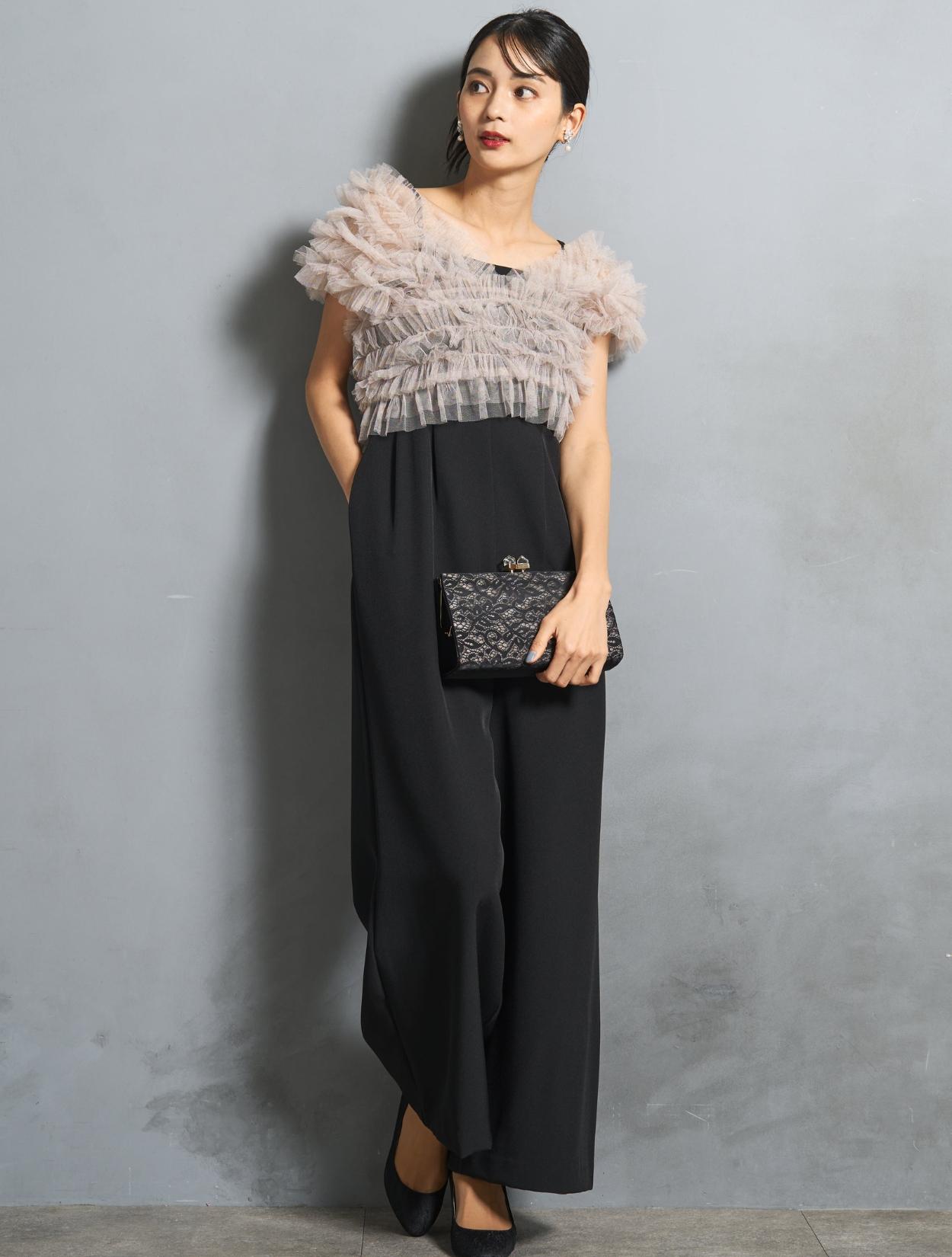 パンツは、キャミソールのオールインワンタイプ。背中部分はゴムになっていて着心地も◎。肩紐で着丈の調節が可能です。オールインワンの高い位置に切り替えが入っていて、スタイルアップ効果あり。切り替えからさりげなく入ったタックは、腰回りをカバーしつつ、たっぷりしたラインが高級感を演出。カジュアルに見えない、結婚式やパーティーにぴったりなパンツスタイルです。