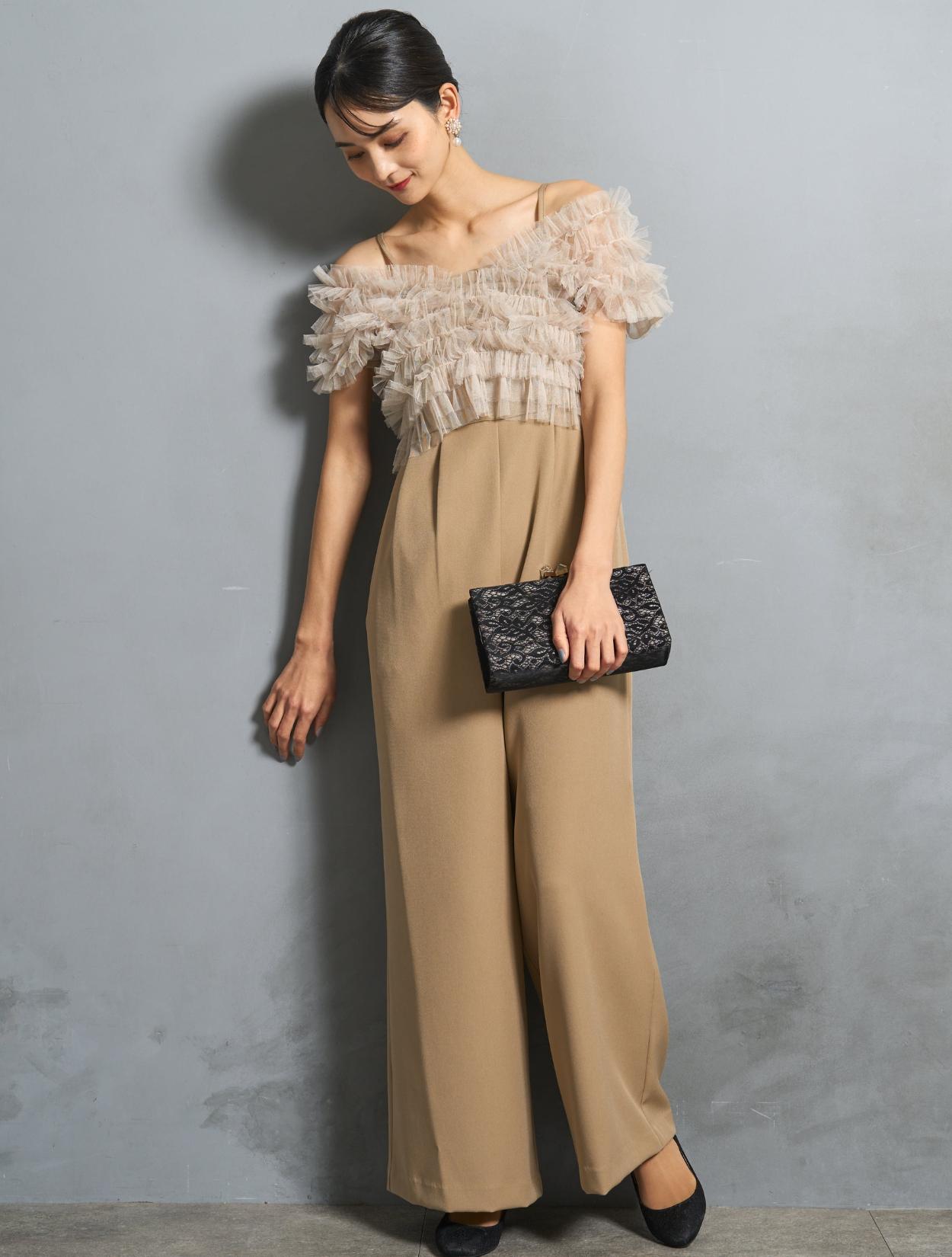 ビスケットの様な暖かみのあるベージュカラーのオールインワンに、くすみのあるグレージュのチュールトップス。ベージュ系でも黄色味を抑えた色合いなので、ブルベ肌にも似合いやすい色味です。