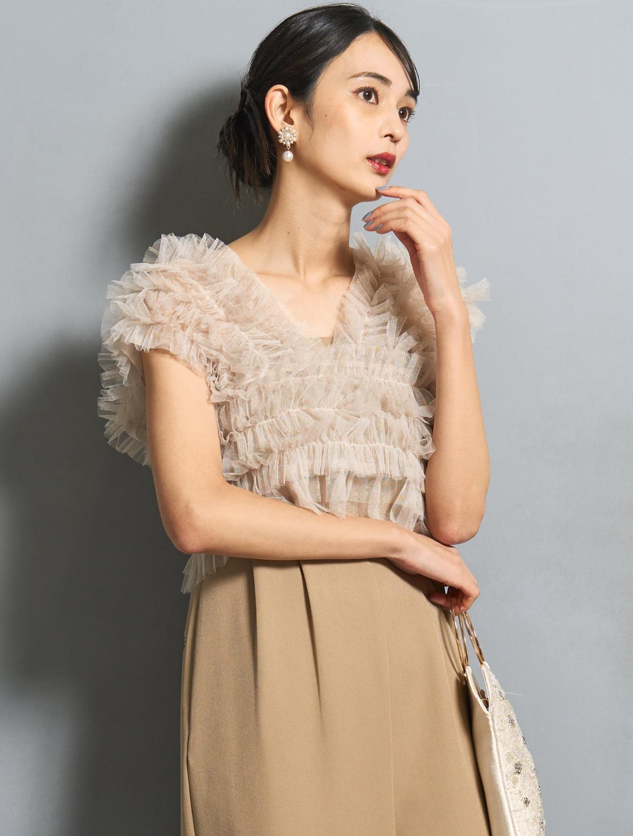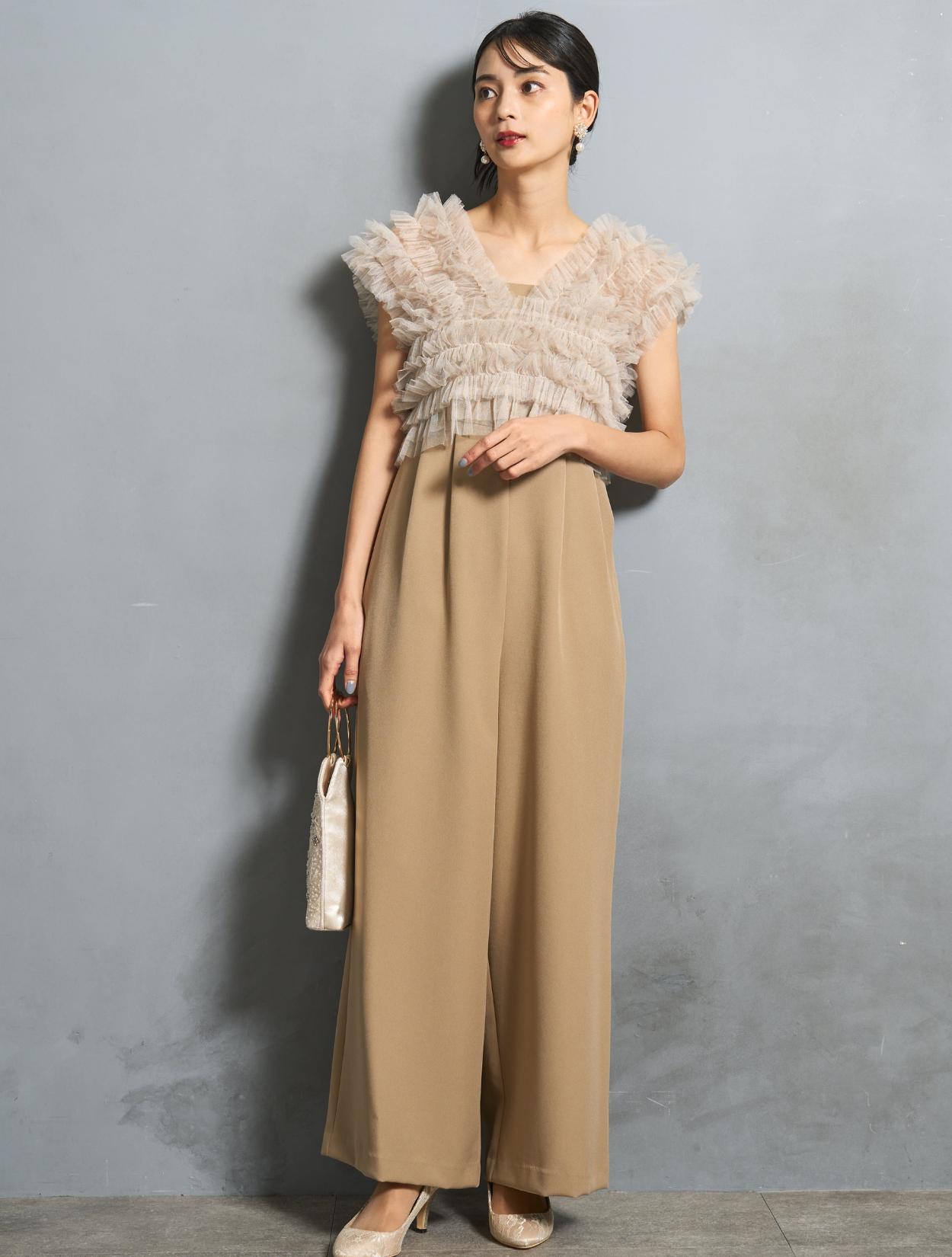 ビスケットの様な暖かみのあるベージュカラーのオールインワンに、くすみのあるグレージュのチュールトップス。ベージュ系でも黄色味を抑えた色合いなので、ブルベ肌にも似合いやすい色味です。