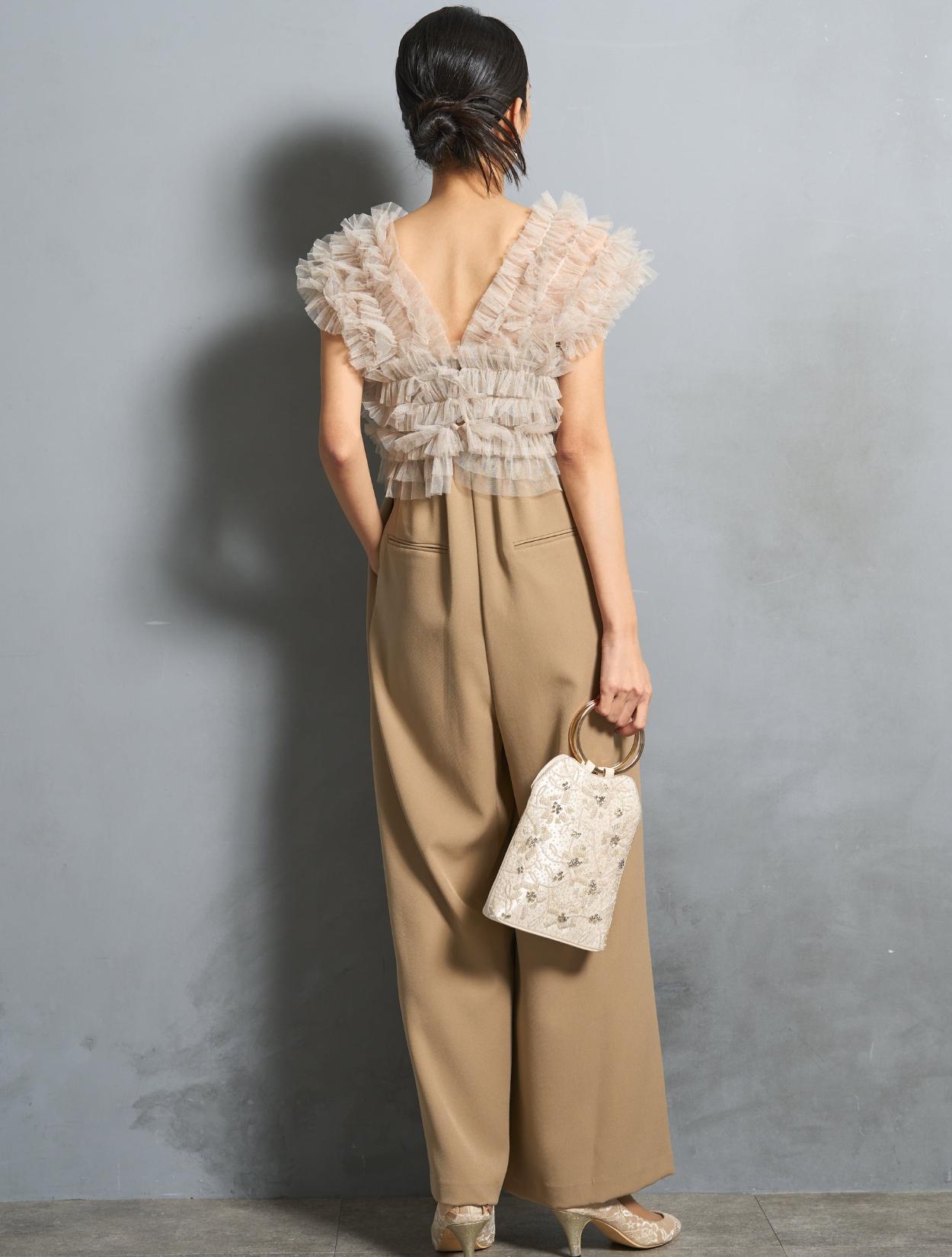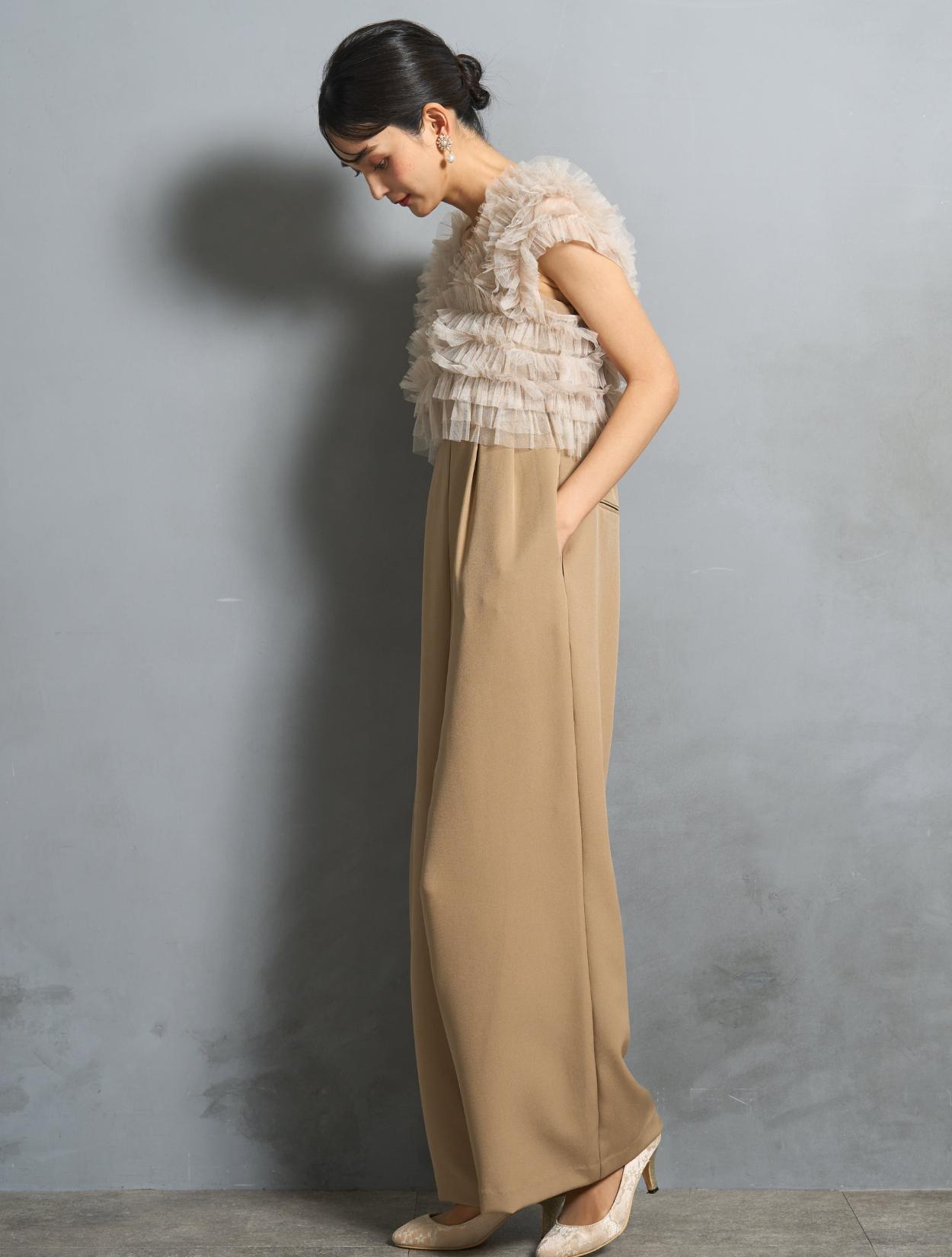 パンツは、キャミソールのオールインワンタイプ。背中部分はゴムになっていて着心地も◎。肩紐で着丈の調節が可能です。オールインワンの高い位置に切り替えが入っていて、スタイルアップ効果あり。切り替えからさりげなく入ったタックは、腰回りをカバーしつつ、たっぷりしたラインが高級感を演出。カジュアルに見えない、結婚式やパーティーにぴったりなパンツスタイルです。