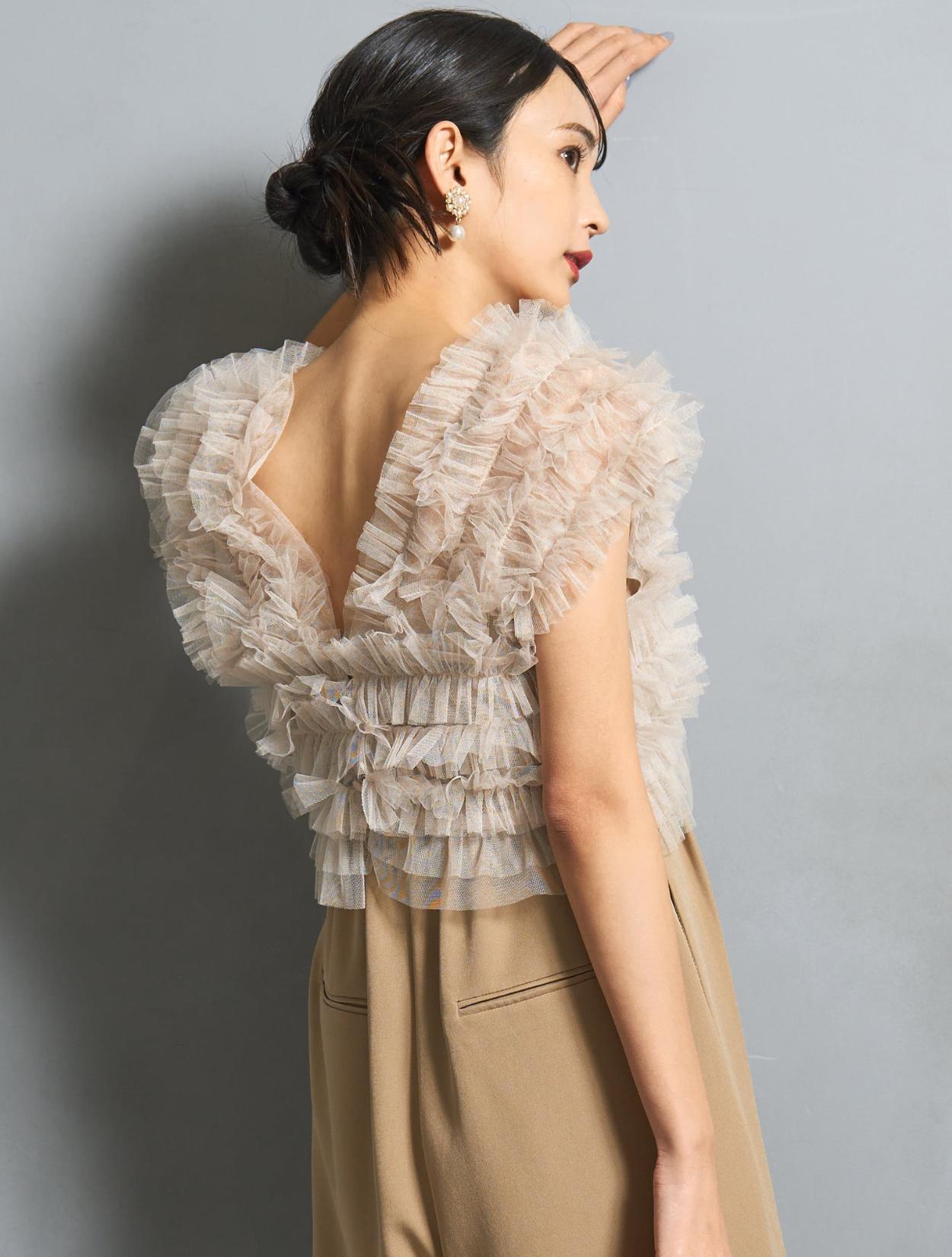 透け感が若干あるので、ストラップレスの下着の着用をおすすめします。チュールトップスの肩部分は立体感があり、中のストラップはあまり目立ちません。オフショルにしないのであれば、目立ちにくいスキンカラーの下着ならストラップ付きでも着用可能です。