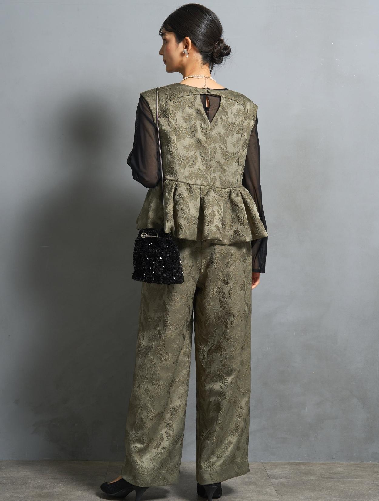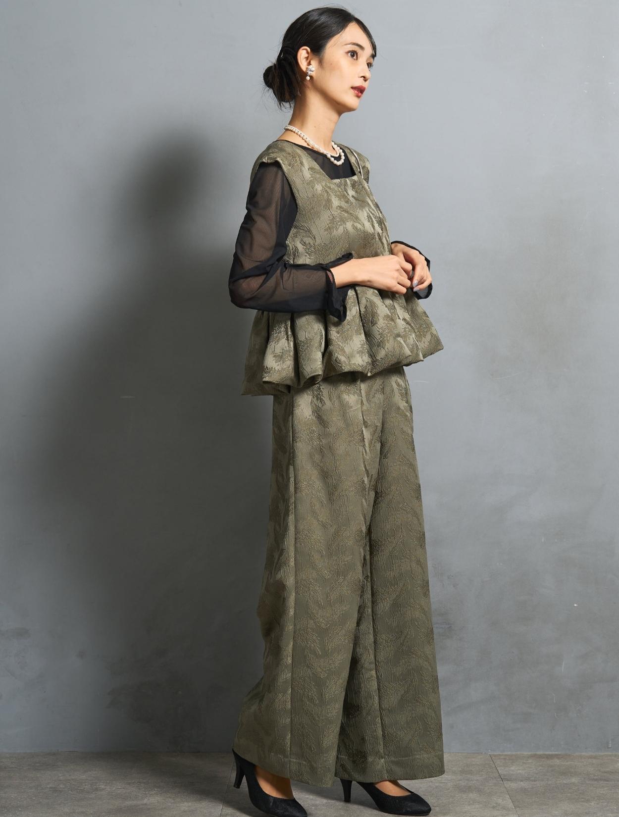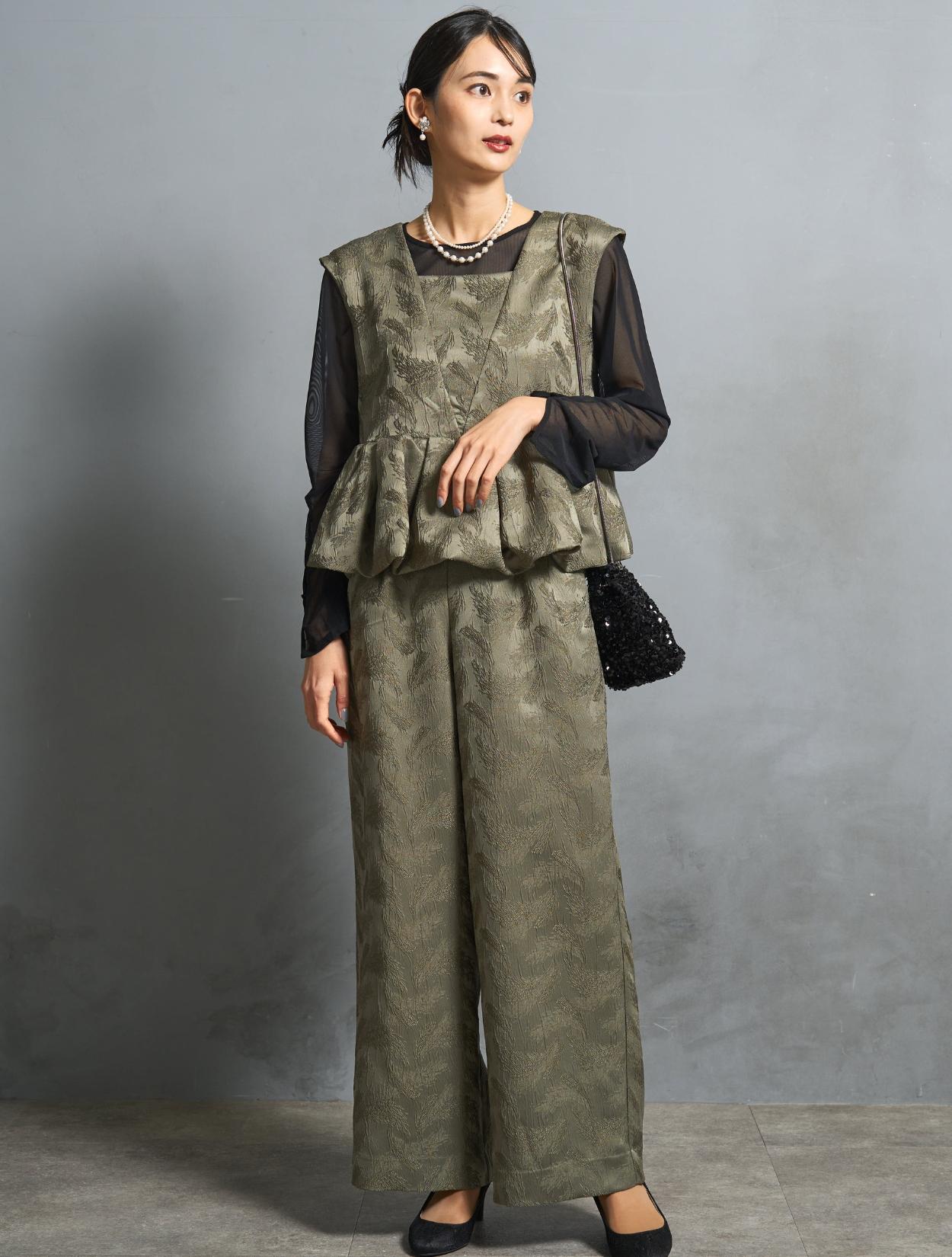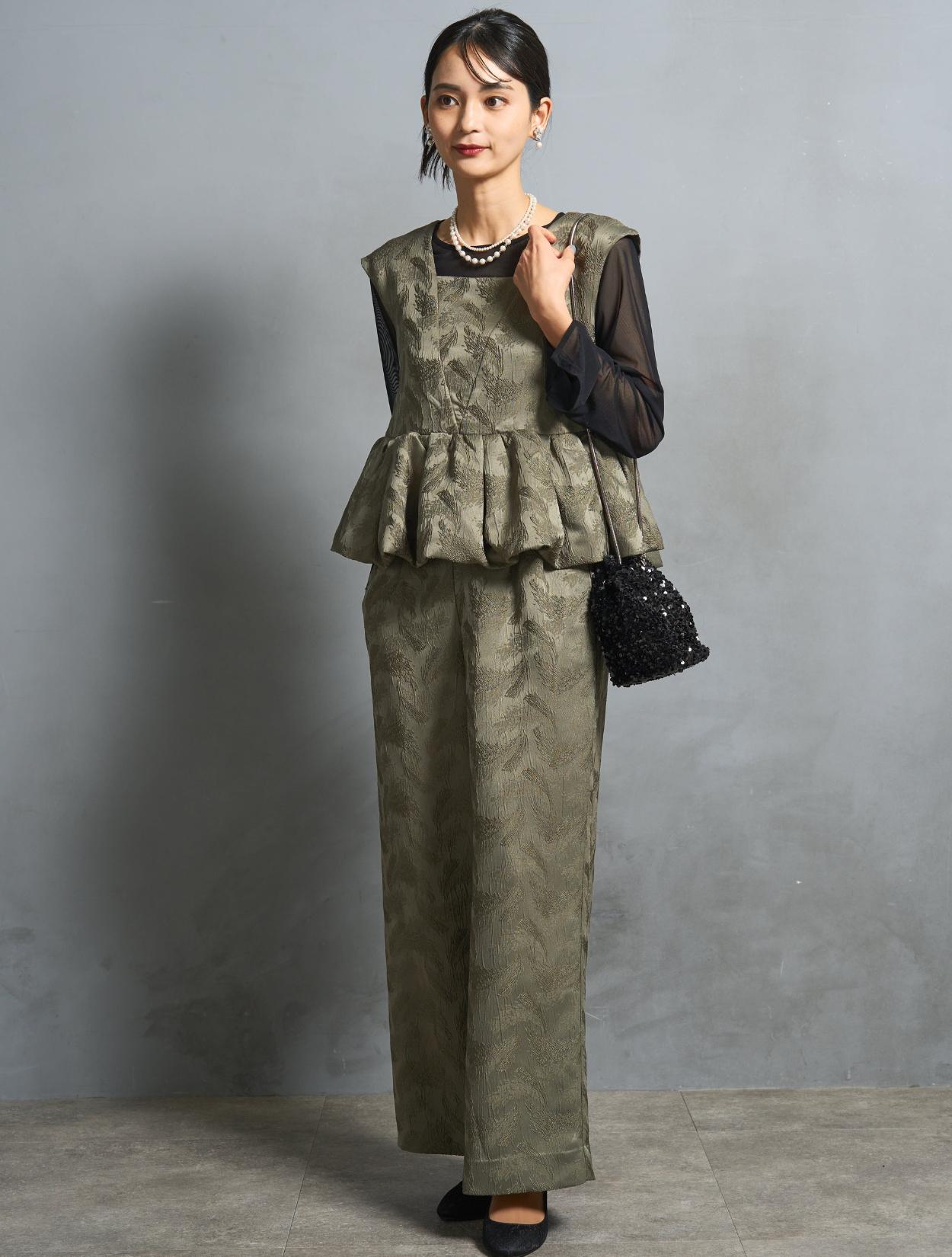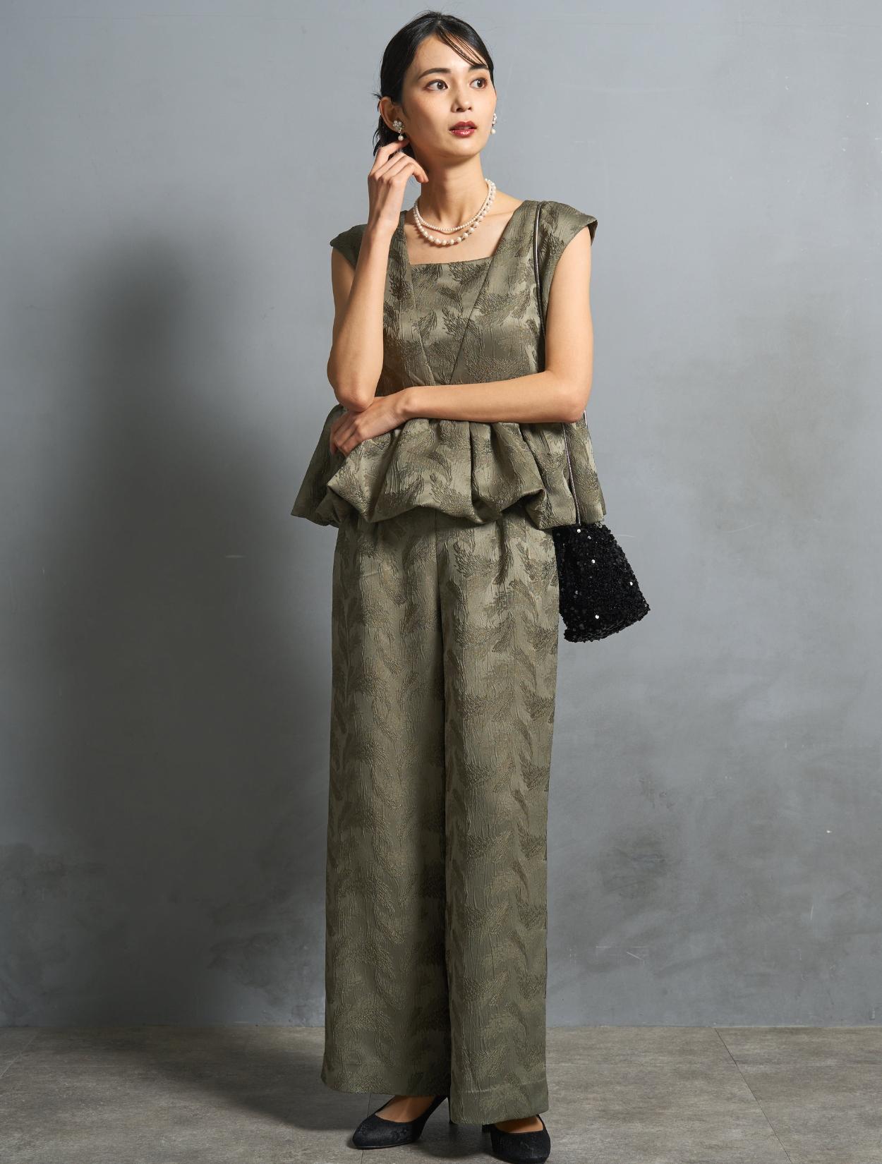 程よくボリュームのあるペルラムが大人かわいいパンツスタイルドレス。この絶妙なボリュームのペプラムデザインが、スタイルアップして見えるポイントでもあります。トップスのペプラムの切り替え位置は、ウエストを高く見せて脚長効果あり。微光沢のジャガード生地は、高級感もあり結婚式やパーティーのフォーマルシーンにもぴったりです。照明などの光の当たり方によって、フェザーの柄が映えておしゃれ。トレンドのパンツドレスですが、周りと被りにくく一目置かれる着こなしができます。気になるお袖ですが、フレンチスリーブで肩が隠れるデザイン。結婚式でも羽織りなしで着られます。露出が気になる方には、インナーブラウス(型番LDP000205)や、ショール(型番SDP0050)を合わせると◎。程よく開いたネックラインは、ネックレスが映えるデザイン。また、ネックからVに入ったラインは、首周りや上半身をスッキリ見せてくれます。短い首がお悩みの方でもきれいに着こなしやすいのも嬉しいですね♪パンツは便利なポケット付き。ただ、シルエットが崩れてしまうので、物を入れ過ぎるのは要注意です。