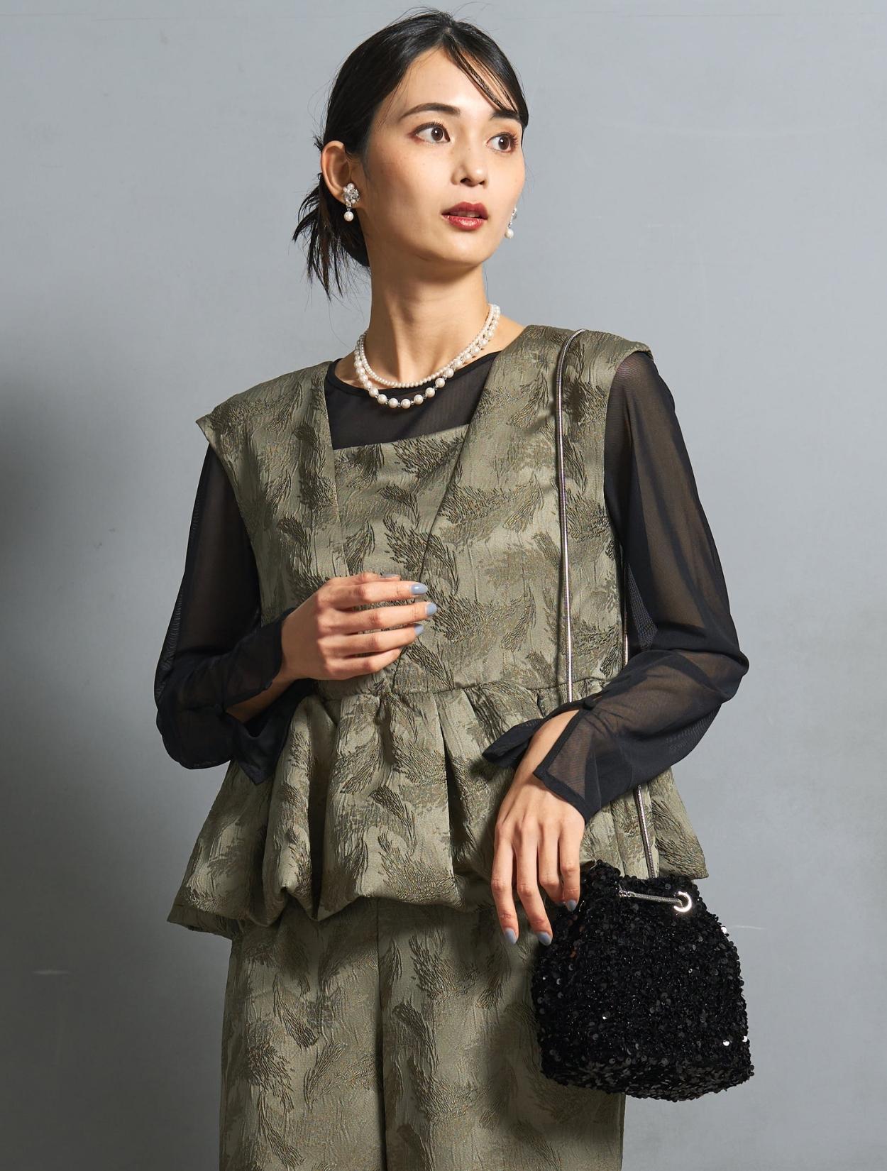 肌見せが苦手な方や腕の露出をしたくない方向けに、ブラウスを合わせて露出を抑えたコーディネート。長袖のブラウスですが、シンプルで透け感があるので、ドレスのデザインを邪魔せずに安心して着られます。20代30代はもちろん、40代50代のお呼ばれドレスとしてもおすすめです。遊び心のあるカーキのパンツドレスに、フォーマル感が控えめなスパンコールバッグを合わせて今っぽい着こなしに。2連のパールネックレスは、結婚式や様々なフォーマルシーンで間違いない着こなしができるおすすめのアイテム。カジュアルに見え過ぎないようにバランスを整えてくれます。結婚式はもちろん、特別な日のお食事や女子会にもおすすめです。