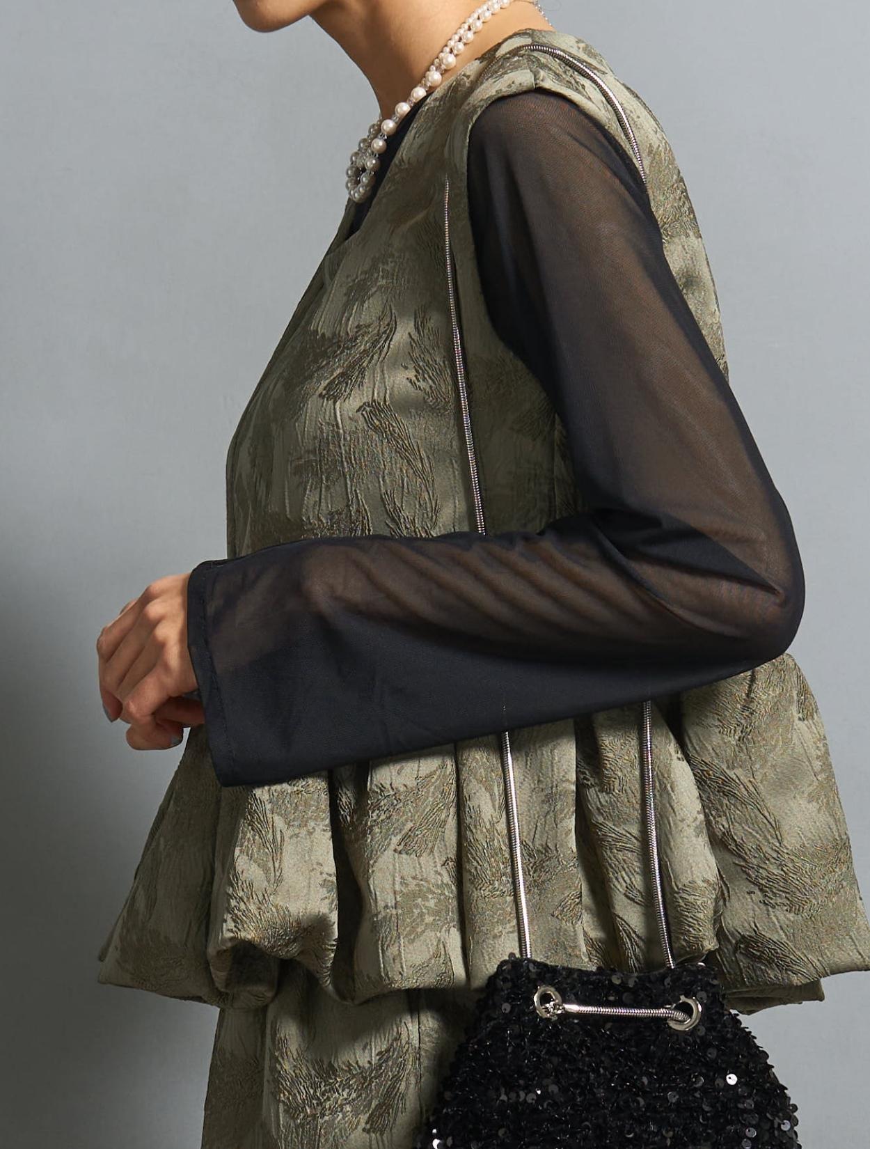 透け感のないしっかりしたジャガード生地ですが、フレンチスリーブのデザインからも「春夏秋冬」と年中ご着用いただけます。秋冬は、長袖のインナーブラスを中に着ると季節感が出まて◎。