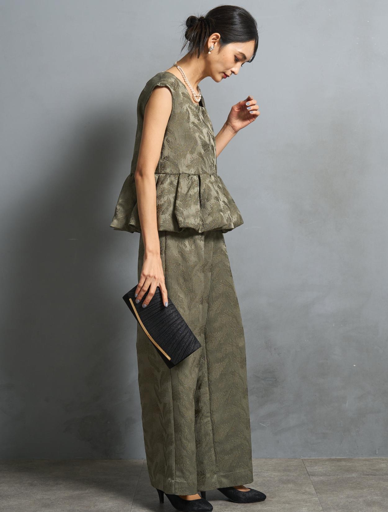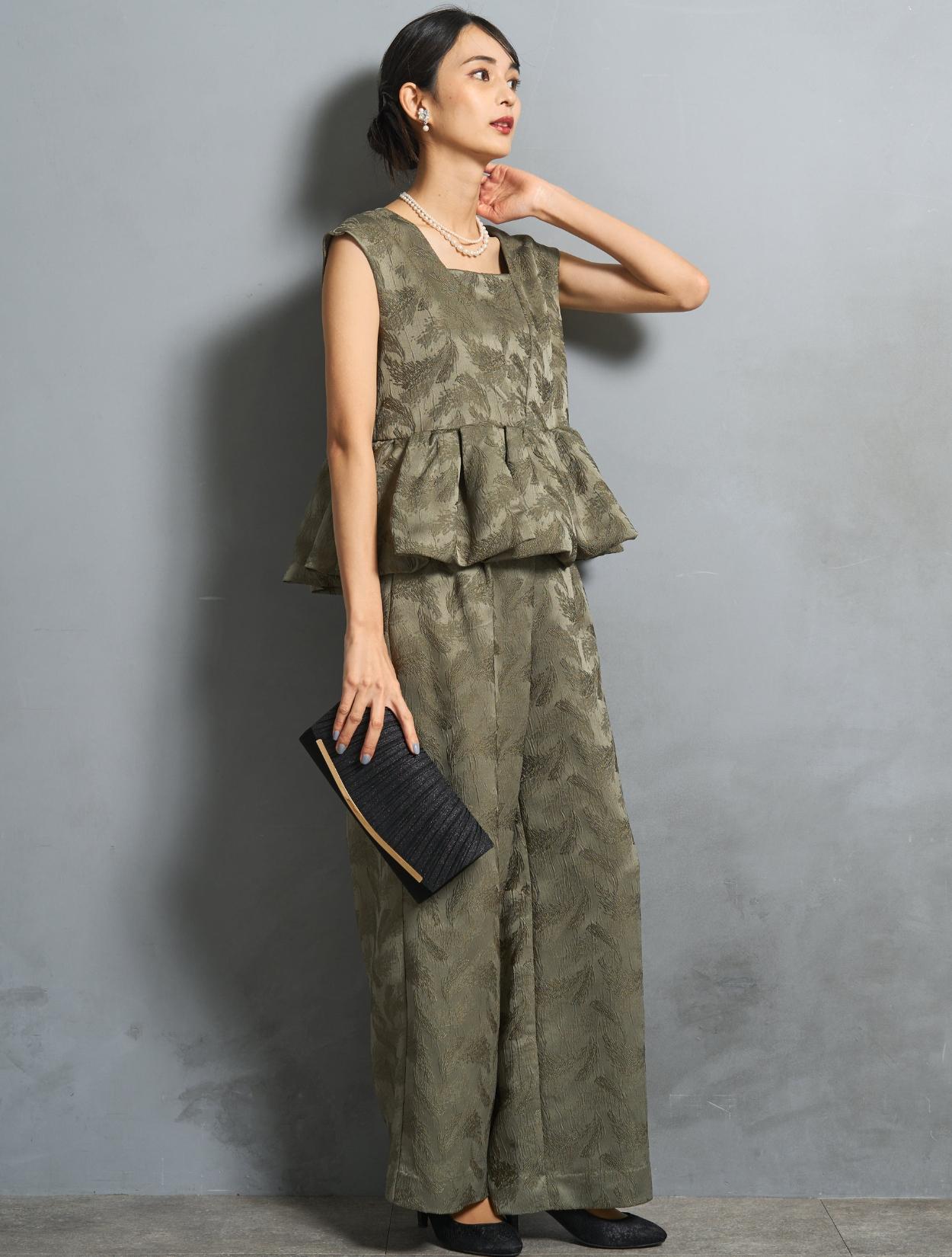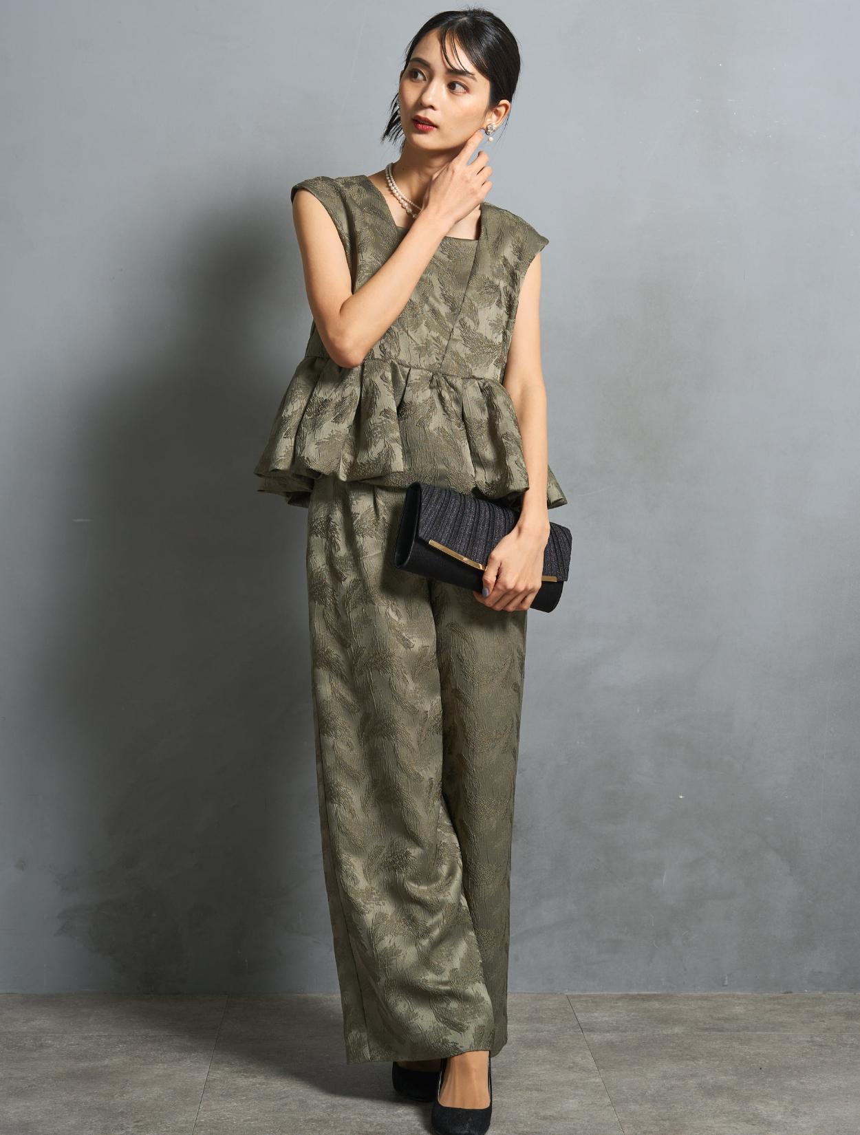 程よくボリュームのあるペルラムが大人かわいいパンツスタイルドレス。この絶妙なボリュームのペプラムデザインが、スタイルアップして見えるポイントでもあります。トップスのペプラムの切り替え位置は、ウエストを高く見せて脚長効果あり。微光沢のジャガード生地は、高級感もあり結婚式やパーティーのフォーマルシーンにもぴったりです。照明などの光の当たり方によって、フェザーの柄が映えておしゃれ。トレンドのパンツドレスですが、周りと被りにくく一目置かれる着こなしができます。気になるお袖ですが、フレンチスリーブで肩が隠れるデザイン。結婚式でも羽織りなしで着られます。露出が気になる方には、インナーブラウス(型番LDP000205)や、ショール(型番SDP0050)を合わせると◎。程よく開いたネックラインは、ネックレスが映えるデザイン。また、ネックからVに入ったラインは、首周りや上半身をスッキリ見せてくれます。短い首がお悩みの方でもきれいに着こなしやすいのも嬉しいですね♪パンツは便利なポケット付き。ただ、シルエットが崩れてしまうので、物を入れ過ぎるのは要注意です。