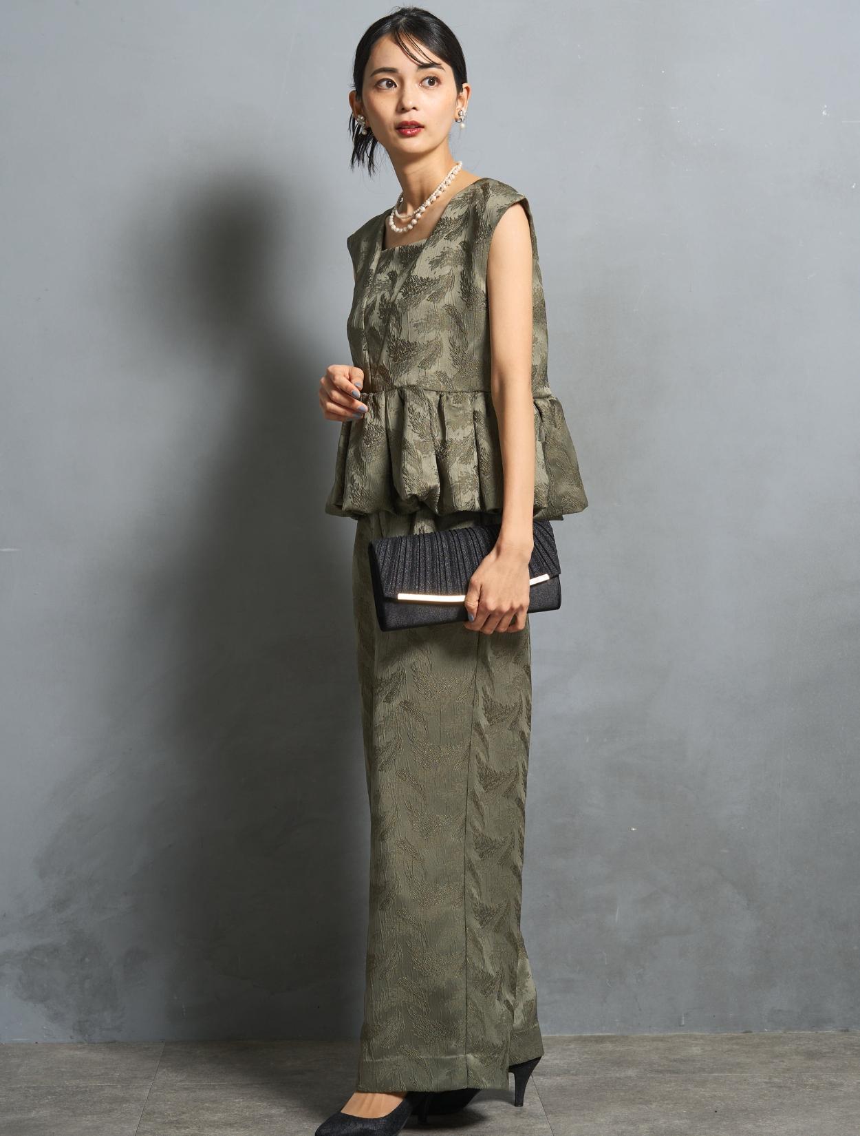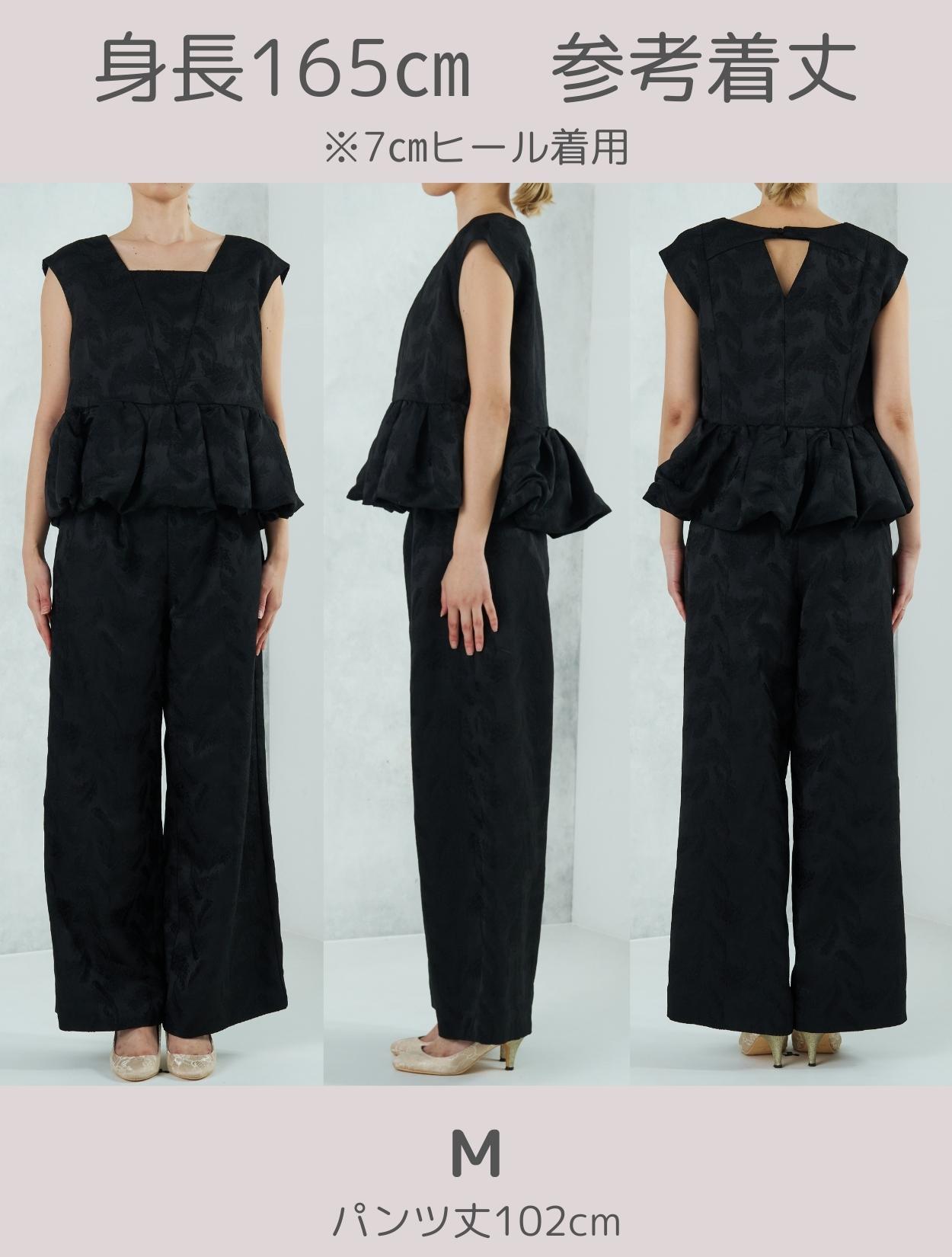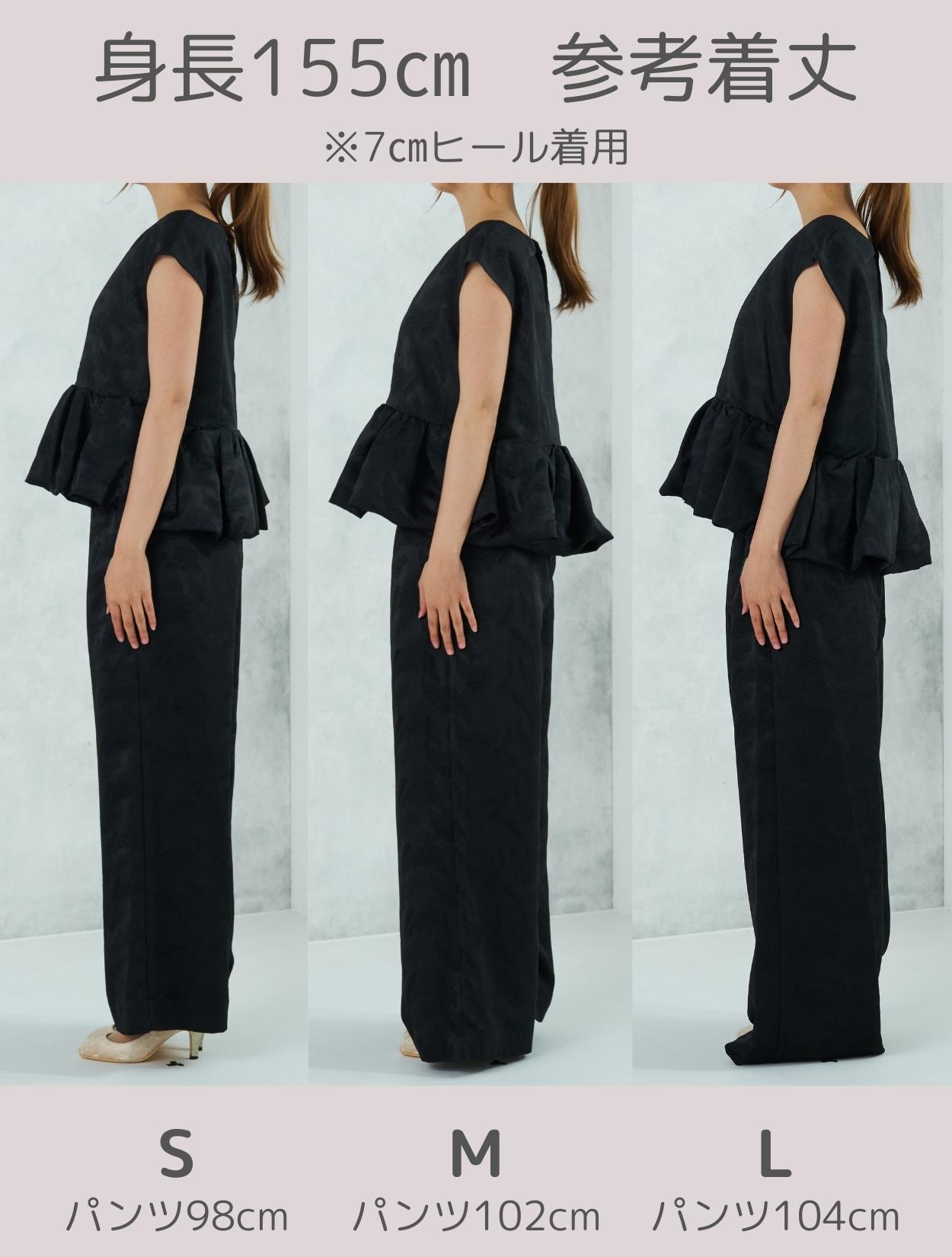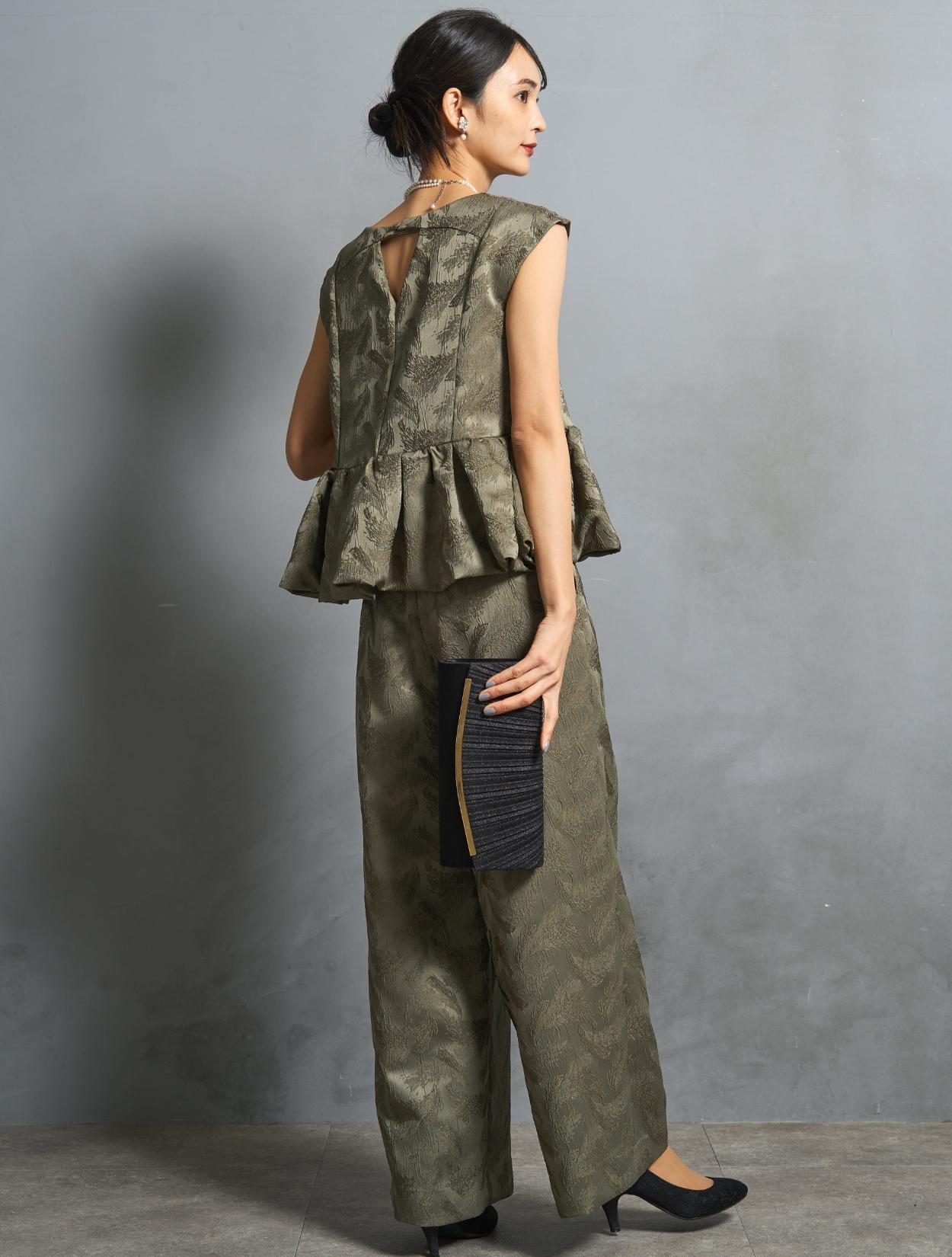 程よくボリュームのあるペルラムが大人かわいいパンツスタイルドレス。この絶妙なボリュームのペプラムデザインが、スタイルアップして見えるポイントでもあります。トップスのペプラムの切り替え位置は、ウエストを高く見せて脚長効果あり。微光沢のジャガード生地は、高級感もあり結婚式やパーティーのフォーマルシーンにもぴったりです。照明などの光の当たり方によって、フェザーの柄が映えておしゃれ。トレンドのパンツドレスですが、周りと被りにくく一目置かれる着こなしができます。気になるお袖ですが、フレンチスリーブで肩が隠れるデザイン。結婚式でも羽織りなしで着られます。露出が気になる方には、インナーブラウス(型番LDP000205)や、ショール(型番SDP0050)を合わせると◎。程よく開いたネックラインは、ネックレスが映えるデザイン。また、ネックからVに入ったラインは、首周りや上半身をスッキリ見せてくれます。短い首がお悩みの方でもきれいに着こなしやすいのも嬉しいですね♪パンツは便利なポケット付き。ただ、シルエットが崩れてしまうので、物を入れ過ぎるのは要注意です。