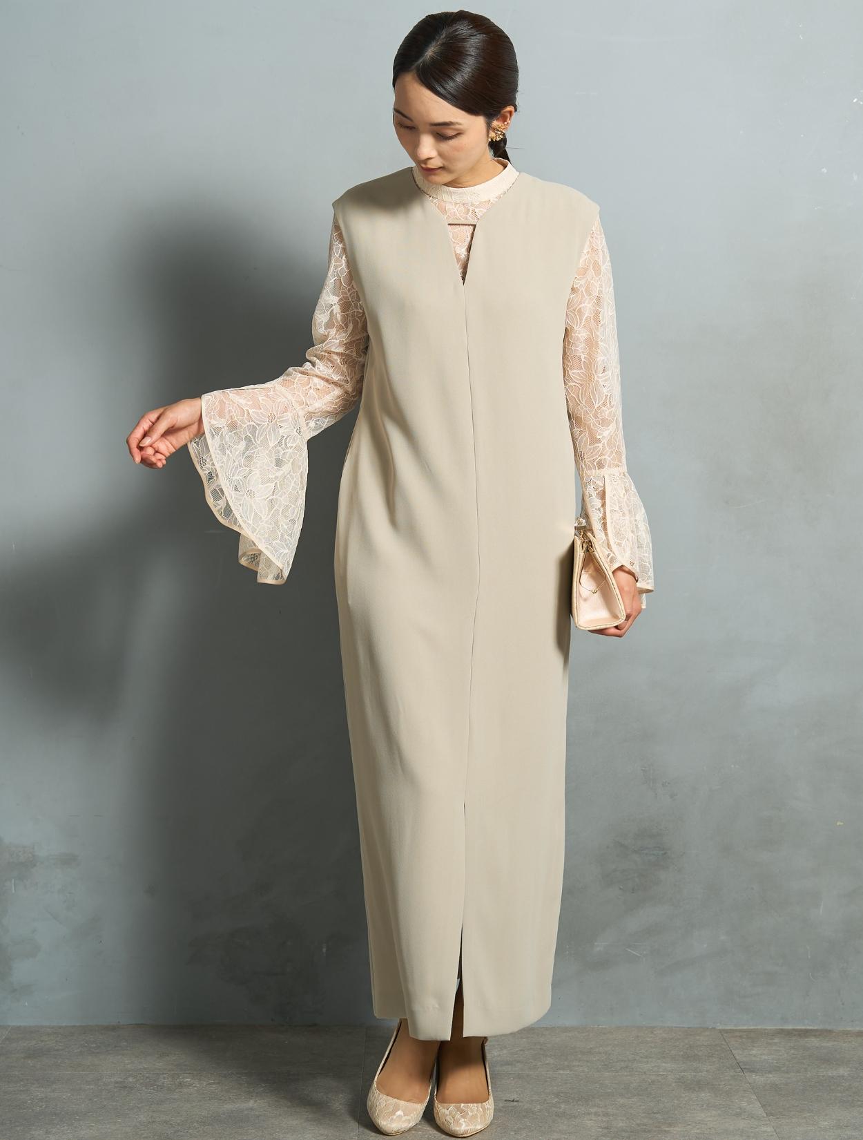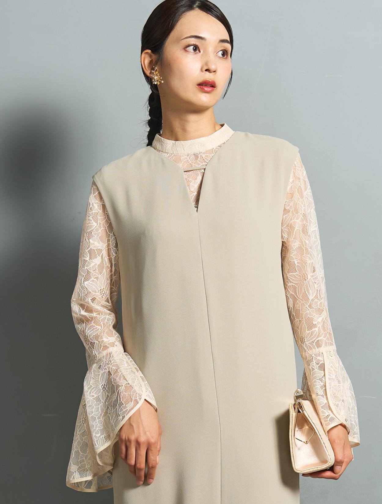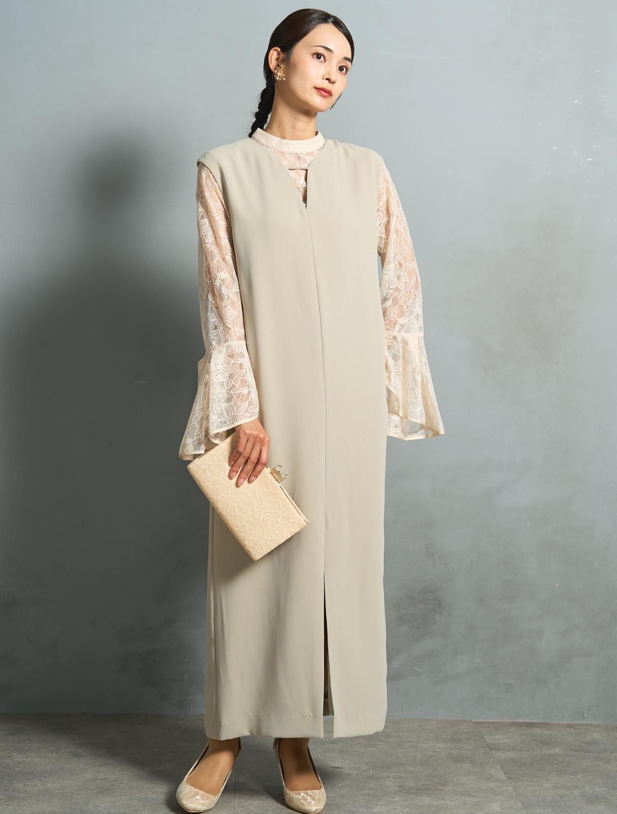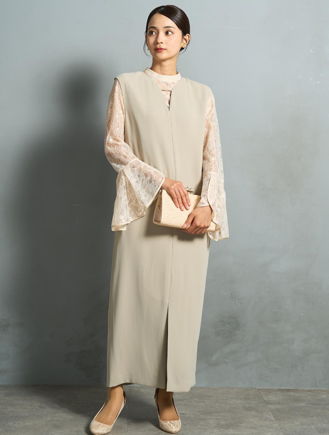 ワンピースは、黄色味の少ないミントベージュのカラーがおしゃれな印象。フェミニンになり過ぎない大人な色です。トレンドのニュアンスカラーで、色被りしにくいのも嬉しいポイント。インナーブラウスは優しい明るさのベージュ。肌なじみが良く上品さが出ます。様々な肌色の方に馴染みやすい配色。