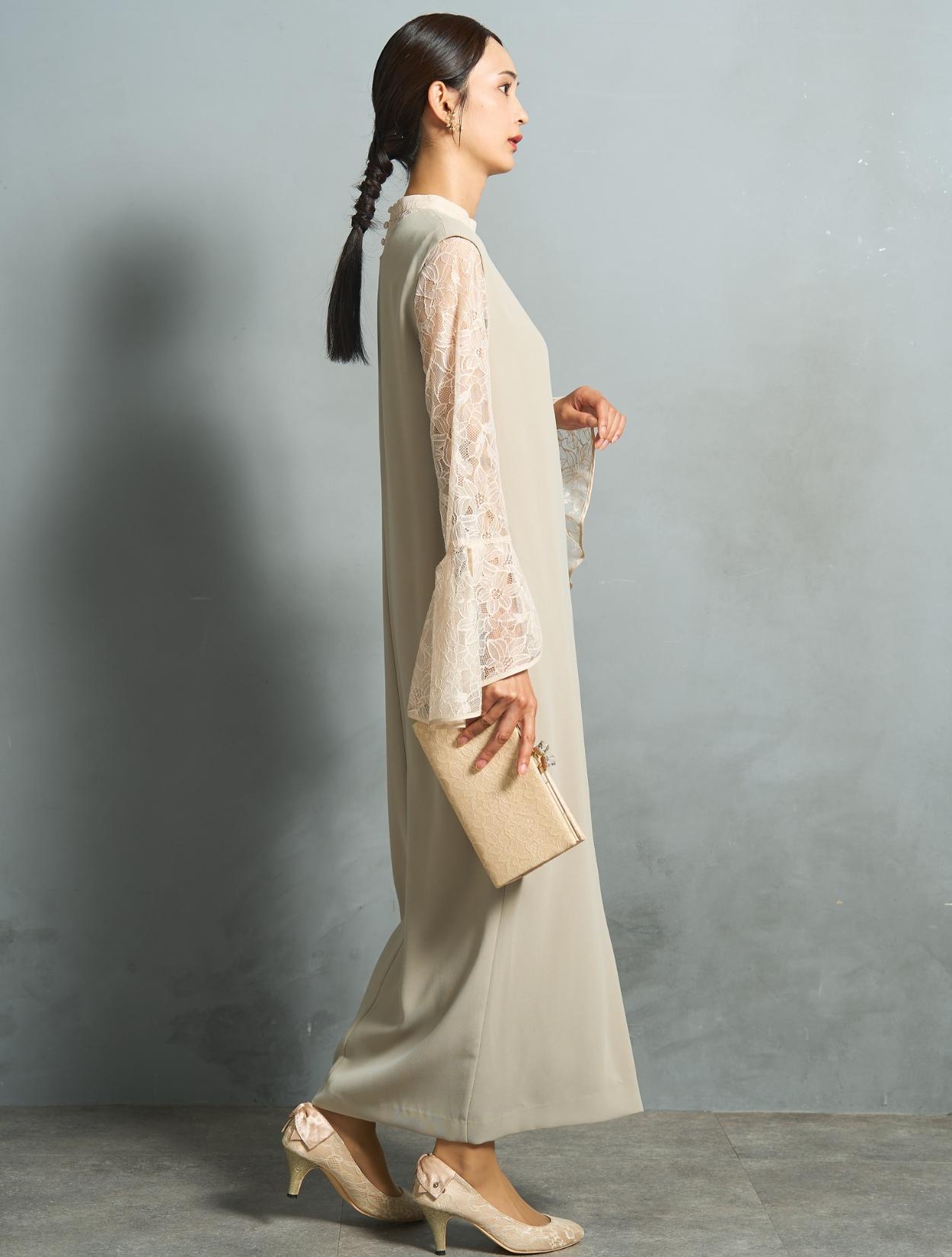 一番目を引くデザインは、何と言っても存在感のあるレースのお袖。どの角度から見ても華やかに広がるベルスリーブが、シンプルなワンピースをドレッシーに見せてくれます。程よく大柄のレースも華やかに見えるポイントです。サテンのパイピングが施された袖口は、細かいディテールで高見えします。