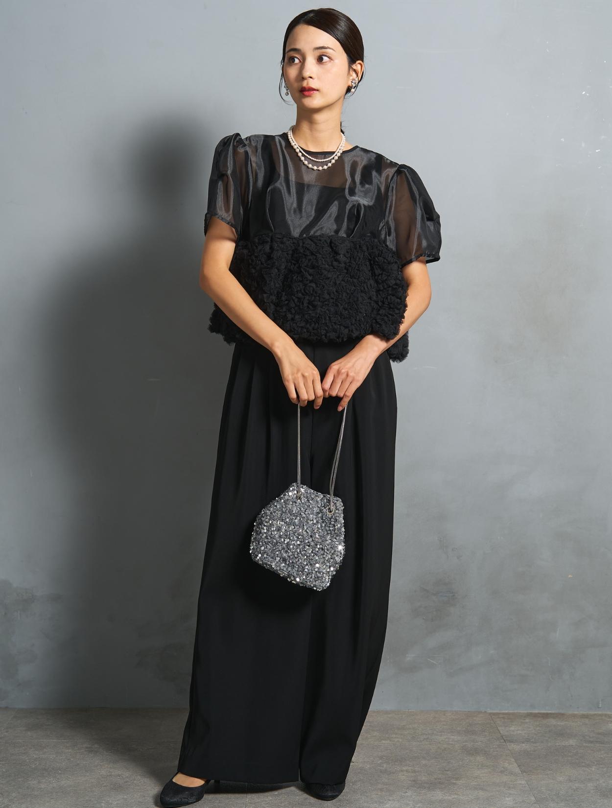 シックなブラックカラーですが、3種類の異なる素材感で立体的な表情が楽しめます。オーガンジーブラウスには光沢があり、ブラックでも地味に見えないおしゃれさがポイントです。
