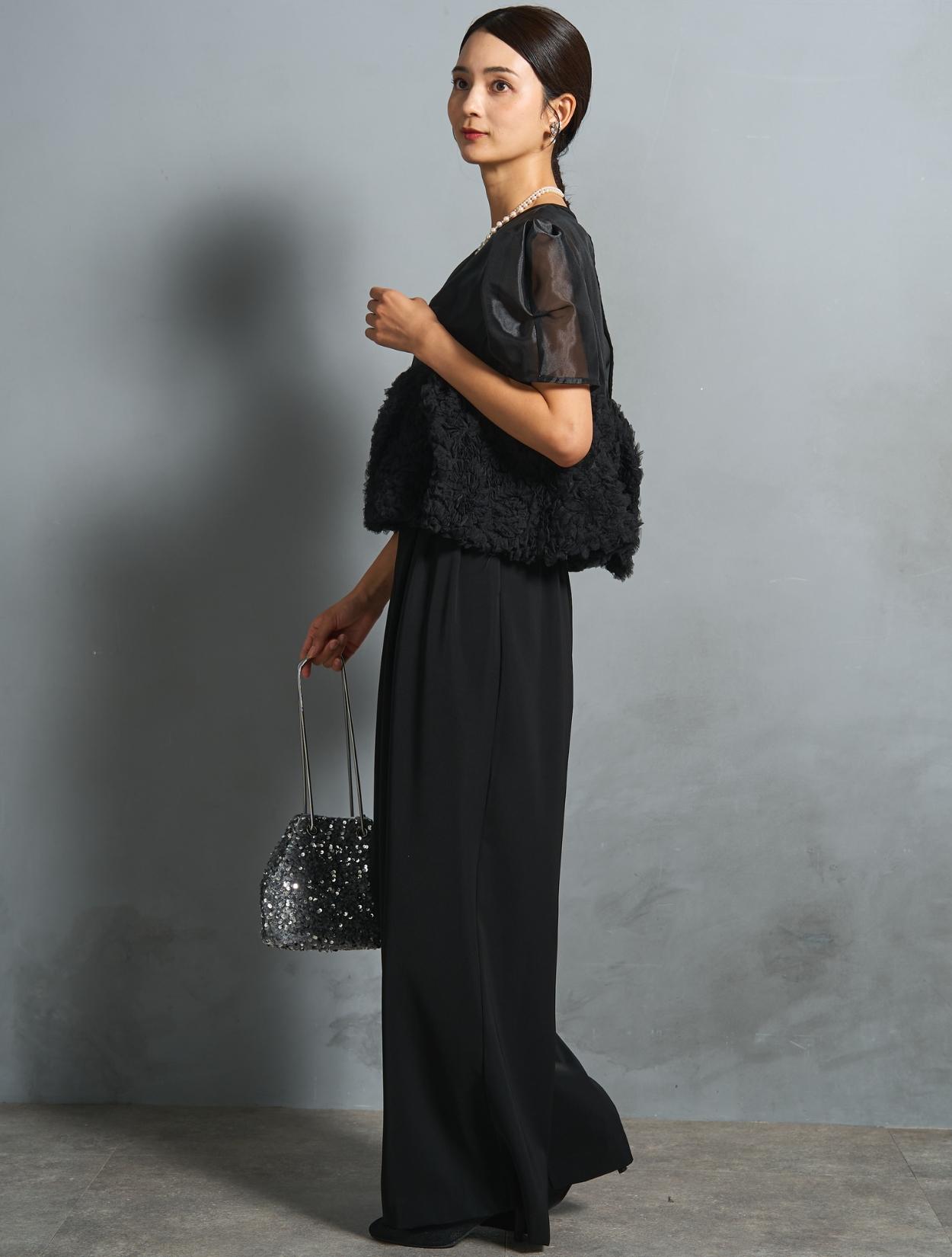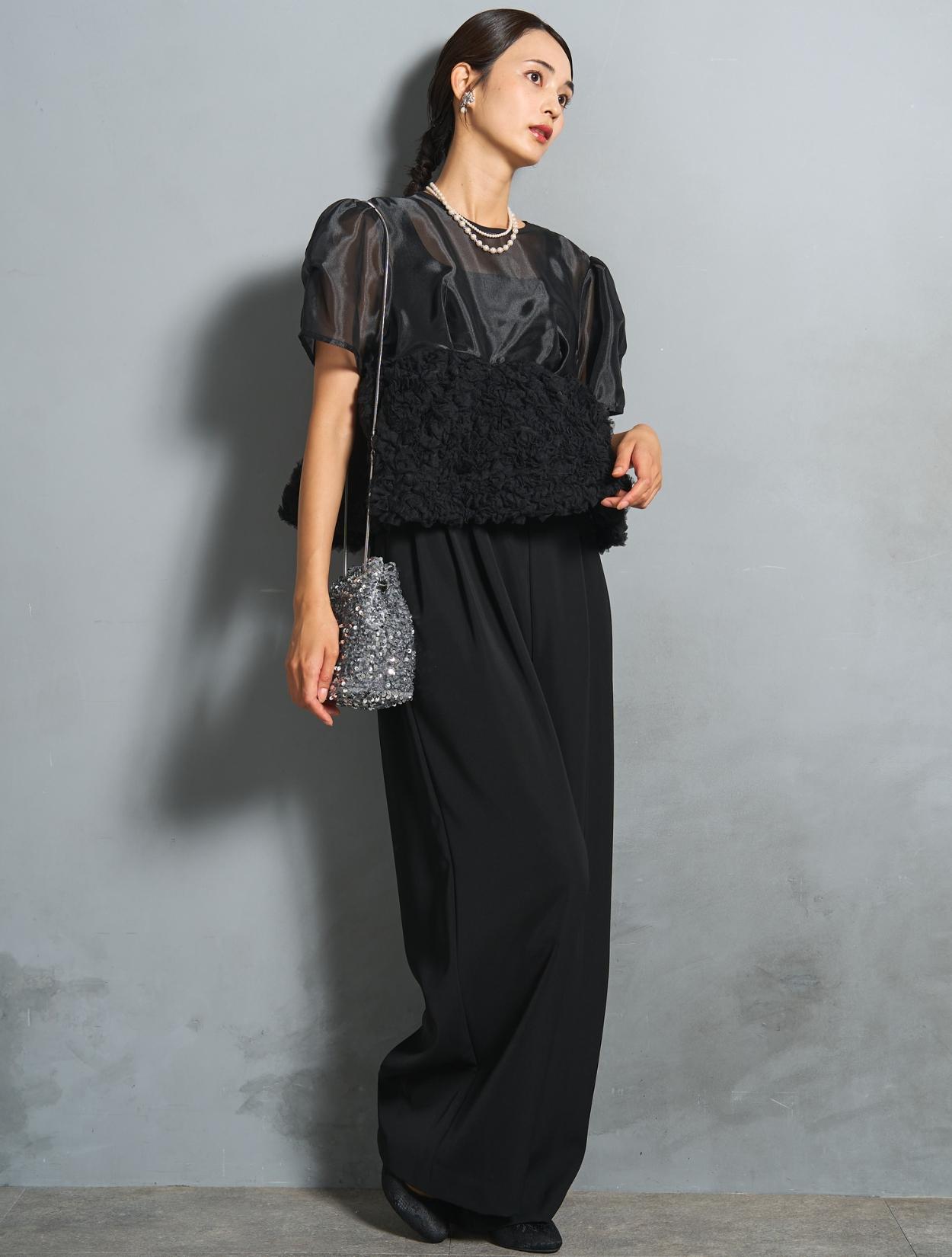 程よい光沢とハリのあるオーガンジーのブラウスが印象的なパンツドレス。バスト下は、チュールのフリル刺繍が凝ったディテール。タックを入れたペプラムは絶妙なボリュームで、むしろ華奢見えするデザインです。オーガンジーの透け感で、ボリュームが重たく見えないのもポイント。パフスリーブも透け感があり、ドロップショルダーが肩幅をカバーしてくれます。
