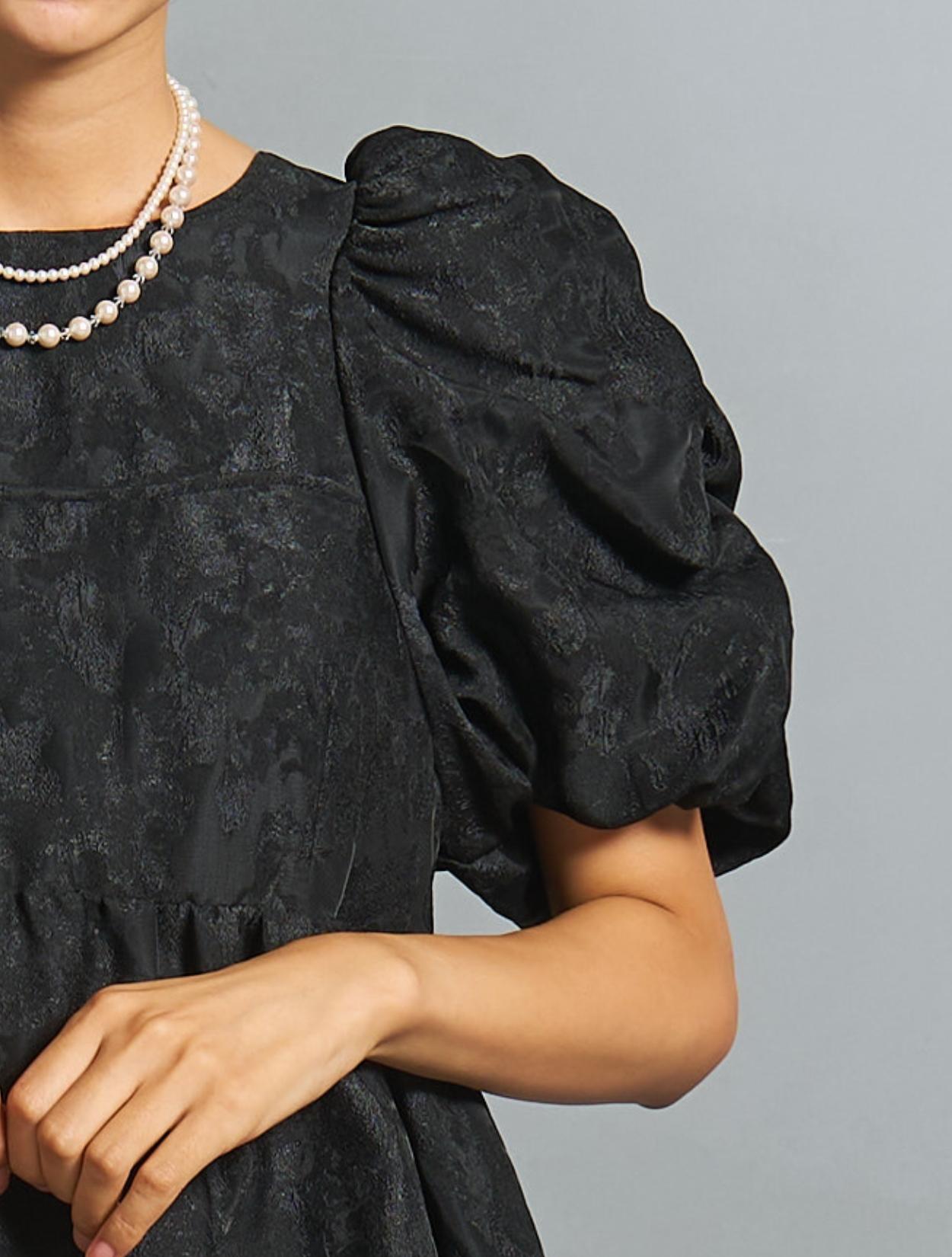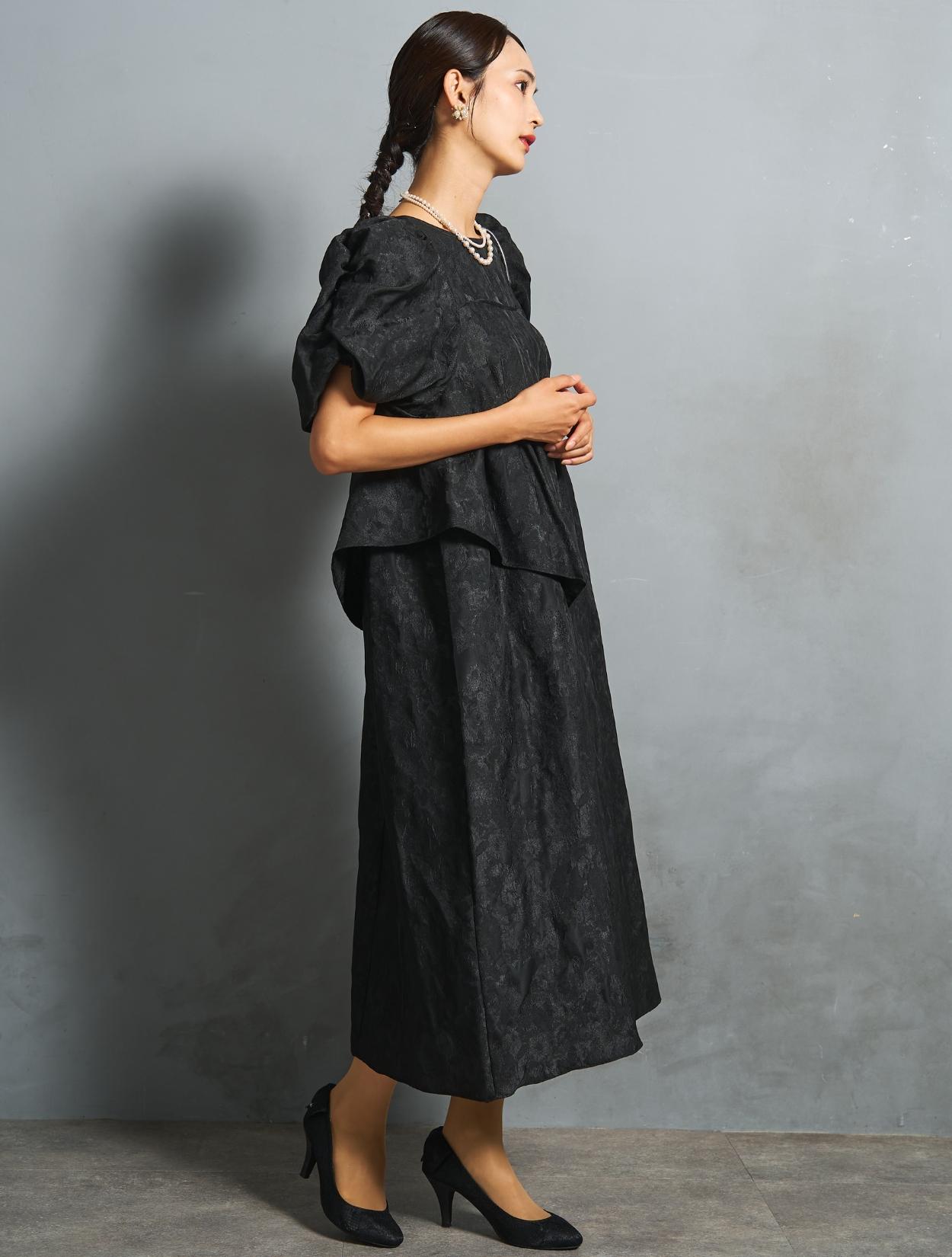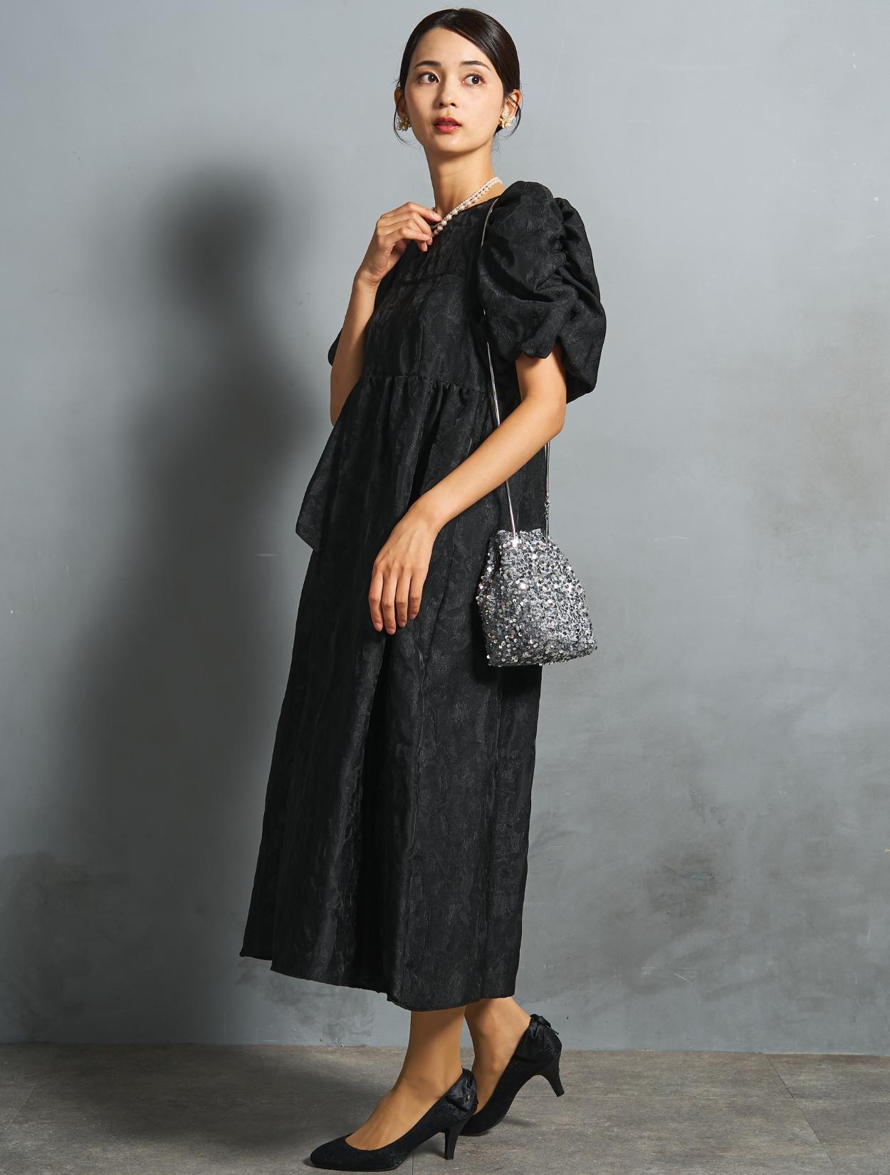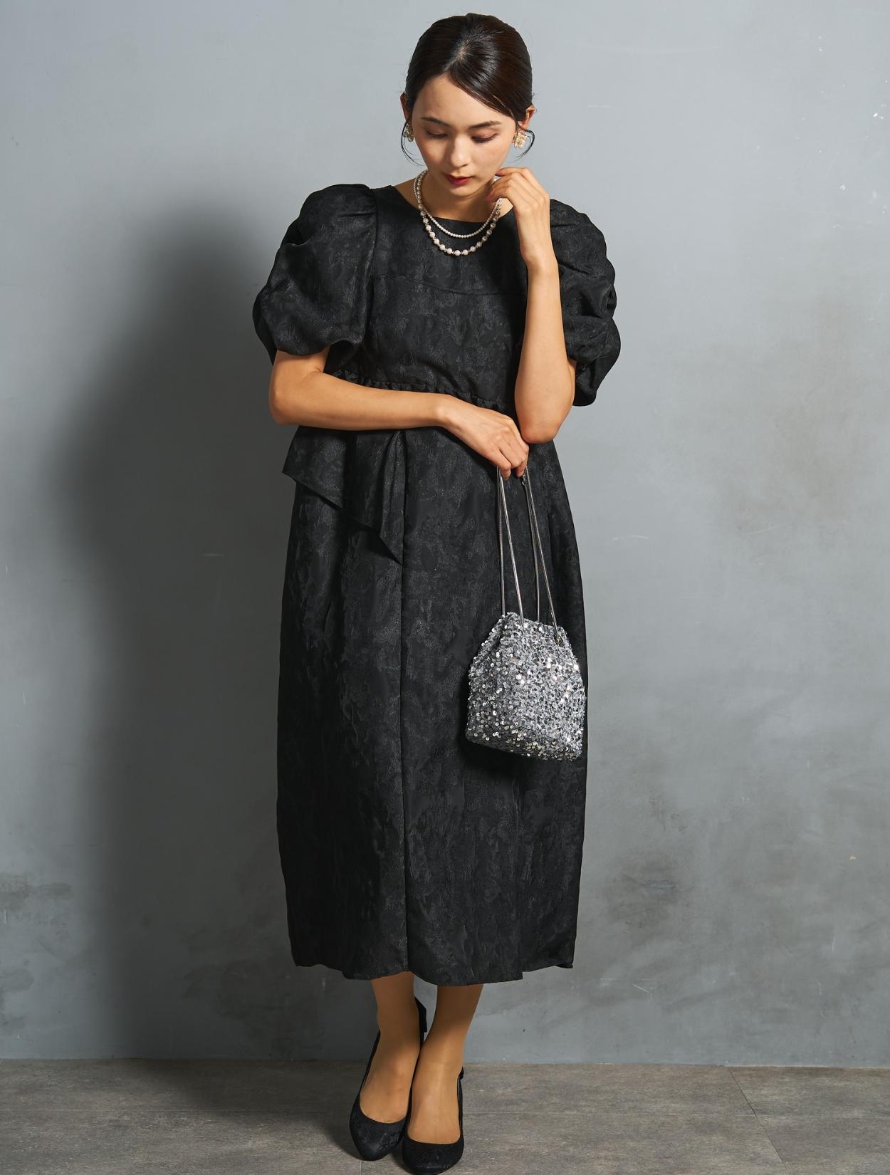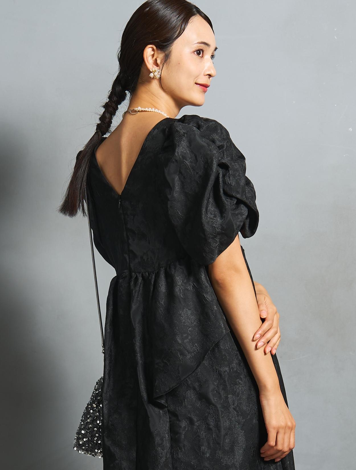 光沢のある糸を織り交ぜた、高級感と立体感のあるジャガード生地がポイントのドレス。上品な生地のフォーマル感と、オーバーシルエットのボリューム感のバランスが絶妙。今っぽくもクラシカルな印象で着こなせます。