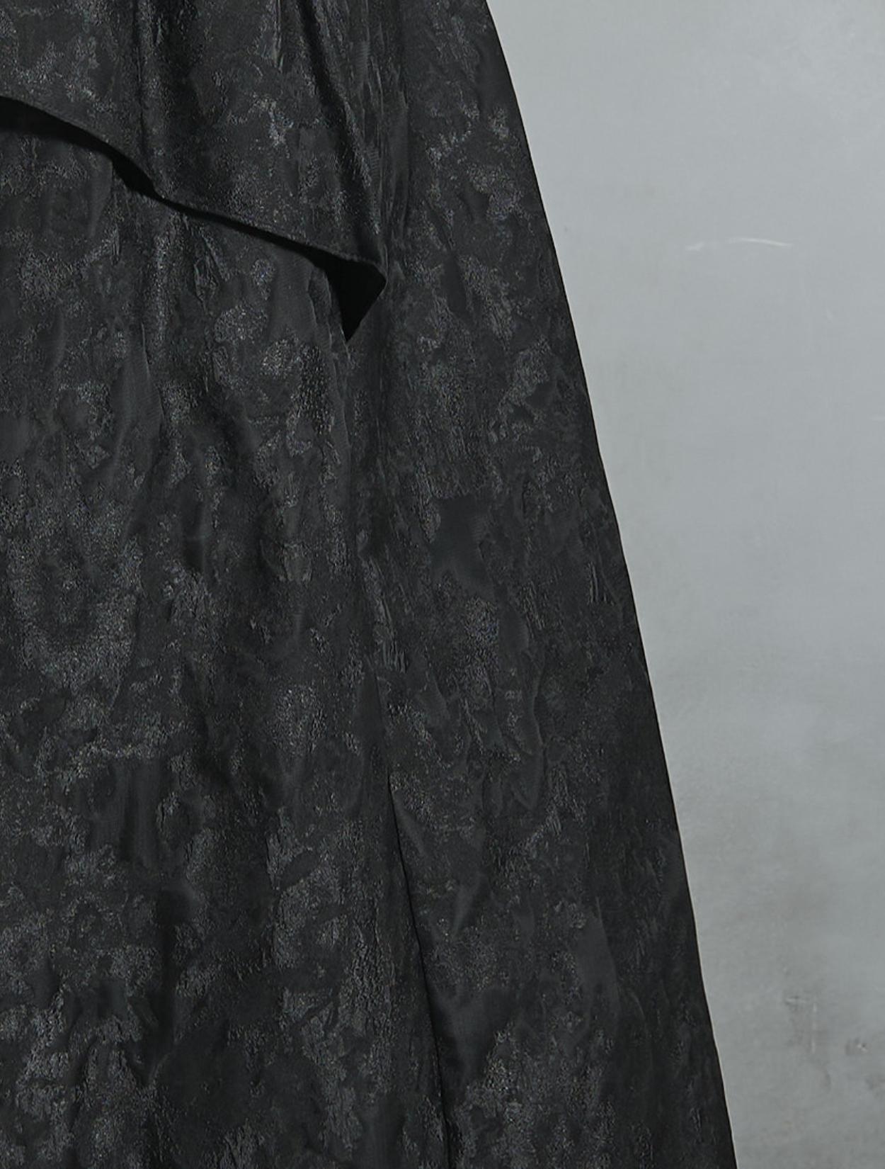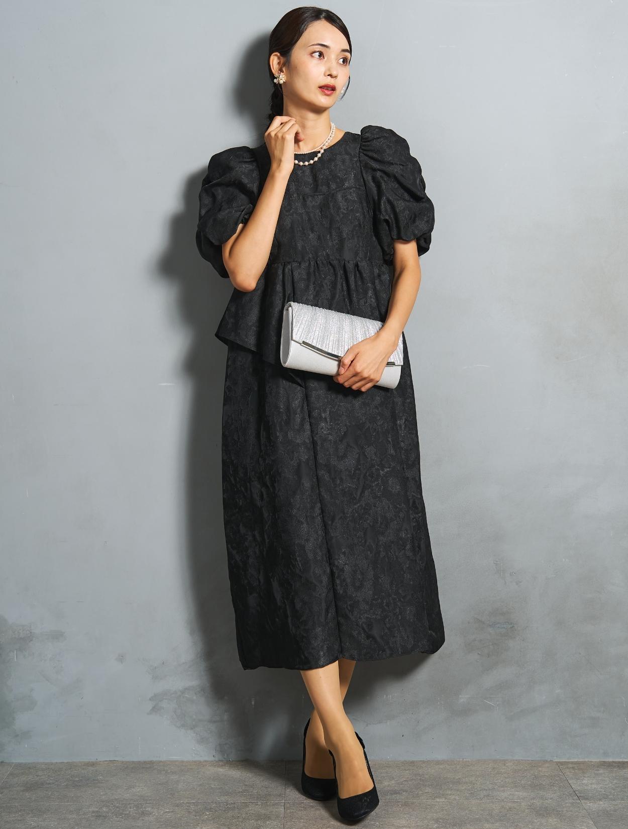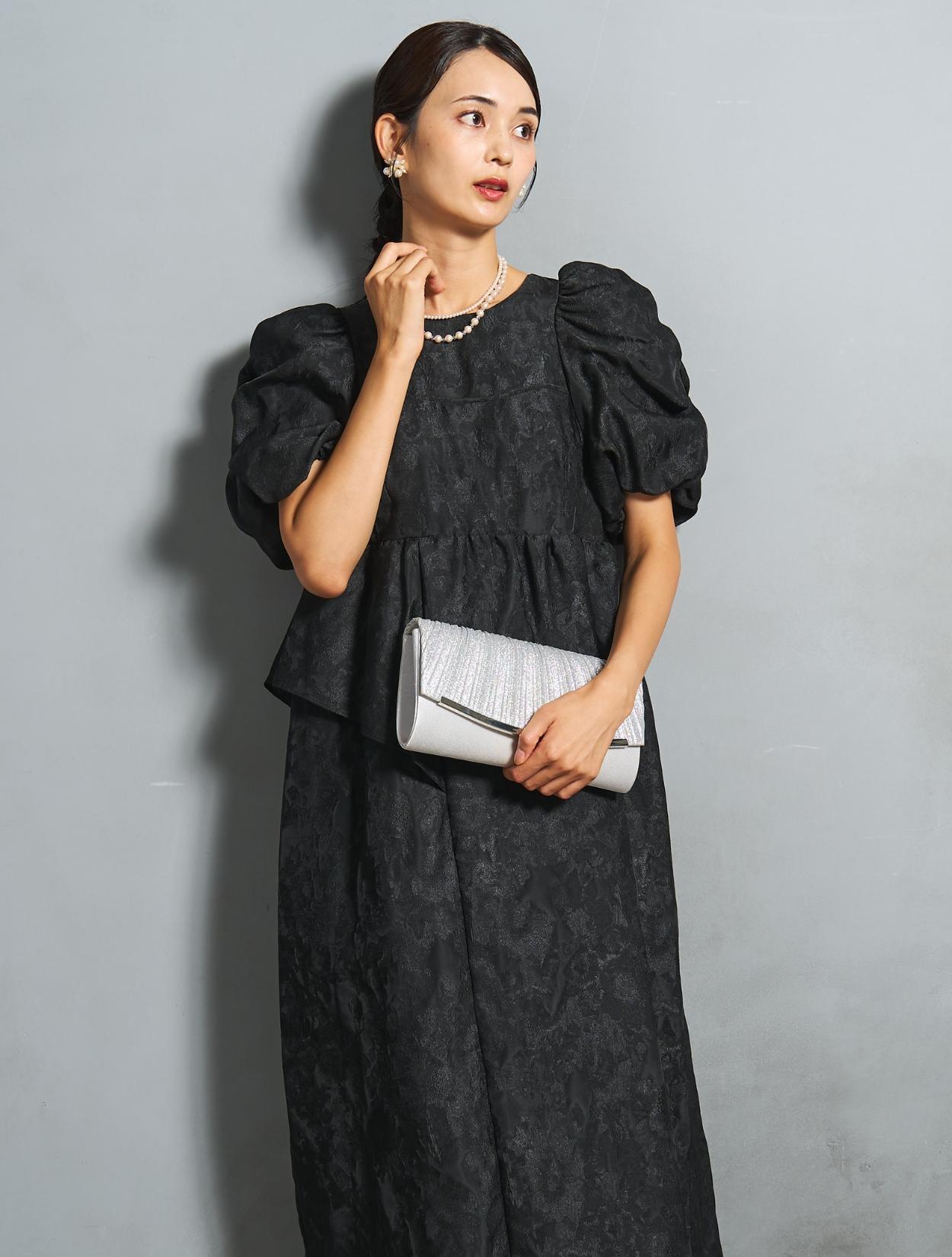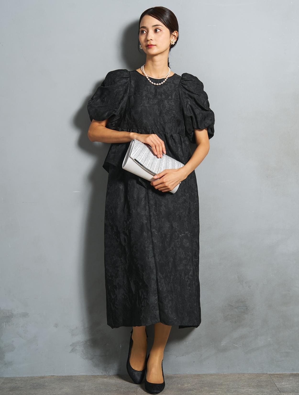 光沢のある糸を織り交ぜた、高級感と立体感のあるジャガード生地がポイントのドレス。上品な生地のフォーマル感と、オーバーシルエットのボリューム感のバランスが絶妙。今っぽくもクラシカルな印象で着こなせます。