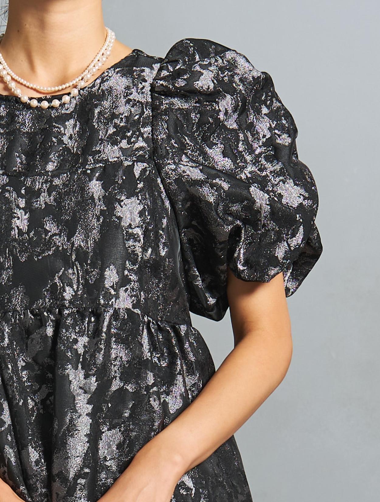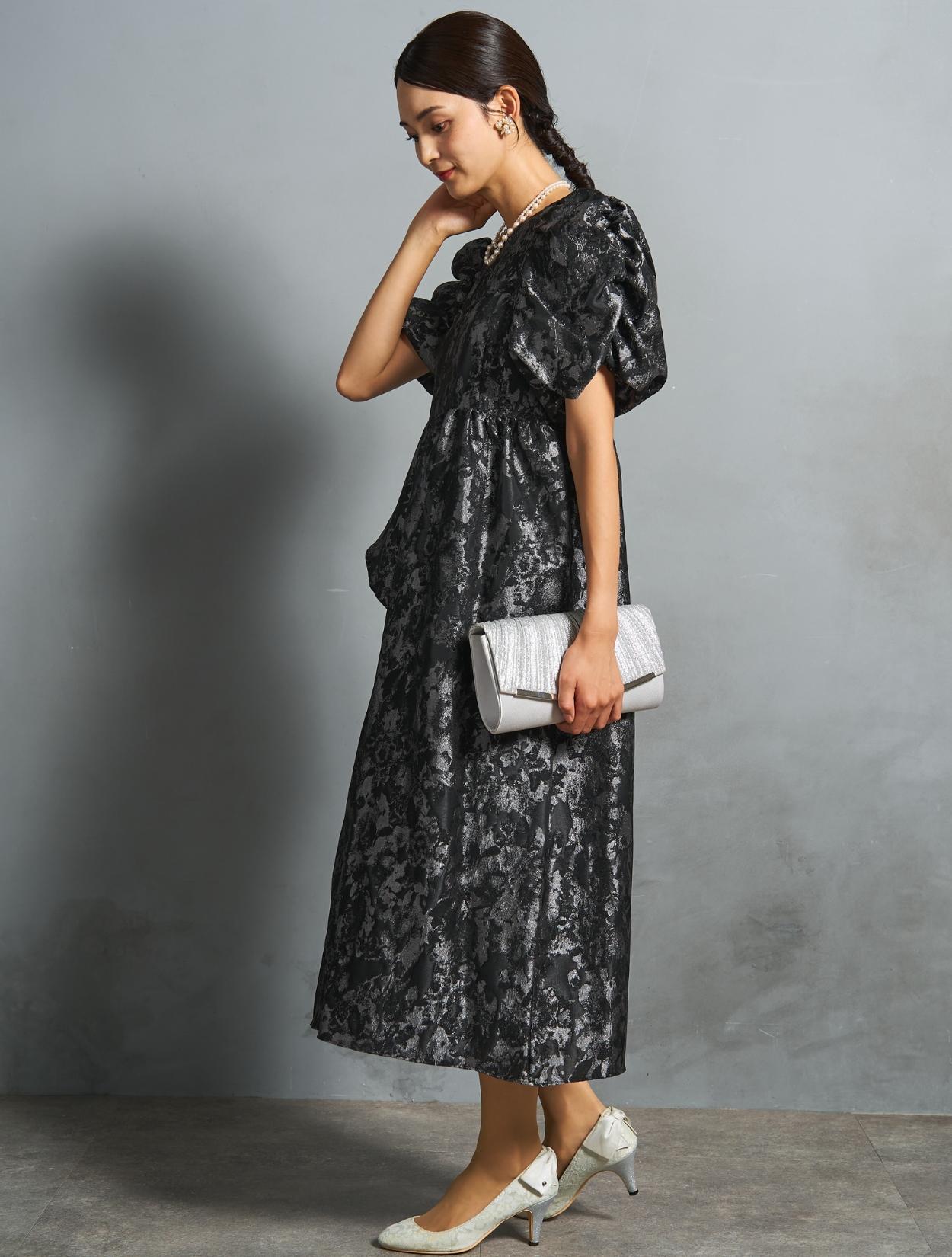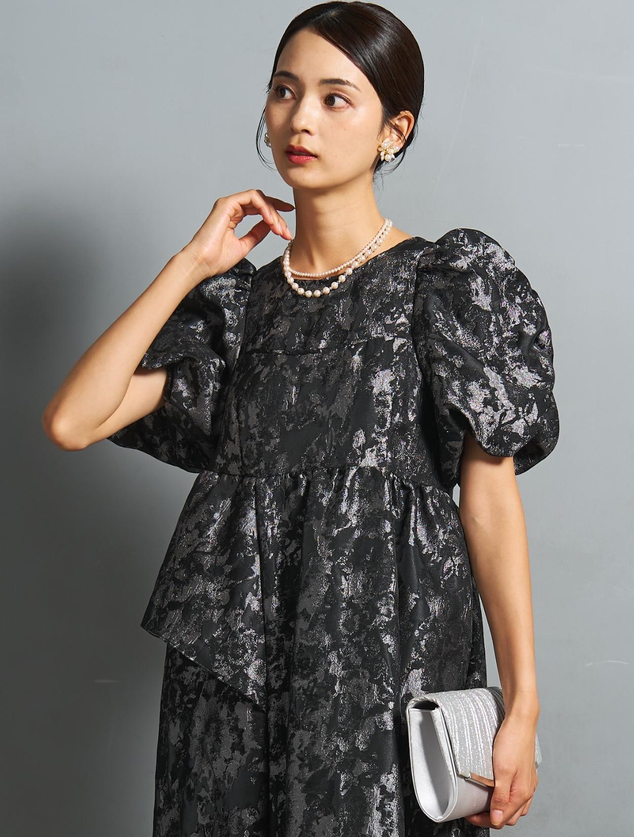 光沢のある糸を織り交ぜた、高級感と立体感のあるジャガード生地がポイントのドレス。上品な生地のフォーマル感と、オーバーシルエットのボリューム感のバランスが絶妙。今っぽくもクラシカルな印象で着こなせます。